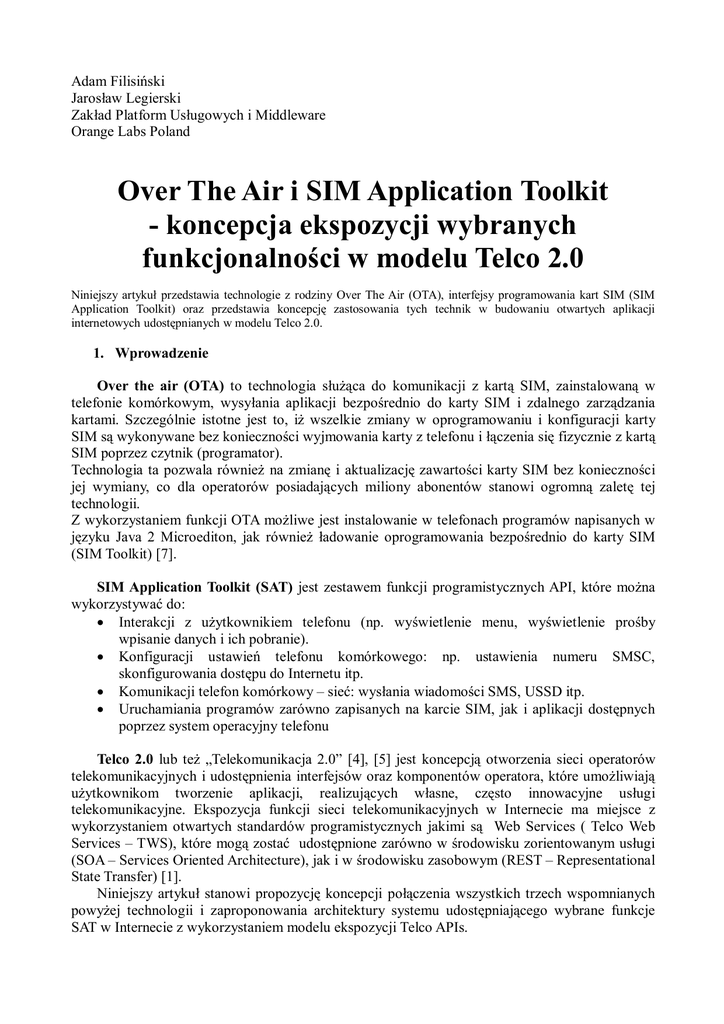 Adam Filisiński Jarosław Legierski Zakład Platform Usługowych i Middleware Orange Labs Poland Over The Air i SIM Application Toolkit - koncepcja ekspozycji wybranych funkcjonalności w modelu Telco 2.0 Niniejszy artykuł przedstawia technologie z rodziny Over The Air (OTA), interfejsy programowania kart SIM (SIM Application Toolkit) oraz przedstawia koncepcję zastosowania tych technik w budowaniu otwartych aplikacji internetowych udostępnianych w modelu Telco 2.0. 1. Wprowadzenie Over the air (OTA) to technologia służąca do komunikacji z kartą SIM, zainstalowaną w telefonie komórkowym, wysyłania aplikacji bezpośrednio do karty SIM i zdalnego zarządzania kartami. Szczególnie istotne jest to, iż wszelkie zmiany w oprogramowaniu i konfiguracji karty SIM są wykonywane bez konieczności wyjmowania karty z telefonu i łączenia się fizycznie z kartą SIM poprzez czytnik (programator). Technologia ta pozwala również na zmianę i aktualizację zawartości karty SIM bez konieczności jej wymiany, co dla operatorów posiadających miliony abonentów stanowi ogromną zaletę tej technologii. Z wykorzystaniem funkcji OTA możliwe jest instalowanie w telefonach programów napisanych w języku Java 2 Microediton, jak również ładowanie oprogramowania bezpośrednio do karty SIM (SIM Toolkit) [7]. SIM Application Toolkit (SAT) jest zestawem funkcji programistycznych API, które można wykorzystywać do: Interakcji z użytkownikiem telefonu (np. wyświetlenie menu, wyświetlenie prośby wpisanie danych i ich pobranie). Konfiguracji ustawień telefonu komórkowego: np. ustawienia numeru SMSC, skonfigurowania dostępu do Internetu itp. Komunikacji telefon komórkowy – sieć: wysłania wiadomości SMS, USSD itp. Uruchamiania programów zarówno zapisanych na karcie SIM, jak i aplikacji dostępnych poprzez system operacyjny telefonu Telco 2.0 lub też „Telekomunikacja 2.0” [4], [5] jest koncepcją otworzenia sieci operatorów telekomunikacyjnych i udostępnienia interfejsów oraz komponentów operatora, które umożliwiają użytkownikom tworzenie aplikacji, realizujących własne, często innowacyjne usługi telekomunikacyjne. Ekspozycja funkcji sieci telekomunikacyjnych w Internecie ma miejsce z wykorzystaniem otwartych standardów programistycznych jakimi są Web Services ( Telco Web Services – TWS), które mogą zostać udostępnione zarówno w środowisku zorientowanym usługi (SOA – Services Oriented Architecture), jak i w środowisku zasobowym (REST – Representational State Transfer) [1]. Niniejszy artykuł stanowi propozycję koncepcji połączenia wszystkich trzech wspomnianych powyżej technologii i zaproponowania architektury systemu udostępniającego wybrane funkcje SAT w Internecie z wykorzystaniem modelu ekspozycji Telco APIs. 2. Over The Air W technologii Over The Air komunikacja pomiędzy serwerem OTA i kartą SIM odbywa się za pomocą specjalnie sformatowanych wiadomości SMS. Wiadomości takie nie są widziane przez użytkownika telefonu, są natomiast identyfikowane przez kartę SIM jako wiadomości specjalne a ich zawartość traktowana jest jako kod wykonywalny. Dostawcy systemów często dokonują podziału technologii Over The Air w zależności od dostarczanych funkcjonalności: Over The Air Service Provisioning (OTASP) – dodawanie, modyfikowanie i wywoływanie usług dostępnych dla użytkownika telefonu komórkowego z wykorzystaniem SIM Application Toolkit. Użytkownik telefonu komórkowego otrzymuje specjalne komunikaty SMS od operatora, umożliwiające aktywację nowych usług na swoim koncie. Over The Air Parameter Administration (OTAPA) - zdalne konfigurowanie danych konfiguracyjnych telefonu, lub zmiany parametrów konfiguracyjnych karty SIM (czasami nawet bez interakcji z użytkownikiem). Firmware Over The Air (FOTA) – zmiana (upgrade) oprogramowania telefonu lub oprogramowania na karcie SIM. Ze względu na fakt, iż pojedyncza wiadomość SMS jest w stanie pomieścić niewielka ilość danych, wysłanie dużych aplikacji do karty SIM jest bardzo czasochłonne. Rys. 1. Ogólny diagram działania technologii Over The Air Na Rys 1. przedstawiono schematycznie sposób działania OTA: Aplikacja korzystając z interfejsów programistycznych gateway'a OTA (np. standardu CORBA – Common Object Request Broker Architecture), wysyła SMS. OTA gateway (np. z wykorzystaniem protokołu SMPP lub UCP) przekazuje wiadomość do SMS Center. Wiadomość SMS z wykorzystaniem SMSC jest dostarczana do telefonu (karty SIM). Dane zawarte w wiadomości są przetwarzane (np. dokonywana jest rekonfiguracja ustawień karty SIM lub telefonu). Technologie Over The Air są standaryzowane np. przez Open Mobile Alliance (OMA), organizację zajmującą się tworzeniem standardów dla urządzeń mobilnych. 3. SIM Application Toolkit SIM Application Toolkit (SAT) jest zestawem funkcji programistycznych API, wbudowanych w karty SIM, które można wykorzystywać min do budowania aplikacji do interakcji z użytkownikiem telefonu i siecią. SAT został ustandaryzowany w dokumencie ETSI TS 11.14. Inna norma ETSI TS 02.19 dostarcza niezależny od języka programowania opis interfejsu SIM Application Toolkit API, natomiast specyfikacja GSM 03.19 łączy opis SAT API z klasami języka Java. W tabelach 1 i 2 zebrano listę komend i zdarzeń SIM Application Toolkit, z których mogą korzystać programiści aplikacji na karty SIM [2]. Komenda DISPLAY TEXT GET INKEY GET INPUT PLAY TONE SETUP MENU SELECT ITEM SET UP IDLE MODE TEXT SEND SHORT MESSAGE SET UP CALL PROVIDE LOCAL INFORMATION SET UP EVENT LIST PERFORM CARD APDU POWER OFF CARD POWER ON CARD GET READER STATUS TIMER MANAGEMENT RUN AT COMMAND SEND DTMF LAUNCH BROWSER OPEN CHANNEL CLOSE CHANNEL RECEIVE DATA SEND DATA GET CHANNEL STATUS MORE TIME POLL INTERVAL POLLING OFF REFRESH SEND SS SEND USSD LANGUAGE NOTIFICATION Opis Wyświetla tekst na ekranie terminala (do 240 B) Funkcja pobierająca informacje o naciśnięcie klawisza