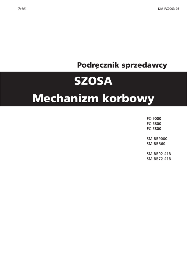 DM-FC0003-03 (Polish) Podręcznik sprzedawcy SZOSA Mechanizm korbowy FC-9000 FC-6800 FC-5800 SM-BB9000 SM-BBR60 SM-BB92-41B SM-BB72-41B WAŻNA INFORMACJA ••Ten podręcznik sprzedawcy jest przeznaczony głównie dla zawodowych mechaników rowerowych. Użytkownicy, którzy nie zostali profesjonalnie przeszkoleni do montażu rowerów, nie powinni samodzielnie zajmować się montażem komponentów, używając tego podręcznika sprzedawcy. Jeśli jakiekolwiek informacje umieszczone w tym podręczniku nie są zrozumiałe, nie należy kontynuować montażu. Aby uzyskać pomoc, należy skontaktować się z punktem sprzedaży lub sprzedawcą roweru. ••Należy przeczytać wszystkie instrukcje obsługi dołączone do produktu. ••Nie wolno demontować ani modyfikować produktu w sposób inny, niż podano w informacjach znajdujących się w tym podręczniku sprzedawcy. ••Wszystkie podręczniki sprzedawcy i instrukcje obsługi można przeglądać w trybie online na naszej stronie internetowej (http://si.shimano.com). ••Należy przestrzegać odpowiednich przepisów i regulacji prawnych danego kraju lub regionu, w którym podmiot prowadzi działalność jako sprzedawca. Ze względów bezpieczeństwa należy dokładnie zapoznać się z niniejszym podręcznikiem sprzedawcy przed użyciem produktu i przestrzegać go podczas jego użytkowania. Poniższe instrukcje muszą być zawsze przestrzegane w celu zapobieżenia obrażeniom oraz uszkodzeniom wyposażenia i otoczenia. Instrukcje zostały sklasyfikowane zgodnie ze stopniem niebezpieczeństwa lub wielkością możliwych szkód, które mogą wynikać z nieprawidłowego użytkowania produktu. NIEBEZPIECZEŃSTWO Niezastosowanie się do podanych instrukcji może skutkować śmiercią albo poważnymi obrażeniami. OSTRZEŻENIE Niezastosowanie się do podanych instrukcji może skutkować śmiercią albo poważnymi obrażeniami. PRZESTROGA Niezastosowanie się do podanych instrukcji może skutkować obrażeniami albo uszkodzeniami wyposażenia i otoczenia. 2 ABY ZAPEWNIĆ BEZPIECZEŃSTWO OSTRZEŻENIE ••Podczas montażu komponentów należy zawsze postępować zgodnie z instrukcjami podanymi w instrukcji obsługi. Zaleca się korzystanie wyłącznie z oryginalnych części Shimano. Jeśli takie części jak śruby i nakrętki poluzują się lub zostaną uszkodzone, może to spowodować nagły upadek z roweru i poważne obrażenia. Ponadto w przypadku nieprawidłowego wykonania regulacji mogą wystąpić problemy, które spowodują nagły upadek z roweru i poważne obrażenia. •• Przed wykonaniem czynności konserwacyjnych, np. wymiany części, należy założyć okulary ochronne, które będą chronić oczy. ••Po uważnym przeczytaniu niniejszego podręcznika sprzedawcy należy zachować go na przyszłość. Należy również upewnić się, że użytkownikom przekazano następujące informacje: •• Długość okresów międzykonserwacyjnych jest uzależniona od sposobu użytkowania oraz warunków, w jakich odbywa się jazda. Łańcuch należy czyścić regularnie, używając odpowiedniego środka do czyszczenia łańcucha. Nigdy nie stosować rozpuszczalników na bazie kwasów ani zasad, takich jak odrdzewiacze. Użycie takiego rozpuszczalnika może spowodować zerwanie łańcucha i w konsekwencji poważne obrażenia. •• Przed jazdą na rowerze sprawdzić, czy ramiona mechanizmu korbowego nie są popękane. Jeżeli pojawią się jakiekolwiek pęknięcia, może dojść do złamania mechanizmu korbowego i upadku z roweru. •• Uważać, aby nie doszło w czasie jazdy do zahaczenia nogawek o łańcuch, ponieważ może to spowodować wywrócenie roweru. •• Sprawdzić, czy łańcuch jest uszkodzony (deformacje lub pęknięcia), czy przeskakuje lub czy występują inne nieprawidłowości, np. samoistna zmiana przełożeń. W przypadku występowania jakichkolwiek problemów należy skontaktować się ze sprzedawcą lub punktem sprzedaży. Łańcuch może pęknąć, powodując upadek rowerzysty. Montaż na rowerze i konserwacja: •• Jeśli wewnętrzna tuleja nie jest zainstalowana prawidłowo, oś może zardzewieć oraz zostać uszkodzona i może dojść do wywrócenia roweru, co może spowodować poważne obrażenia. •• Dwie śruby mocujące ramienia lewego mechanizmu korbowego powinny być dokręcane na przemian i stopniowo; nie należy dokręcać każdej ze śrub całkowicie i jednorazowo. Aby sprawdzić, czy końcowe momenty dokręcenia mieszczą się w zakresie od 12 do 14 Nm należy użyć klucza dynamometrycznego. Następnie, po przejechaniu około 100 km, za pomocą klucza dynamometrycznego sprawdzić momenty dokręcenia. Ważne jest również okresowe sprawdzanie momentów dokręcania. Jeżeli momenty dokręcania są zbyt małe lub jeżeli śruby montażowe nie były dokręcane stopniowo i na przemian, ramię lewego mechanizmu korbowego może spaść i może dojść do wywrócenia roweru, co może spowodować poważne obrażenia. PRZESTROGA Należy również upewnić się, że użytkownikom przekazano następujące informacje: •• Istnieje ryzyko powstania obrażeń spowodowanych przez zęby tarcz.. 3 UWAGA Należy również upewnić się, że użytkownikom przekazano następujące informacje: •• Podczas używania dźwigni przerzutki należy kręcić korbą mechanizmu korbowego. •• Kiedy łańcuch jest w położeniu pokazanym na rysunku, może stykać się z przednią przerzutką i hałasować. Jeżeli problemem jest hałas, przerzucić łańcuch na kolejną, większą zębatkę. Dwurzędowa Przednia tarcza Tylne zębatki •• Przed jazdą na rowerze należy sprawdzić, czy nie ma luzu w połączeniu. Pamiętać również o okresowym dokręcaniu ramion korby i pedałów. •• Do czyszczenia mechanizmu korbowego i osi suportu używać neutralnego środka czyszczącego. Używanie środków zasadowych lub kwasowych może spowodować odbarwienia. •• Jeżeli pedały działają gorzej niż zwykle,