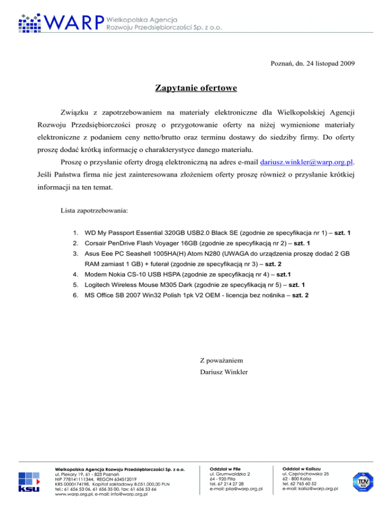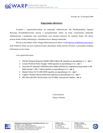 Poznań, dn. 24 listopad 2009 Zapytanie ofertowe Związku z zapotrzebowaniem na materiały elektroniczne dla Wielkopolskiej Agencji Rozwoju Przedsiębiorczości proszę o przygotowanie oferty na niżej wymienione materiały elektroniczne z podaniem ceny netto/brutto oraz terminu dostawy do siedziby firmy. Do oferty proszę dodać krótką informację o charakterystyce danego materiału. Proszę o przysłanie oferty drogą elektroniczną na adres e-mail [email protected]. Jeśli Państwa firma nie jest zainteresowana złożeniem oferty proszę również o przysłanie krótkiej informacji na ten temat. Lista zapotrzebowania: 1. WD My Passport Essential 320GB USB2.0 Black SE (zgodnie ze specyfikacja nr 1) – szt. 1 2. Corsair PenDrive Flash Voyager 16GB (zgodnie ze specyfikacją nr 2) – szt. 1 3. Asus Eee PC Seashell 1005HA(H) Atom N280 (UWAGA do urządzenia proszę dodać 2 GB RAM zamiast 1 GB) + futerał (zgodnie ze specyfikacją nr 3) – szt. 2 4. Modem Nokia CS-10 USB HSPA (zgodnie ze specyfikacją nr 4) – szt.1 5. Logitech Wireless Mouse M305 Dark (zgodnie ze specyfikacją nr 5) – szt. 1 6. MS Office SB 2007 Win32 Polish 1pk V2 OEM - licencja bez no śnika – szt. 2 Z poważaniem Dariusz Winkler Specyfikacja nr 1 Producent : WD Kod producenta: WDBAAA3200ABK-EESN Gwarancja: 2 lata Format szerokości: 2.5 cala Typ: magnetyczny Pojemność: 320.00 GB Interfejs: USB Wersja interfejsu: USB 2.0 Rodzina produktów: My Passport Essential SE Kolor: Black Waga: 200.00 g Specyfikacja nr 2 Producent: Corsair Kod producenta: CMFUSB2.0-16GB Gwarancja: 5 lat Interfejs: USB 2.0 HighSpeed Pojemność: 16 GB Maks. prędkość odczytu: 31.00 MB/s Maks. prędkość zapisu: 12.00 MB/s max Obsługiwane systemy operacyjne: Windows XP/Windows XP x64/Windows 2003/Windows 2000/MacOS X Specyfikacja nr 3 System operacyjny: Oryginalny Windows® XP Home Ekran: 10.1" LED Backlight WSVGA Screen (1024x600) Procesor Intel oraz Chipset: Intel® Atom™ N280 Pamięć: 1GB DDR2 SO-DIMM Łączność bezprzewodowa: WLAN 802.11b/g/n @2.4GHz oraz Bluetooth2.1 + EDR Pamięci dyskowe: 160GB HDD Kamera: 1.3M Pixel / 0.3M Pixel Audio: Hi-Definition Audio CODEC Stereo speaker Digital Array Mic (XP Only) Wejścia / Wyjścia: 1 x VGA Port (D-sub 15-pin for external monitor) 3 x USB 2.0 1 x LAN RJ-45 2 x Audio Jack (Head Phone / Mic-in) Card Reader: MMC/ SD(SDHC) Żywotność baterii: 10.5hrs*, 6-Cell 63Wh Li-ion Battery Wymiary: 262mm(W) x 178mm(D) x 25.9mm~ 36.5mm(H) Waga 1.27Kg (with 6-Cell Battery) Kolory: Black Specyfikacja nr 4 • GSM:850/900/1800/1900 MHz, • Obsługiwane prędkości 7.2/2.0 Mbps, • Wymiary: 87.4 x 26.7 x 13.4 mm, • Waga: 30g, • Złącze:USB 2.0, • Obsługa języka polskiego, • 3G: 850/2100MHz, Specyfikacja nr 5 Producent: Logitech Kod producenta: 910-000941 Gwarancja: 3 lata Typ myszy: optyczna Komunikacja z myszą: bezprzewodowa Komunikacja bezprzewodowa: fale radiowe Rozdzielczość pracy: 1000 dpi Zastosowane technologie: kółko przewijania w 4 kierunkach Profil myszki: dla prawo- i leworęcznych Ergonomiczny kształt: tak Liczba przycisków: 3.00 szt. Rolka przewijania: 1.00 szt. Interfejs: USB Wersja produktu: Kolor: czarny BOX