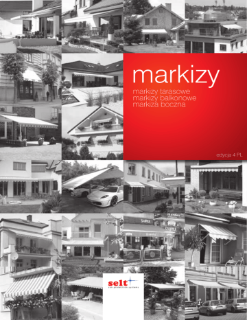 markizy markizy tarasowe markizy balkonowe markiza boczna edycja 4 PL SPIS TREŚCI Casablanca ........................................................................ 4 Corsica ............................................................................... 8 Giant ................................................................................... 12 Malta ................................................................................... 16 Silver Plus ........................................................................... 20 Australia .............................................................................. 24 Jamaica .............................................................................. 28 Palladio ............................................................................... 34 Dakar .................................................................................. 38 Italia ..................................................................................... 42 Italia Poręczowa .................................................................. 46 Italia Kasetowa .................................................................... 50 Bora .................................................................................... 54 markiza tarasowa Casablanca KASETA RURA NAWOJOWA MONTAŻ WYSIĘG średnica 78 mm ściana, sufit, krokiew dachowa 1.6 m; 2.1 m; 2.6 m; 3.1 m; 3.6 m WYSIĘG MAKSYMALNY 3.6 m SZEROKOŚĆ MAKSYMALNA 6.0 m SZEROKOŚĆ MINIMALNA RAMIONA wysięg + 0.4 m rozkładane, aluminiowe, ze sprężynami i łańcuchem płytkowym Flyera, poziomowanie ramion złożonych RAMIONA KRZYŻOWE brak PODPORA TELESKOPOWA brak KĄT POCHYŁU 5° ~ 40° KOLOR KONSTRUKCJI lakier proszkowy: biały, beż, brąz, grafit strukturalny, srebrny POSZYCIE FALBANA NAPĘD RĘCZNY NAPĘD AUTOMATYCZNY 4 tak ponad 100 wzorów brak korba: 1.5 m; 1.8 m; 2.2 m silnik, silnik ze zwijaniem ręcznym, nadajnik zdalnego sterowania, automatyka pogodowa wiatrowo-słoneczna, zalecamy silnik z elektronicznymi krańcówkami Casablanca jest markizą kasetową, która idealnie sprawdza się na większych tarasach. Dzięki swojej budowie markiza ta stanowi nie tylko perfekcyjną osłonę przeciwsłoneczną, ale również estetyczny element dekoracyjny budynku. Trwałość i wytrzymałość systemu zapewnia specjalnie zaprojektowana konstrukcja, która wykonana jest z ekstrudowanego aluminium. Zastosowanie łańcucha Flyera w konstrukcji ramion gwarantuje markizie niezawodną i bezpieczną pracę. Markizy o większej szerokości wyposażone są w podporę rury nawojowej, dzięki czemu tkanina napinana jest bardziej równomiernie. Zastosowanie wewnątrz kasety specjalnych uszczelek zabezpieczających sprawiło, że materiał jest dodatkowo chroniony przed działaniem czynników atmosferycznych. Ponadto odpowiednio dobrane sterowanie elektryczne wraz z automatyką pogodową sprawi, że obsługa markizy Casablanca okaże się bardzo prosta i funkcjonalna. 5 markiza tarasowa Casablanca kolory konstrukcji W procesie lakierowania proszkowego w firmie Selt wykorzystywane są farby renomowanej szwajcarskiej firmy IGP. Dzięki zastosowaniu technologii proszków IGP-DURA®clean powierzchnie lakiernicze są odporne na zabrudzenia i łatwe w utrzymaniu. RAL 9010 RAL 1015 RAL 8014 71319 RAL 9006 Korby i przekładnie są dostępne w kolorach: RAL 9010, RAL 1013, RAL 8017, RAL 7035, RAL 7016. poszycie Wszystkie materiały akrylowe zostały zaimpregnowane środkiem ochronnym TEFLON lub SCOTCHGARD. Stwarza to doskonałą barierę ochronną i wzmacnia właściwości hydrofobowe tkaniny, a ponadto zapobiega przywie-raniu zabrudzeń do materiału. Należy pamiętać, że czynniki takie jak kwaśny deszcz, zanieczyszczenia pochodzenia zwierzęcego oraz czyszczenie materiału za pomocą środków ścierających mogą zniszczyć ochronne pokrycie. LOWICK 6 0 konstrukcja Konstrukcja systemu wykonana jest z ekstrudowanego aluminium. Dodatkowo zastosowano ramiona aluminiowe, które zamocowano na uchwytach wykonanych techniką odlewu ciśnieniowego, co zapewnia wytrzymałość i stabilność systemu. automatyka W naszej ofercie dostępne są rozwiązania wiodących europejskich producentów, w tym: pełna automatyka wiatrowa i słoneczna, silniki sterowane przewodowo lub radiowo oraz przekładnie mechaniczne. 3.6 3.1 2.6 2.1 1.6 montaż 1.6 2.1 426 426 Montaż do krokwi dachowej 325 325 Montaż do sufitu 202 241 241 412 202 202 412 Regulacja kąta nachylenia markizy 300 Montaż do ściany 7 markiza tarasowa Corsica KASETA RURA NAWOJOWA MONTAŻ WYSIĘG średnica 70 mm ściana, sufit, krokiew dachowa 1.6 m; 2.1 m; 2.6 m; 3.1m; 3.6 m WYSIĘG MAKSYMALNY 3.6 m SZEROKOŚĆ MAKSYMALNA 7.0 m SZEROKOŚĆ MINIMALNA RAMIONA wysięg + 0.5 m rozkładane, aluminiowe, ze sprężynami i łańcuchem płytkowym Flyera, poziomowanie ramion złożonych. RAMIONA KRZYŻOWE brak PODPORA TELESKOPOWA brak KĄT POCHYŁU 5° ~ 35° KOLOR KONSTRUKCJI lakier proszkowy: biały, beż, brąz, grafit strukturalny, srebrny POSZYCIE ponad 100 wzorów FALBANA brak NAPĘD RĘCZNY brak NAPĘD AUTOMATYCZNY 8 tak silnik, nadajnik zdalnego sterowania, automatyka pogodowa wiatrowo-słoneczna, zalecamy silnik z elektronicznymi krańcówkami Corsica to markiza kasetowa stworzona z myślą o zacienianiu nowoczesnych tarasów. Konstrukcja systemu wykonana jest z ekstrudowanego aluminium, co zapewnia jej trwałość i wytrzymałość. Dodatkowo zastosowanie w konstrukcji ramion łańcucha Flyera w połączeniu z precyzją wykonania przegubów gwarantuje markizie niezawodne, wieloletnie działanie. Kaseta systemu oparta została na kwadratowej belce nośnej, co przy dużych gabarytach zapewnia stabilność całej konstrukcji, a jednocześnie znacznie ułatwia jej montaż. Budowa markizy przewiduje możliwość zamontowania oświetlenia LED, co sprawia, ze użytkownik będzie mógł swobodnie korzystać z uroków letnich wieczorów. Corsica, dzięki swoim walorom estetycznym, poza 