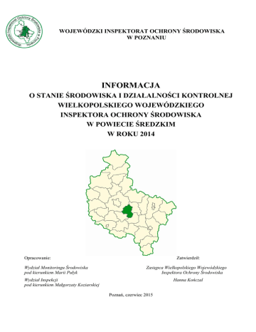 WOJEWÓDZKI INSPEKTORAT OCHRONY ŚRODOWISKA W POZNANIU INFORMACJA O STANIE ŚRODOWISKA I DZIAŁALNOŚCI KONTROLNEJ WIELKOPOLSKIEGO WOJEWÓDZKIEGO INSPEKTORA OCHRONY ŚRODOWISKA W POWIECIE ŚREDZKIM W ROKU 2014 Zatwierdził: Opracowanie: Wydział Monitoringu Środowiska pod kierunkiem Marii Pułyk Zastępca Wielkopolskiego Wojewódzkiego Inspektora Ochrony Środowiska Wydział Inspekcji pod kierunkiem Małgorzaty Koziarskiej Hanna Kończal Poznań, czerwiec 2015 2 SPIS TREŚCI 1. 2. WYBRANE CECHY POWIATU STAN ŚRODOWISKA 2.1. Monitoring jakości powietrza 2.2. Monitoring jakości wód 2.2.1. Monitoring jakości wód powierzchniowych 2.2.2. Monitoring jakości wód podziemnych 2.3. Monitoring jakości gleby i ziemi 2.4. Monitoring hałasu 2.5. Monitoring pól elektromagnetycznych 2.6. Monitoring gospodarki odpadami 2.7. Podsumowanie i wnioski 3. DZIAŁALNOŚĆ KONTROLNA 4. POWAŻNE AWARIE 5. PODSUMOWANIE WYNIKÓW DZIAŁALNOŚCI KONTROLNEJ I POWAŻNYCH AWARII 5 8 8 9 9 12 12 13 13 14 16 19 21 21 3 WPROWADZENIE Opracowanie ma na celu przedstawienie stanu środowiska oraz wyników działalności kontrolnej Wielkopolskiego Wojewódzkiego Inspektora Ochrony Środowiska na terenie powiatu średzkiego w roku 2014. Do jego przygotowania wykorzystano badania własne WIOŚ w Poznaniu, wyniki badań będące w posiadaniu WIOŚ oraz ustalenia z kontroli użytkowników środowiska, prowadzonych przez inspektorów WIOŚ. Bieżące informacje dotyczące stanu środowiska na terenie całego województwa wielkopolskiego znaleźć można na stronie internetowej www.poznan.wios.gov.pl. Zadania w zakresie ochrony przyrody, w tym ustanawianie form ochrony przyrody oraz sprawowanie nadzoru nad przestrzeganiem określonych ustawą zakazów w stosunku do tych form, realizuje Regionalny Konserwator Przyrody. 4 1. WYBRANE CECHY POWIATU Powiat średzki położony jest w centralnej części województwa wielkopolskiego, obejmuje obszar o powierzchni 624 km2, a zamieszkuje go 57156 osób (stan na dzień 31.12.2014, wg GUS). Według podziału fizyczno-geograficznego J. Kondrackiego powiat ten położony jest: – w makroregionie Pojezierze Wielkopolsko-Kujawskie: mezoregion Równina Wrzesińska oraz – w makroregionie Pradolina Warciańsko-Odrzańska: mezoregion Kotlina Śremska. Gospodarka powiatu ma charakter rolniczo-przemysłowy; użytki rolne zajmują około 74% powierzchni. Administracyjnie powiat podzielony jest na: ▪ jedną gminę miejsko-wiejską: Środa Wielkopolska, ▪ cztery gminy wiejskie: Dominowo, Krzykosy, Nowe Miasto nad Wartą, Zaniemyśl. Ponad 93,4% ludności powiatu korzysta z sieci wodociągowej, a 63,9% z sieci kanalizacyjnej (stan na dzień 31 grudnia 2013, dane wg GUS). W ewidencji WIOŚ w Poznaniu znajdują się 62 oczyszczalnie ścieków eksploatowane na terenie powiatu średzkiego. Dane o ilości ścieków komunalnych pochodzą z Wykazów zawierających zbiorcze zestawienia informacji o zakresie korzystania ze środowiska oraz o wysokości należnych opłat. Lp. 1. 2. 3. Dominowo 4. 5. Krzykosy Sulęcinek Nowe Miasto nad Wartą Nowe Miasto nad Wartą 8. 9. Murzynowo Kościelne Giecz Chłapowo Zberki 6. 7. Miejscowość/Eksploatujący Gmina Zaniemyśl Klęka Chocicza Gmina Nowe Miasto nad Wartą Łękno Zakład Gospodarki Komunalnej w Zaniemyślu 10. 11. 12. 13. Babin Bieganowo Brodowo Brzeziny 14. Chwałkowo 15. 16. 17. 18. 19. 20. 21. 22. Środa Wlkp. Środa Urząd Gminy Dominowo Zakład Usług Komunalnych w Dominowie Gmina Krzykosy Gmina Nowe Miasto nad Wartą Gmina Nowe Miasto nad Wartą Koszuty Koszuty Słupia Wielka Starkówiec Trzebisławki Annopole Brzezie Brodowo A Miejskie Przedsiębiorstwo Energetyki Cieplnej Wodociągów i Kanalizacji w Środzie Wielkopolskiej Zakład Gospodarki Komunalnej w Środzie Wlkp. Obszar obsługiwany Murzynowo Kościelne Giecz Dominowo, Chłapowo Zberki Ilość ścieków w roku 2014 /m3/ 8 208 4 024,9 25 655 3 916 cała gmina 53 317 Nowe Miasto 53 166 Klęka, Aleksandrów, Wolica Kozia, Wolica Nowa, Boguszyn (część skanalizowana), Kolniczki, Utrata, Komorze, Teresa, Chocicza Zaniemyśl, Łekno, Jeziory Wielkie, Zwola, Polwica Babin Bieganowo Brodowo Brzeziny Miasto Środa Wlkp., Kijewo (część wsi), Janowo, Dębicz, Mączniki, Chwałkowo (część wsi w pobliżu oczyszczalni) Koszuty Koszuty Słupia Wielka Starkówiec Trzebisławki Annopole Brzezie część Brodowa 67 690 92 162 179 554 1 480 4 326 2 800 1 046 1 555 765 720 14 942 12704 1150 1820 1 266,1 2 214,8 6 966,2 5 Lp. 23. 24. 25. 26. 27. 28. 29. 30. 31. 32. 33. 34. 35. 36. 37. 38. 39. 40. 41. 42. 43. Miejscowość/Eksploatujący Gmina Wlkp. część Brodowa Chocicza Chudzice Chwałkowo Czarne Piątkowo Dębiczek Grójec Januszewo Kijewo Koszuty Huby Marianowo Brodowskie Nadziejewo Nietrzanowo Olszewo Pętkowo Pierzchnica Pierzchno Połażejewo Romanowo Ruszkowo Starkówiec Piątkowski Starkówiec Piątkowski, Czarne Piątkowo Strzeszki Szlachcin Szlachcin Huby Tadeuszewo Tadeuszewo Topola Trzebisławki Ulejno Winna Góra Włostowo Zdziechowice- Pławce Zielniczki Zielniki Żabikowo Żabikowo Brodowo B Chocicza Chudzice Chwałkowo Czarne Piątkowo Dębiczek Grójec Januszewo Kijewo Koszuty Huby Marianowo Brodowskie Nadziejewo Nietrzanowo Olszewo Pętkowo Pierzchnica Pierzchno Połażejewo Romanowo Ruszkowo Starkówiec Piątkowski 44. Starkówiec Piątkowski 45. 46. 47. 48. 49. 50. 51. 52. 53. 54. 55. 56. 57. 58. 59. Strzeszki Szlachcin Szlachcin Huby Tadeuszewo Tadeuszewo Topola Trzebisławki Ulejno Winna Góra Włostowo Zdziechowice- Pławce Zielniczki Zielniki Żabikowo Żabikowo 60. Jarosławiec 61. Kijewo 62. Słupia Wielka Obszar obsługiwany Spółdzielnia Mieszkaniowa Jarosławiec Dusar Industrie Sp. z o.o. Centralny Ośrodek Badania Odmian Roślin Uprawnych Jarosławiec Kijewo Słupia Wielka Ilość ścieków w roku 2014 /m3/ 4 224,3 2 144,7 1 492,4 1 098,3 1 816 2 146,3 722,1 2 984,4 816,3 5 299,6 1 377,6 4 681,9 627,2 2 990,4 5 888,4 587,7 1 368,4 5 016,7 6 850,7 2 593,2 3 556,2 