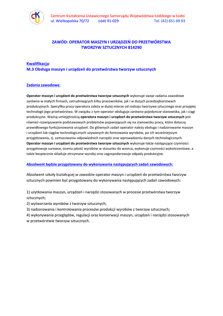 Centrum Kształcenia Ustawicznego Samorządu Województwa Łódzkiego w Łodzi ul. Wielkopolska 70/72 Łódź 91-029 Tel. (42) 651 69 93 ZAWÓD: OPERATOR MASZYN I URZĄDZEŃ DO PRZETWÓRSTWA TWORZYW SZTUCZNYCH 814290 Kwalifikacja: M.3 Obsługa maszyn i urządzeń do przetwórstwa tworzyw sztucznych Zadania zawodowe: Operator maszyn i urządzeń do przetwórstwa tworzyw sztucznych wykonuje swoje zadania zawodowe zarówno w małych firmach, zatrudniających kilku pracowników, jak i w dużych przedsiębiorstwach produkcyjnych. Specyfika pracy operatora zależy w dużej mierze od rodzaju tworzywa sztucznego oraz przyjętej technologii jego przetwórstwa. W związku z tym operator obsługuje zarówno pojedyncze stanowiska, jak i ciągi produkcyjne. Ważną umiejętnością operatora maszyn i urządzeń do przetwórstwa tworzyw sztucznych jest również rozwiązywanie podstawowych problemów pojawiających się na stanowisku pracy, które dotyczą prawidłowego funkcjonowania urządzeń. Do głównych zadań operator należy obsługa i nadzorowanie maszyn i urządzeń lub ciągów technologicznych używanych do formowania wyrobów, po ich wcześniejszym przygotowaniu, tj. zamocowaniu odpowiednich narzędzi oraz wprowadzeniu danych technologicznych. Operator maszyn i urządzeń do przetwórstwa tworzyw sztucznych wykonuje także następujące czynności: przygotowuje surowce, ocenia jakość wyrobów w stosunku do wzorca, wykonuje czynności wykończeniowe, a także bezpiecznie składuje otrzymane wyroby oraz zagospodarowuje odpady produkcyjne. Absolwent będzie przygotowany do wykonywania następujących zadań zawodowych: Absolwent szkoły kształcącej w zawodzie operator maszyn i urządzeń do przetwórstwa tworzyw sztucznych powinien być przygotowany do wykonywania następujących zadań zawodowych: 1) użytkowania maszyn, urządzeń i narzędzi stosowanych w procesie przetwórstwa tworzyw sztucznych; 2) wytwarzania wyrobów z tworzyw sztucznych; 3) nadzorowania i kontrolowania procesów produkcji wyrobów z tworzyw sztucznych; 4) wykonywania przeglądów, regulacji oraz konserwacji maszyn, urządzeń i narzędzi stosowanych w przetwórstwie tworzyw sztucznych.
