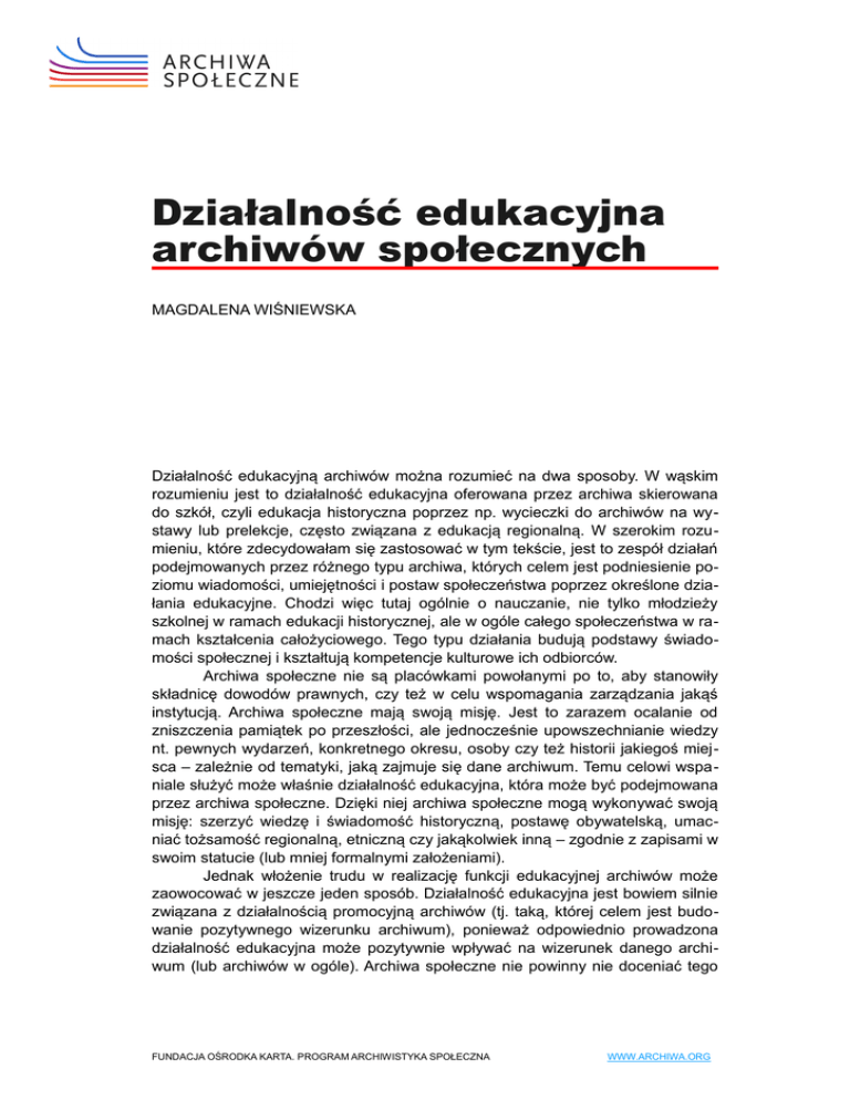 Działalność edukacyjna archiwów społecznych MAGDALENA WIŚNIEWSKA Działalność edukacyjną archiwów można rozumieć na dwa sposoby. W wąskim rozumieniu jest to działalność edukacyjna oferowana przez archiwa skierowana do szkół, czyli edukacja historyczna poprzez np. wycieczki do archiwów na wystawy lub prelekcje, często związana z edukacją regionalną. W szerokim rozumieniu, które zdecydowałam się zastosować w tym tekście, jest to zespół działań podejmowanych przez różnego typu archiwa, których celem jest podniesienie poziomu wiadomości, umiejętności i postaw społeczeństwa poprzez określone działania edukacyjne. Chodzi więc tutaj ogólnie o nauczanie, nie tylko młodzieży szkolnej w ramach edukacji historycznej, ale w ogóle całego społeczeństwa w ramach kształcenia całożyciowego. Tego typu działania budują podstawy świadomości społecznej i kształtują kompetencje kulturowe ich odbiorców. Archiwa społeczne nie są placówkami powołanymi po to, aby stanowiły składnicę dowodów prawnych, czy też w celu wspomagania zarządzania jakąś instytucją. Archiwa społeczne mają swoją misję. Jest to zarazem ocalanie od zniszczenia pamiątek po przeszłości, ale jednocześnie upowszechnianie wiedzy nt. pewnych wydarzeń, konkretnego okresu, osoby czy też historii jakiegoś miejsca – zależnie od tematyki, jaką zajmuje się dane archiwum. Temu celowi wspaniale służyć może właśnie działalność edukacyjna, która może być podejmowana przez archiwa społeczne. Dzięki niej archiwa społeczne mogą wykonywać swoją misję: szerzyć wiedzę i świadomość historyczną, postawę obywatelską, umacniać tożsamość regionalną, etniczną czy jakąkolwiek inną – zgodnie z zapisami w swoim statucie (lub mniej formalnymi założeniami). Jednak włożenie trudu w realizację funkcji edukacyjnej archiwów może zaowocować w jeszcze jeden sposób. Działalność edukacyjna jest bowiem silnie związana z działalnością promocyjną archiwów (tj. taką, której celem jest budowanie pozytywnego wizerunku archiwum), ponieważ odpowiednio prowadzona działalność edukacyjna może pozytywnie wpływać na wizerunek danego archiwum (lub archiwów w ogóle). Archiwa społeczne nie powinny nie doceniać tego FUNDACJA OŚRODKA KARTA. PROGRAM ARCHIWISTYKA SPOŁECZNA WWW.ARCHIWA.ORG 2 faktu. Są one bardziej uzależnione od społeczeństwa niż np. archiwa państwowe, dotowane z budżetu. Potrzebują materiałów archiwalnych przekazywanych im przez ludzi, potrzebują ich pomocy jako wolontariuszy, ich datków pieniężnych na utrzymanie archiwum, czy jakkolwiek inaczej okazywanej pomocy i wsparcia. Ponadto zaangażowanie w ten właśnie sposób w życie społeczności może okazać się bardzo pozytywne dla postrzegania archiwum społecznego przez inne instytucje (np. szkoły, lokalne władze, fundacje, stowarzyszenia...), dzięki czemu łatwiej można zawiązać z nimi współpracę lub uzyskać od nich pomoc (np. w postaci lokalu otrzymanego w dzierżawę od urzędu gminy). Dlatego właśnie działalność edukacyjna, spełniająca przecież funkcje promocyjne, jest w działalności archiwów społecznych istotnym elementem. „Dawcy” i „biorcy” Kto może czy też powinien być odpowiedzialny w archiwum za wypełnianie funkcji edukacyjnej? Zazwyczaj archiwa społeczne nie mogą sobie pozwolić na zatrudnienie kogoś na osobne stanowisko „edukatora archiwalnego”, który najlepiej, aby miał przygotowanie pedagogiczne. Ale bez obaw, nie jest to konieczne. Choć dobrze byłoby, aby tą częścią działalności archiwum zajmowała się konkretna, wyznaczona osoba (lub grupa osób). Ale nie muszą być to koniecznie osoby po kursie pedagogicznym czy mające kierunkowe wykształcenie. Warto jednak, aby był w archiwum od tego jakiś „specjalista”, tj. ktoś, kto czytał i wciąż czyta literaturę, skupia się na tej części działalności archiwum, z czasem zdobywa doświadczenie w tej dziedzinie. Z pomocą przyjść może zarówno literatura z zakresu nauczania, ale też publikacje wydawane dla np. archiwistów czy muzealników, a dotyczące działalności edukacyjnej archiwów i muzeów. Możliwe, że z czasem to ten właśnie specjalista ds. edukacji z archiwum społecznego stanie się jednym z autorów tego typu tekstów. Podsumowując ten krótki wątek: „dawcą” działalności edukacyjnej w archiwum społecznym może być każdy jego pracownik, warto jednak, aby miał pewne przygotowanie teoretyczne (choć niekoniecznie formalne). Kto jest jednak „biorcą”, czy może po prostu odbiorcą działalności edukacyjnej archiwów społecznych? Można wyróżnić kilka większych grup: środowisko nauki, środowisko oświatowe, amatorzy historii, osoby poszukujące dowodów prawnych (w bardzo niewielkim stopniu) oraz wszyscy posiadacze dokumentacji. W przypadku przedstawicieli nauki, będą to zarówno profesjonaliści (uczeni, nauczyciele akademiccy), jak i studenci. Zazwyczaj są oni zaznajomieni z metodami pracy w archiwach, strukturami ich zasobów itd., ale możliwe też, że są przyzwyczajeni do archiwów sieci państwowej, a korzystanie z zasobów archiwów społecznych przysporzy im trudności np. ze względu na inne pomoce archiwalne czy organizację zasobu archiwalnego. Głównie kieruje się edukację do studentów, a nie do nauczycieli akademickich. W tym wypadku pomocą mogą posłużyć takie formy edukacyjne, jak wykłady, prelekcje, pokazy, wystawy, a przede FUNDACJA OŚRODKA KARTA. PROGRAM ARCHIWISTYKA SPOŁECZNA WWW.ARCHIWA.ORG 3 wszystkim praktyki studenckie (o rodzajach form edukacyjnych w dalszej części tekstu). Środowisko oświatowe stanowią nauczyciele, uczniowie oraz animatorzy kulturowi. To właśnie uczniowie najczęściej są odbiorcami działań edukacyjnych przygotowywanych przez archiwa. Ich nauczaniu służą np. wystawy archiwalne (dobrze byłoby wysłać zaproszenia na wystawę do s
