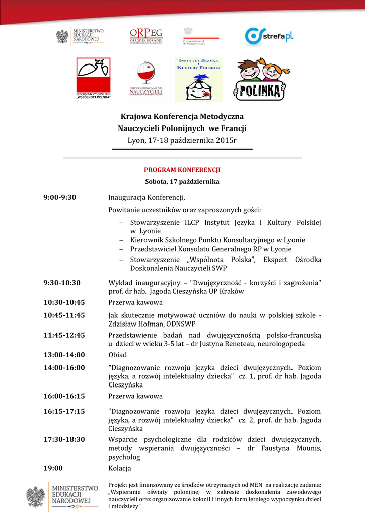 Krajowa Konferencja Metodyczna Nauczycieli Polonijnych we Francji Lyon, 17-18 października 2015r PROGRAM KONFERENCJI Sobota, 17 października 9:00-9:30 Inauguracja Konferencji, Powitanie uczestników oraz zaproszonych gości: Stowarzyszenie ILCP Instytut Języka i Kultury Polskiej w Lyonie Kierownik Szkolnego Punktu Konsultacyjnego w Lyonie Przedstawiciel Konsulatu Generalnego RP w Lyonie Stowarzyszenie „Wspólnota Polska”, Ekspert Ośrodka Doskonalenia Nauczycieli SWP 9:30-10:30 10:30-10:45 10:45-11:45 11:45-12:45 13:00-14:00 Wykład inauguracyjny – "Dwujęzyczność - korzyści i zagrożenia" prof. dr hab. Jagoda Cieszyńska UP Kraków Przerwa kawowa Jak skutecznie motywować uczniów do nauki w polskiej szkole Zdzisław Hofman, ODNSWP Przedstawienie badań nad dwujęzycznością polsko-francuską u dzieci w wieku 3-5 lat – dr Justyna Reneteau, neurologopeda Obiad 14:00-16:00 "Diagnozowanie rozwoju języka dzieci dwujęzycznych. Poziom języka, a rozwój intelektualny dziecka" cz. 1, prof. dr hab. Jagoda Cieszyńska 16:00-16:15 Przerwa kawowa 16:15-17:15 "Diagnozowanie rozwoju języka dzieci dwujęzycznych. Poziom języka, a rozwój intelektualny dziecka" cz. 2, prof. dr hab. Jagoda Cieszyńska Wsparcie psychologiczne dla rodziców dzieci dwujęzycznych, metody wspierania dwujęzyczności – dr Faustyna Mounis, psycholog Kolacja 17:30-18:30 19:00 Projekt jest finansowany ze środków otrzymanych od MEN na realizacje zadania: „Wspieranie oświaty polonijnej w zakresie doskonalenia zawodowego nauczycieli oraz organizowanie kolonii i innych form letniego wypoczynku dzieci i młodzieży” Niedziela, 18 października 7:00-8:00 Śniadanie 8:00-10:00 Warsztaty praktyczne: „Metody aktywizujące w pracy nauczyciela polskiej szkoły” – Zdzisław Hofman, ODNSWP 10:00-10:15 Przerwa kawowa 10:15-11:15 Warsztaty praktyczne: „Metody aktywizujące w pracy nauczyciela polskiej szkoły” – Zdzisław Hofman, ODNSWP 11:30-13:00 „Programowanie języka polskiego jako drugiego i jako obcego” dr hab. Marta Korendo 13:00-14:00 Obiad 14:00-16:00 „Wczesna nauka czytania oraz nauczanie literatury i kultury polskiej” dr hab. Marta Korendo 16:00-16:30 Podsumowanie Konferencji, wręczenie certyfikatów, ewaluacja *Zajęcia prowadzone na zasadach dialogu ze słuchaczami * Organizatorzy informują o możliwości zmiany programu Projekt jest finansowany ze środków otrzymanych od MEN na realizacje zadania: „Wspieranie oświaty polonijnej w zakresie doskonalenia zawodowego nauczycieli oraz organizowanie kolonii i innych form letniego wypoczynku dzieci i młodzieży”