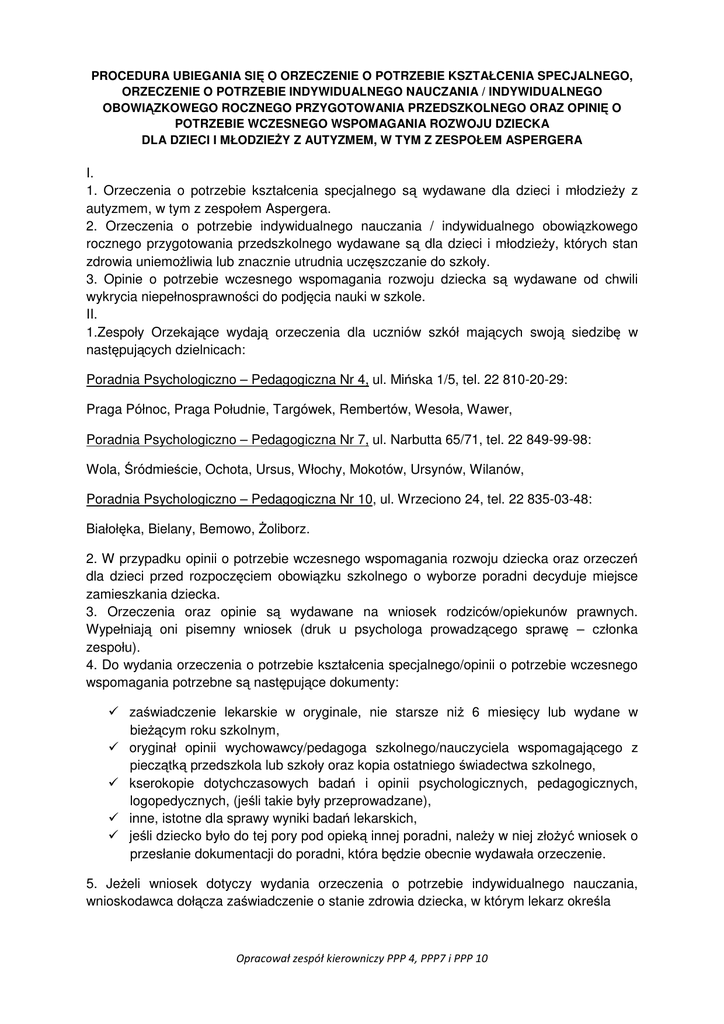 PROCEDURA UBIEGANIA SIĘ O ORZECZENIE O POTRZEBIE KSZTAŁCENIA SPECJALNEGO, ORZECZENIE O POTRZEBIE INDYWIDUALNEGO NAUCZANIA / INDYWIDUALNEGO OBOWIĄZKOWEGO ROCZNEGO PRZYGOTOWANIA PRZEDSZKOLNEGO ORAZ OPINIĘ O POTRZEBIE WCZESNEGO WSPOMAGANIA ROZWOJU DZIECKA DLA DZIECI I MŁODZIEŻY Z AUTYZMEM, W TYM Z ZESPOŁEM ASPERGERA I. 1. Orzeczenia o potrzebie kształcenia specjalnego są wydawane dla dzieci i młodzieży z autyzmem, w tym z zespołem Aspergera. 2. Orzeczenia o potrzebie indywidualnego nauczania / indywidualnego obowiązkowego rocznego przygotowania przedszkolnego wydawane są dla dzieci i młodzieży, których stan zdrowia uniemożliwia lub znacznie utrudnia uczęszczanie do szkoły. 3. Opinie o potrzebie wczesnego wspomagania rozwoju dziecka są wydawane od chwili wykrycia niepełnosprawności do podjęcia nauki w szkole. II. 1.Zespoły Orzekające wydają orzeczenia dla uczniów szkół mających swoją siedzibę w następujących dzielnicach: Poradnia Psychologiczno – Pedagogiczna Nr 4, ul. Mińska 1/5, tel. 22 810-20-29: Praga Północ, Praga Południe, Targówek, Rembertów, Wesoła, Wawer, Poradnia Psychologiczno – Pedagogiczna Nr 7, ul. Narbutta 65/71, tel. 22 849-99-98: Wola, Śródmieście, Ochota, Ursus, Włochy, Mokotów, Ursynów, Wilanów, Poradnia Psychologiczno – Pedagogiczna Nr 10, ul. Wrzeciono 24, tel. 22 835-03-48: Białołęka, Bielany, Bemowo, Żoliborz. 2. W przypadku opinii o potrzebie wczesnego wspomagania rozwoju dziecka oraz orzeczeń dla dzieci przed rozpoczęciem obowiązku szkolnego o wyborze poradni decyduje miejsce zamieszkania dziecka. 3. Orzeczenia oraz opinie są wydawane na wniosek rodziców/opiekunów prawnych. Wypełniają oni pisemny wniosek (druk u psychologa prowadzącego sprawę – członka zespołu). 4. Do wydania orzeczenia o potrzebie kształcenia specjalnego/opinii o potrzebie wczesnego wspomagania potrzebne są następujące dokumenty: zaświadczenie lekarskie w oryginale, nie starsze niż 6 miesięcy lub wydane w bieżącym roku szkolnym, oryginał opinii wychowawcy/pedagoga szkolnego/nauczyciela wspomagającego z pieczątką przedszkola lub szkoły oraz kopia ostatniego świadectwa szkolnego, kserokopie dotychczasowych badań i opinii psychologicznych, pedagogicznych, logopedycznych, (jeśli takie były przeprowadzane), inne, istotne dla sprawy wyniki badań lekarskich, jeśli dziecko było do tej pory pod opieką innej poradni, należy w niej złożyć wniosek o przesłanie dokumentacji do poradni, która będzie obecnie wydawała orzeczenie. 5. Jeżeli wniosek dotyczy wydania orzeczenia o potrzebie indywidualnego nauczania, wnioskodawca dołącza zaświadczenie o stanie zdrowia dziecka, w którym lekarz określa Opracował zespół kierowniczy PPP 4, PPP7 i PPP 10 okres – nie krótszy jednak niż 30 dni, w którym stan zdrowia dziecka uniemożliwia lub znacznie utrudnia uczęszczanie do przedszkola lub szkoły, rozpoznanie i przebieg choroby, objawy towarzyszące, zakres, w jakim dziecko, któremu stan zdrowia znacznie utrudnia uczęszczanie do placówki, może brać udział w zajęciach organizowanych z grupą wychowawczą lub indywidualnie w odrębnym pomieszczeniu na terenie szkoły, w przypadku ucznia szkoły prowadzącej kształcenie w zawodzie dołącza się do wniosku zaświadczenie o możliwości dalszej praktycznej nauki zawodu, wydane przez lekarza medycyny pracy. 6. Rodzic/opiekun prawny wraz z dzieckiem i wyżej wymienioną dokumentacją zgłasza się na wizytę w terminie wcześniej ustalonym osobiście lub telefonicznie w sekretariacie poradni. 7. Jeśli dziecko nie posiada aktualnych badań psychologicznych, pedagogicznych i logopedycznych badania te prowadzone są w poradni w trakcie kolejnych wizyt diagnostycznych. 8. Zespół może zasięgnąć opinii nauczycieli i wychowawcy klasy ze szkoły/przedszkola, do którego uczęszcza dziecko, informując o tym wnioskodawcę. 9. Orzeczenie albo opinia przygotowywana jest w terminie 14 dni od dnia posiedzenia zespołu. III. 1. W przypadku nieuwzględnienia wniosku o wydanie orzeczenia zespół wydaje orzeczenie o braku potrzeby kształcenia specjalnego lub indywidualnego nauczania/ obowiązkowego rocznego przygotowania przedszkolnego. 2. Od orzeczenia wnioskodawca może wnieść odwołanie do kuratora oświaty za pośrednictwem zespołu, który wydał orzeczenie w terminie 14 dni od jego otrzymania. 3. Jeżeli zespół uzna, że odwołanie zasługuje na uwzględnienie, uchyla wydane orzeczenie i wydaje nowe. 4. Jeżeli zespół nie uwzględni odwołania, przesyła je wraz z aktami sprawy kuratorowi oświaty w terminie 14 dni od dnia, w którym otrzymał odwołanie. IV. 1. Kształcenie specjalne może być realizowane w przedszkolu ogólnodostępnym, w przedszkolu integracyjnym lub oddziale integracyjnym, przedszkolu specjalnym lub oddziale specjalnym, szkole ogólnodostępnej, szkole integracyjnej lub oddziale integracyjnym, szkole specjalnej lub oddziale specjalnym. 2. Poradnia nie ma możliwości zapewnienia dziecku miejsca w placówce. Wybór placówki i starania o przyjęcie do niej należą wyłącznie do rodziców. 3. O przyjęciu dziecka, na wniosek rodziców lub prawnych opiekunów, do konkretnego przedszkola, szkoły lub placówki decyduje jej dyrektor. 4. Odpowiednią formę kształcenia dzieciom z orzeczeniami o potrzebie kształcenia specjalnego zapewnia: - w przypadku przedszkoli oraz oddziałów integracyjnych i ogólnodostępnych we wszystkich typach szkół – dzielnica m.st. Warszawy, - w przypadku szkół i placówek specjalnych – Biuro Edukacji. Podstawa prawna: Rozporządzenie MEN z dnia 18 września 2008 r. w sprawie orzeczeń i opinii wydawanych przez zespoły orzekające w publicznych poradniach psychologiczno – pedagogicznych (Dz. U. z 2008 r. Nr 173, poz. 1072). Opracował zespół kierowniczy PPP 4, PPP7 i PPP 10