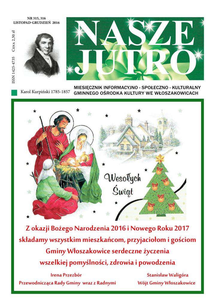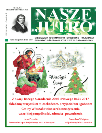 ISSN 1425-4735 Cena 2,50 zł NR 315, 316 Listopad-grudzień 2016 NASZE JUTRO MIESIĘCZNIK INFORMACYJNO - SPOŁECZNO - KULTURALNY Karol Kurpiński 1785-1857 GMINNEGO OŚRODKA KULTURY WE WŁOSZAKOWICACH Z okazji Bożego Narodzenia 2016 i Nowego Roku 2017 składamy wszystkim mieszkańcom, przyjaciołom i gościom Gminy Włoszakowice serdeczne życzenia wszelkiej pomyślności, zdrowia i powodzenia Irena Przezbór Przewodnicząca Rady Gminy wraz z Radnymi Stanisław Waligóra Wójt Gminy Włoszakowice OGŁOSZENIA www.wloszakowice.pl Zarząd Stowarzyszenia Koło Gminne Emerytów Rencistów i Inwalidów we Włoszakowicach życzy Nasze Jutro str. 3 PODZIĘKOWANIE Składam serdeczne podziękowanie wszystkim członkom Stowarzyszenia oraz Panu Stanisławowi Waligórze władzom i pracownikom Gminy Włoszakowice Wójtowi Gminy Włoszakowice zdrowych, spokojnych i radosnych Świąt Bożego Narodzenia oraz wszelkiej pomyślności w Nowym Roku Członkiniom Kół Gospodyń Wiejskich i Członkom Kółek Rolniczych Gminy Włoszakowice serdeczne życzenia radosnych doznań z okazji Świąt Bożego Narodzenia i wszystkiego najlepszego w Nowym 2017 Roku za pamięć i złożone mi życzenia z okazji moich 80. urodzin Andrzej Stankowiak Kochanym Rodzicom składa w imieniu Zarządu i Rady Gminnego ZRK i OR we Włoszakowicach Prezes Zarządu Stanisław Skorupiński Zapraszam mieszkańców Gminy Włoszakowice na Powitanie Nowego 2017 Roku 31 grudnia 2016 r. od godz. 23.30 przy pałacu we Włoszakowicach W programie: * występy artystyczne * wystąpienie noworoczne Wójta * pokaz ogni sztucznych * wspólna zabawa na wolnym powietrzu Wójt Gminy Włoszakowice Obecność dzieci niepełnoletnich tylko pod nadzorem osób dorosłych. Zabrania się przynoszenia i puszczania petard na własną rękę Danucie i Włodzimierzowi Kaminiarzom z okazji 40 rocznicy ślubu najszczersze gratulacje oraz życzenia, by działo się tylko to, co najlepsze, a szczęście rozkwitało na Waszej wspólnej drodze składają: Córka Anna z Rodziną Serdeczne podziękowanie rodzinie, sąsiadom, znajomym, przyjaciołom za pamięć, życzenia, kwiaty i prezenty oraz wiele ciepłych i dobrych słów, które otrzymaliśmy z okazji 40-lecia naszego ślubu składają Elżbieta i Marian Marcinkowscy str. 4 Nasze Jutro INFORMACJE www.wloszakowice.pl Gminny Zakład Komunalny sp. z o.o. informuje Gminny Zakład Komunalny sp. z o.o. we Włoszakowicach działając na podstawie art. 24 ust. 9 ustawy z dnia 7 czerwca 2001 r. o zbiorowym zaopatrzenia w wodę i zbiorowym odprowadzaniu ścieków (tekst jednolity: Dz. U. z 2015 r. poz. 139 ze zmianami) OGŁASZA taryfy za zbiorowe zaopatrzenie w wodę i zbiorowe odprowadzanie ścieków na terenie gminy Włoszakowice na okres od 1 stycznia 2017 r. do 31 grudnia 2017 r. 1. Wysokość cen i stawek opłat za dostarczoną wodę 2. Wysokość cen i stawek opłat za odprowadzanie ścieków 3. Wysokość stawki opłaty przyłączeniowej za odbiór przyłącza wodociągowego lub kanalizacyjnego wynosi 120,00 zł netto. Do ww. opłaty przyłączeniowej dolicza się podatek VAT w wysokości 23%. URZĄD GMINY www.wloszakowice.pl Nasze Jutro str. 5 OGŁOSZENIE Wójt Gminy Włoszakowice ogłasza II przetarg ustny nieograniczony na sprzedaż nieruchomości gruntowych niezabudowanych, położonych we Włoszakowicach przy ul. R. Machnikowskiego, dla których w Sądzie Rejonowym w Lesznie – Wydziale Ksiąg Wieczystych prowadzona jest księga wieczysta KW nr PO1L/00026802/0.Przedmiotem przetargu są nieruchomości oznaczone numerami działek: 893/1 o powierzchni 1222 m² cena wywoławcza 54640,00 zł 893/2 o powierzchni 913 m² cena wywoławcza 37120,00 zł 893/3 o powierzchni 888 m² cena wywoławcza 36160,00 zł 893/4 o powierzchni 1138 m² cena wywoławcza 45040,00 zł 893/5 o powierzchni 606 m² cena wywoławcza 25200,00 zł 893/6 o powierzchni 877 m² cena wywoławcza 35680,00 zł 893/7 o powierzchni 879 m² cena wywoławcza 35760,00 zł 893/9 o powierzchni 1110 m² cena wywoławcza 49680,00 zł 893/11 o powierzchni 1590 m² cena wywoławcza 68560,00 zł 893/12 o powierzchni 1098 m² cena wywoławcza 43440,00 zł 893/15 o powierzchni 1696 m² cena wywoławcza 64320,00 zł Do ceny osiągniętej w przetargu doliczony będzie podatek VAT w wysokości 23%. Postąpienie nie mniejsze niż 1% ceny wywoławczej, z zaokrągleniem w górę do pełnych dziesiątek złotych. Przetarg odbędzie się dnia 21 listopada 2016 r. o godz. 11.00 w Salce Masońskiej Urzędu Gminy Włoszakowice przy ul. Kurpińskiego 29. Warunkiem przystąpienia do przetargu jest wpłacenie wadium w wysokości 10 % ceny wywoławczej w terminie do dnia 18 listopada 2016 r. godz. 14.00 w kasie Urzędu Gminy lub na konto: Urząd Gminy Włoszakowice BS Włoszakowice 39 8661 0009 2001 0000 1209 0006 Wadium wpłacone przez osobę, która przetarg wygrała, zalicza się na poczet ceny nabycia nieruchomości. Wadium przepada na rzecz organizatora przetargu, jeżeli osoba, która przetarg wygrała, uchyli się od zawarcia umowy. Pozostałe wadia zwraca się niezwłocznie po zamknięciu przetargu, jednak nie później niż przed upływem 3 dni od zamknięcia przetargu. Wyżej wymienione nieruchomości nie są obciążone oraz nie mają zobowiązań. Zgodnie z opracowanymi decyzjami o warunkach zabudowy, zbywane nieruchomości przeznaczone są pod budownictwo mieszkalne jednorodzinne. Uczestnik przetargu zobowiązany jest posiadać: dowód tożsamości, potwierdzony dowód wpłaty wadium, numer NIP. W przypadku, gdy uczestnikiem przetargu jest osoba fizyczna prowadząca działalność gospodarczą – informację z CEiDG. W przypadku, gdy uczestnikiem przetargu jest osoba prawna, osoba upoważniona do reprezentowania uczestnika powinna przedłożyć do wglądu aktualny wypis z Krajowego Rejestru Sądowego. Jeżeli uczestnik jest reprezentowany przez pełnomocnika, konieczne jest przedłożenie oryginału pełnomocnictwa upoważniającego do uczestnictwa w przetargu. W p