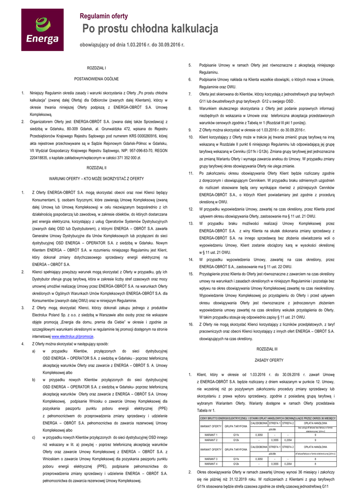 Regulamin oferty Po prostu chłodna kalkulacja obowiązujący od dnia 1.03.2016 r. do 30.09.2016 r. 5. ROZDZIAŁ I Podpisanie Umowy w ramach Oferty jest równoznaczne z akceptacją niniejszego Regulaminu. POSTANOWIENIA OGÓLNE 6. Podpisanie Umowy nakłada na Klienta wszelkie obowiązki, o których mowa w Umowie, Regulaminie oraz OWU. 1. Niniejszy Regulamin określa zasady i warunki skorzystania z Oferty „Po prostu chłodna 7. kalkulacja” (zwanej dalej Ofertą) dla Odbiorców (zwanych dalej Klientami), którzy w okresie trwania niniejszej Oferty podpiszą z ENERGA-OBRÓT S.A. Umowę G11 lub dwustrefowych grup taryfowych G12 u swojego OSD . 8. Kompleksową. 2. Oferta jest skierowana do Klientów, którzy korzystają z jednostrefowych grup taryfowych Warunkiem skutecznego skorzystania z Oferty jest podanie poprawnych informacji niezbędnych do wskazania w Umowie oraz telefoniczna akceptacja przedstawionych Organizatorem Oferty jest: ENERGA-OBRÓT S.A. (zwana dalej także Sprzedawcą) z warunków cenowych zgodnie z Tabelą nr 1 (Rozdział III pkt 1 poniżej). siedzibą w Gdańsku, 80-309 Gdańsk, al. Grunwaldzka 472, wpisana do Rejestru 9. Z Oferty można skorzystać w okresie od 1.03.2016 r. do 30.09.2016 r. Przedsiębiorców Krajowego Rejestru Sądowego pod numerem KRS 0000280916, której 10. Klient korzystający z Oferty może w trakcie jej trwania zmienić grupę taryfową na inną akta rejestrowe przechowywane są w Sądzie Rejonowym Gdańsk-Północ w Gdańsku, wskazaną w Rozdziale II punkt 6 niniejszego Regulaminu lub odpowiadającą jej grupę VII Wydział Gospodarczy Krajowego Rejestru Sądowego, NIP: 957-096-83-70, REGON taryfową wskazaną w Cenniku (G11k i G12k). Zmiana grupy taryfowej jest jednoznaczna 220418835, o kapitale zakładowym/wpłaconym w całości 371 352 000 zł. ze zmianą Wariantu Oferty i wymaga zawarcia aneksu do Umowy. W przypadku zmiany grupy taryfowej okres obowiązywania Oferty nie ulega zmianie. ROZDZIAŁ II 11. WARUNKI OFERTY – KTO MOŻE SKORZYSTAĆ Z OFERTY Po zakończeniu okresu obowiązywania Oferty Klient będzie rozliczany zgodnie z doręczonym i obowiązującym Cennikiem. W przypadku braku odmiennych uzgodnień do rozliczeń stosowane będą ceny wynikające również z późniejszych Cenników 1. Z Oferty ENERGA-OBRÓT S.A. mogą skorzystać obecni oraz nowi Klienci będący ENERGA-OBRÓT S.A., o których Klient powiadamiany jest zgodnie z procedurą Konsumentami, tj. osobami fizycznymi, które zawierają Umowę Kompleksową (zwaną dalej Umową lub Umową Kompleksową) w celu niezwiązanym bezpośrednio z ich określoną w OWU. 12. działalnością gospodarczą lub zawodową, w zakresie obiektów, do których dostarczana jest energia elektryczna, korzystający z usług Operatorów Systemów Dystrybucyjnych upływem okresu obowiązywania Oferty, zastosowanie ma § 11 ust. 21 OWU. 13. (zwanych dalej OSD lub Dystrybutorem), z którymi ENERGA – OBRÓT S.A. zawarła możliwości realizacji Umowy Kompleksowej przez w § 11 ust. 21 OWU. 14. ENERGA – OBRÓT S.A. W przypadku wypowiedzenia Umowy, zawartej na czas określony, przez ENERGA-OBRÓT S.A., zastosowanie ma § 11 ust. 22 OWU. Klienci spełniający powyższy warunek mogą skorzystać z Oferty w przypadku, gdy ich 15. Dystrybutor oferuje grupę taryfową, która w zakresie liczby stref czasowych oraz mocy Przystąpienie przez Klienta do Oferty jest równoznaczne z zawarciem na czas określony umowy na warunkach i zasadach określonych w niniejszym Regulaminie i pozostaje bez umownej umożliwi realizację Umowy przez ENERGA-OBRÓT S.A. na warunkach Oferty wpływu na okres obowiązywania Umowy Kompleksowej zawartej na czas nieokreślony. określonych w Ogólnych Warunkach Umów Kompleksowych ENERGA-OBRÓT S.A. dla Wypowiedzenie Umowy Kompleksowej po przystąpieniu do Oferty i przed upływem Konsumentów (zwanych dalej OWU) oraz w niniejszym Regulaminie. okresu obowiązywania Oferty jest równoznaczne z jednoczesnym złożeniem Z Oferty mogą skorzystać Klienci, którzy dokonali zakupu jednego z produktów wypowiedzenia umowy zawartej na czas określony wskutek przystąpienia do Oferty. Electrolux Poland Sp. z o.o. z siedzibą w Warszawie albo osoby przez nie wskazane objęte promocją „Energia dla domu, premia dla Ciebie” w okresie i zgodnie ze W takim przypadku stosuje się odpowiednio zapisy § 11 ust. 21 OWU. 16. szczegółowymi warunkami określonymi w regulaminie tej promocji dostępnym na stronie Z Oferty nie mogą skorzystać Klienci korzystający z liczników przedpłatowych, z taryf pracowniczych oraz obecni Klienci korzystający z innych ofert ENERGA – OBRÓT S.A. internetowej www.electrolux.pl/promocje. 4. braku wypowiedzeniu Umowy, Klient zostanie obciążony karą w wysokości określonej Klientem ENERGA – OBRÓT S.A. w rozumieniu niniejszego Regulaminu jest Klient, 3. przypadku ENERGA-OBRÓT S.A. na innego sprzedawcę bez złożenia oświadczenia woli o dystrybucyjnej OSD ENERGA – OPERATOR S.A. z siedzibą w Gdańsku. Nowym 2. W ENERGA-OBRÓT S.A. z winy Klienta na skutek dokonania zmiany sprzedawcy z Generalne Umowy Dystrybucyjne dla Umów Kompleksowych lub przyłączeni do sieci który dokonał zmiany dotychczasowego sprzedawcy energii elektrycznej na W przypadku wypowiedzenia Umowy, zawartej na czas określony, przez Klienta przed obowiązujących na czas określony. Z Oferty można skorzystać w następujący sposób: a) w przypadku Klientów, przyłączonych do sieci ROZDZIAŁ III dystrybucyjnej OSD ENERGA – OPERATOR S.A. z siedzibą w Gdańsku - poprzez telefoniczną ZASADY OFERTY akceptację warunków Oferty oraz zawarcie z ENERGA – OBRÓT S. A. Umowy Kompleksowej albo b) 1. z ENERGA-OBRÓT S.A. będzie rozliczany z dniem wskazanym w punkcie 12. Umowy, OSD ENERGA – OPERATOR S.A. z siedzibą w Gdańsku- poprzez telefoniczną nie wcześniej niż po pozytywnym zakończeniu procedury zmiany sprzedawcy lub akceptację warunków Oferty oraz zawarcie z ENERGA –