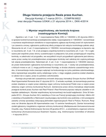 89 Długa historia przejęcia Reala przez Auchan. Decyzja Komisji z 7 marca 2013 r., COMP/M.6822 oraz decyzja Prezesa UOKiK z 21 stycznia 2014 r., DKK-4/2014 I. Wymiar wspólnotowy, ale kontrola krajowa (rozstrzygnięcie Komisji) Zgodnie z art. 4 ust. 1 zd. 1 rozporządzenia Rady (WE) nr 139/2004 z 20 stycznia 2004 r. w sprawie kontroli koncentracji przedsiębiorstw (dalej: rozporządzenie nr 139/2004)1, koncentracje o wymiarze wspólnotowym określone w rozporządzeniu zgłasza się Komisji przed ich wykonaniem i po zawarciu umowy, ogłoszeniu publicznej oferty przejęcia lub nabyciu kontrolnego pakietu akcji. Stosownie do art. 4 ust. 2 rozporządzenia nr 139/2004, koncentracja polegająca na łączeniu się w rozumieniu art. 3 ust. 1 lit. a lub przejęciu wspólnej kontroli w rozumieniu art. 3 ust. 1 lit. b zgłaszana jest wspólnie przez strony uczestniczące w połączeniu lub przez przejmujących wspólną kontrolę, w zależności od przypadku; we wszystkich innych przypadkach zgłoszenie jest dokonywane przez osobę lub przedsiębiorstwo przejmujące kontrolę nad całością lub częścią jednego lub więcej przedsiębiorstw. Natomiast art. 4 ust. 4 zd. 1 rozporządzenia nr 139/2004 stanowi, że przed dokonaniem zgłoszenia koncentracji w rozumieniu ust. 1 osoby lub przedsiębiorstwa, o których mowa w ust. 2, mogą poinformować Komisję, w drodze złożenia uzasadnionego wniosku, iż koncentracja może znacząco wpłynąć na konkurencję na rynku państwa członkowskiego, który reprezentuje wszystkie cechy odrębnego rynku i z tego względu powinna zostać zbadana, w całości lub w części, przez to państwo członkowskie. Komisja otrzymała taki uzasadniony wniosek dotyczący transakcji Groupe Auchan SA/Real/ Real Hypermarket Romania dnia 31 stycznia 2013 r. Z wniosku wynikało, że koncentracja powinna zostać zbadana w części przez właściwy organ ochrony konkurencji Polski oraz w części przez właściwy organ ochrony konkurencji Rumunii. Zamierzona przez strony transakcja obejmowała przejęcie kontroli przez Auchan nad Real Poland i Real Romania poprzez nabycie udziałów w ich kapitale zakładowym. Wymiar wspólnotowy tej koncentracji nie budził wątpliwości. Dnia 30 listopada 2012 r. Groupe Auchan SA z siedzibą w Croix we Francji (przejmujący kontrolę) i Metro AG z siedzibą w Dusseldorfie w Niemczech (wyzbywający się kontroli) oraz podmioty z nimi powiązane zawarły umowę sprzedaży dotyczącą jednostek organizacyjnych Real w Polsce, Rumunii, Rosji oraz na Ukrainie (łącznie 95 hipermarketów oraz 13 centrów handlowych). Zamiar koncentracji został zgłoszony rosyjskiemu organowi ochrony konkurencji (Федеральная Антимонопольная Служба, ang. Federal Antimonopoly Service) 29 grudnia 2012 r., a ukraińskiemu organowi ochrony konkurencji (Антимонопольний Комітет України, ang. Antimonopoly Committee of Ukraine) – 4 stycznia 2013 r. 1 Dz. Urz. L 24 z 29.01.2004 r., s. 1. www.ikar.wz.uw.edu.pl internetowy Kwartalnik Antymonopolowy i Regulacyjny 2014, nr 3(3) 90 Anna Piszcz Długa historia przejęcia Reala przez Auchan Art. 4 ust. 4 zd. 2 (akapit 2) rozporządzenia nr 139/2004 stanowi, że Komisja niezwłocznie przekazuje otrzymany wniosek do wszystkich państw członkowskich. Komisja wykonała ten obowiązek w tym samym dniu, w którym otrzymała wniosek. Z art. 4 ust. 4 zd. 3–4 (akapit 2) rozporządzenia nr 139/2004 wynika, że państwo członkowskie wymienione w uzasadnionym wniosku powinno, w terminie 15 dni od otrzymania wniosku, wyrazić zgodę lub sprzeciw wobec wniosku o odesłanie sprawy. W przypadku, gdy państwo członkowskie nie podejmie takiej decyzji w tym terminie, uważa się tym samym, że wyraziło zgodę na odesłanie sprawy. Zarówno Prezes Urzędu Ochrony Konkurencji i Kosumentów (dalej: Prezes UOKiK), jak i rumuńska Rada Konkurencji (Consiliul Concurentei), pismami z 13 lutego 2013 r. wyraziły zgodę na odesłanie im sprawy. Brak sprzeciwu państwa członkowskiego jest tylko jedną z przesłanek decyzji o odesłaniu sprawy przez Komisję do właściwych organów państwa członkowskiego. Kolejnymi przesłankami – w myśl art. 4 ust. 4 zd. 5 (akapit 3) rozporządzenia nr 139/2004 – są: (1) uznanie przez Komisję, że istnieje rynek państwa członkowskiego, który reprezentuje wszystkie cechy odrębnego rynku; (2) uznanie przez Komisję, że koncentracja może mieć znaczący wpływ na konkurencję na tym rynku. W sprawie Groupe Auchan/Real/Real Hypermarket Romania Komisja nie miała wątpliwości, że rynki, których dotyczy transakcja, mają wszystkie cechy odrębnego rynku, gdyż nie są większe niż rynki krajowe. Pod względem geograficznym Komisja uznała zamierzoną koncentrację za lokalną, „subkrajową”, a co najwyżej krajową2. Miało to związek z dotychczasową praktyką orzeczniczą Komisji, która uznawała, że rynek sprzedaży detalicznej artykułów konsumpcyjnych codziennego użytku ma: (1) wymiar lokalny i obejmuje swym zasięgiem obszar położony w promieniu 20 do 30 minut jazdy samochodem do określonej placówki handlowej3; (2) szerszy wymiar, tj. wymiar regionalny albo krajowy, jeżeli mniejsze obszary są powiązane w ten sposób, że stanowią nakładające się na siebie nawzajem okręgi4. Ponadto Komisja uznała, że zamierzona koncentracja w Rumunii wpłynęłaby na cztery rynki w regionie Bukaresztu oraz siedem rynków w innych regionach, prowadząc w przypadku niektórych z nich do powstania łącznego udziału stron w rynku przekraczającego 30–40%. Również niektórym z polskich rynków zagrażałoby powstanie łącznego udziału stron w rynku przekraczającego 30–40%. Komisja, powołując się na ustępy 17–18 Obwieszczenia Komisji w sprawie odsyłania spraw dotyczących koncentracji5, stwierdziła, że transakcja może mieć znaczący wpływ na konkurencję na rynkach polskich i rumuńskich, pozostając bez żadnego