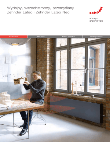 Wydajny, wszechstronny, przemyślany Zehnder Lateo i Zehnder Lateo Neo Ogrzewanie Chłodzenie Świeże powietrze Czyste powietrze Kiedy szuka się rozwiązań wszechstronnych. Każdy projekt architektoniczny jest wyjątkowy. Dlatego doceniane są rozwiązania uniwersalne, umożliwiające spełnienie najbardziej różnorodnych wymagań. Poszukują Państwo wydajnego grzejnika konwektorowego, który jest kompatybilny z każdym systemem grzewczym i jest dostępny w rozmiarach i wariantach spełniających każdy architektoniczny wymóg – a w szczególności dający możliwość montażu pod oknami? Funkcjonalność jest równie istotna jak wygląd grzejnika, który pod względem formy oraz koloru powinien zostać wkomponowany w aranżację danego wnętrza. Wymagają Państwo wysokiej jakości, trwałości i odporności na korozję? Poszukiwany przez Państwa produkt powinien umożliwiać szybką i łatwą instalację, a w idealnym przypadku być złożony z wstępnie zamontowanych elementów? Naszą odpowiedzią jest grzejnik Zehnder Lateo z konwekcją naturalną lub Zehnder Lateo Neo z konwekcją wymuszoną – połączenie wydajności i różnorodności: ■ ■ ■ ■ ■ Elastyczność Różnorodność Funkcjonalność i spójność Wysoka jakość i trwałość Szybka i prosta instalacja 3 Funkcjonalność i atrakcyjne wzornictwo. Duet doskonały. Dzięki minimalistycznej formie grzejnik konwektorowy Zehnder Lateo lub Zehnder Lateo Neo zyskuje na uniwersalności, która otwiera szersze możliwości zastosowania w różnorodnych projektach przestrzennych. Brak ostrych krawędzi sprawia, że jest również doskonale przystosowany do użytku w budynkach mieszkalnych, biurowcach i budynkach użyteczności publicznej. Za subtelnym wyglądem grzejnika kryje się najnowocześniejsza technologia wymiennika ciepła. Takie materiały jak aluminium i miedź gwarantują maksymalną odporność na korozję, trwałość i sprawność energetyczną. Możliwość wszechstronnego zastosowania: brak ostrych krawędzi sprawia, że ten grzejnik konwektorowy jest przystosowany do użytku w budynkach mieszkalnych, biurowcach i budynkach użyteczności publicznej. Harmonijna integracja: dzięki dyskretnej formie oraz dostępności we wszystkich kolorach z karty Zehnder, grzejnik konwektorowy pasuje do każdego wnętrza. 4 Elastyczność: bogaty wybór wariantów umożliwia precyzyjne dostosowanie do wymaganych parametrów wydajności i wszelkich warunków architektonicznych. Jakość: wydajna technologia wymiennika ciepła z aluminium imiedzi gwarantuje maksymalną odporność na korozję, trwałość i sprawność energetyczną. Komfort: wstępnie zamontowane elementy zapewniają szybki i prosty montaż grzejnika. Kompatybilność: Zehnder Lateo jest przystosowany do różnych systemów grzewczych zarówno w nowym budownictwie, jak iobiektach modernizowanych, również w połączeniu z instalacją ogrzewania podłogowego. Idealnym rozwiązaniem w niskotemperaturowych systemach grzewczych jest Zehnder Lateo Neo ze wspomaganiem wentylatorowym. Szybki montaż. Łatwe uruchamianie. Zehnder Lateo i Zehnder Lateo Neo pozwalają na oszczędność cennego czasu podczas instalacji. Dzięki inteligentnej konstrukcji grzejnik posiada tylko dwa elementy podstawowe: techniczne wyposażenie wewnątrz oraz obudowę. Nie ma potrzeby montażu skomplikowanego zestawu. W miejscu instalacji następuje jedynie połączenie kilku części i Zehnder Lateo jest gotowy do działania. Etapy montażu Zehnder Lateo 1 Zamocować na ścianie konsolę montażową ze wstępnie zamontowanym wymiennikiem ciepła i grillem. 3 Zamontować części obudowy. 2 Zainstalować przyłącza.* 4 Założyć głowicę termostatyczną.* *Głowica termostatyczna, korpus zaworu i zawór odcinający na powrocie nie należą do zakresu dostawy standardowej. 5 Zehnder Lateo Zehnder Lateo Neo Kompaktowa konstrukcja stanowi o wielu możliwościach stosowania grzejnika Zehnder Lateo. Można go montować na ścianie: pod oknami lub we wnękach. Powściągliwe wzornictwo pasuje do każdego otoczenia. Konwektor wyróżnia niezwykle łatwy montaż i wydajność przy niewielkiej ilości zajmowanego miejsca. Dostępny w niemal wszystkich kolorach i powierzchniach z karty Zehnder. Zintegrowane wentylatory gwarantują w przypadku Zehnder Lateo Neo jeszcze większą wydajność. Dzięki grillowi o strukturze plastra miodu ciepłe powietrze wypływa jeszcze skuteczniej, zapewniając przytulne ciepło w pomieszczeniach. Zintegrowane z grzejnikami Zehnder Lateo Neo wentylatory mogą być włączane i wyłączane przez panel sterowania. 6 7 Zehnder Lateo z konwekcją naturalną. Przykład zaczerpnięty z natury: termika, czyli unoszenie się ciepłych mas powietrza, umożliwia ptakom i szybowcom wzbijanie się w przestworza. Zehnder Lateo wykorzystuje tę naturalną zasadę, zwaną również konwekcją, w nowoczesnej i efektywnej technice grzewczej. Współdziałanie opadającego zimnego powietrza i unoszącego się ciepłego powietrza, szczególnie w pobliżu okien, tworzy barierę cieplną przeciwdziałającą schładzaniu i powstawaniu nieprzyjemnych przeciągów, uzyskując w ten sposób przytulne ciepło, które jest odczuwalne w wyjątkowo naturalny sposób. Zasada działania Ogrzane powietrze Grzejnik wykorzystuje zimne powietrze z pomieszczenia, aby je ogrzać, a następnie z powrotem przekazać do pomieszczenia w postaci unoszących się ciepłych mas powietrza. Wymiennik ciepła Zimne powietrze Zalety konwekcji Brak grzejnika konwektorowego przy fasadzie okiennej sprawia, że zimne powietrze może wypełnić całe pomieszczenie. Duże okna powodują znaczne straty ciepła, nawet przy dobrym współczynniku przenikania. Grzejnik konwektorowy zapobiega takiemu wychłodzeniu i zwiększa komfort cieplny w pomieszczeniu. Fasada okienna bez grzejnika 8 Fasada okienna z grzejnikiem Dane techniczne Zehnder Lateo T L T T T H H L L L Zehnder Lateo Model LWN-035-007 Hwysok