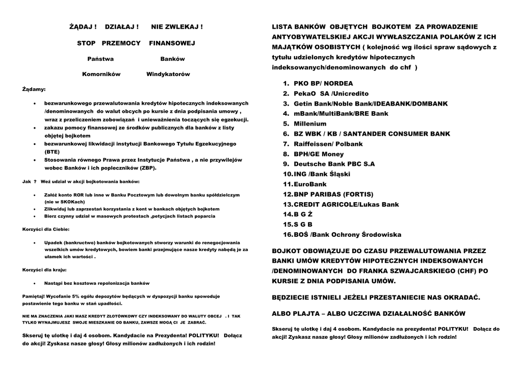ŻĄDAJ ! STOP DZIAŁAJ ! PRZEMOCY NIE ZWLEKAJ ! FINANSOWEJ Państwa Komorników Banków Windykatorów Żądamy: • • • • indeksowanych/denominowanych do chf ) 1. PKO BP/ NORDEA 2. PekaO SA /Unicredito 4. mBank/MultiBank/BRE Bank zakazu pomocy finansowej ze środków publicznych dla banków z listy 5. Millenium objętej bojkotem 6. BZ WBK / KB / SANTANDER CONSUMER BANK bezwarunkowej likwidacji instytucji Bankowego Tytułu Egzekucyjnego 7. Raiffeissen/ Polbank (BTE) 8. BPH/GE Money Stosowania równego Prawa przez Instytucje Państwa , a nie przywilejów Weź udział w akcji bojkotowania banków: 9. Deutsche Bank PBC S.A 10. ING /Bank Śląski 11. EuroBank Załóż konto ROR lub inne w Banku Pocztowym lub dowolnym banku spółdzielczym 12. BNP PARIBAS (FORTIS) (nie w SKOKach) 13. CREDIT AGRICOLE/Lukas Bank Zlikwiduj lub zaprzestań korzystania z kont w bankach objętych bojkotem • Bierz czynny udział w masowych protestach ,petycjach listach poparcia Korzyści dla Ciebie: 14. B G Ż 15. S G B 16. BOŚ /Bank Ochrony Środowiska Upadek (bankructwo) banków bojkotowanych stworzy warunki do renegocjowania wszelkich umów kredytowych, bowiem banki przejmujące nasze kredyty nabędą je za ułamek ich wartości . Korzyści dla kraju: • tytułu udzielonych kredytów hipotecznych 3. Getin Bank/Noble Bank/IDEABANK/DOMBANK • • MAJĄTKÓW OSOBISTYCH ( kolejność wg ilości spraw sądowych z /denominowanych do walut obcych po kursie z dnia podpisania umowy , wobec Banków i ich popleczników (ZBP). Jak ? ANTYOBYWATELSKIEJ AKCJI WYWŁASZCZANIA POLAKÓW Z ICH bezwarunkowego przewalutowania kredytów hipotecznych indeksowanych wraz z przeliczeniem zobowiązań i unieważnienia toczących się egzekucji. • LISTA BANKÓW OBJĘTYCH BOJKOTEM ZA PROWADZENIE Nastąpi bez kosztowa repolonizacja banków Pamiętaj! Wycofanie 5% ogółu depozytów będących w dyspozycji banku spowoduje postawienie tego banku w stań upadłości. NIE MA ZNACZENIA JAKI MASZ KREDYT ZŁOTÓWKOWY CZY INDEKSOWANY DO WALUTY OBCEJ . I TAK BOJKOT OBOWIĄZUJE DO CZASU PRZEWALUTOWANIA PRZEZ BANKI UMÓW KREDYTÓW HIPOTECZNYCH INDEKSOWANYCH /DENOMINOWANYCH DO FRANKA SZWAJCARSKIEGO (CHF) PO KURSIE Z DNIA PODPISANIA UMÓW. BĘDZIECIE ISTNIELI JEŻELI PRZESTANIECIE NAS OKRADAĆ. ALBO PLAJTA – ALBO UCZCIWA DZIAŁALNOŚĆ BANKÓW TYLKO WYNAJMUJESZ SWOJE MIESZKANIE OD BANKU, ZAWSZE MOGĄ CI JE ZABRAĆ. Skseruj tę ulotkę i daj 4 osobom. Kandydacie na Prezydenta! POLITYKU! Dołącz do akcji! Zyskasz nasze głosy! Głosy milionów zadłużonych i ich rodzin! Skseruj tę ulotkę i daj 4 osobom. Kandydacie na prezydenta! POLITYKU! Dołącz do akcji! Zyskasz nasze głosy! Głosy milionów zadłużonych i ich rodzin!