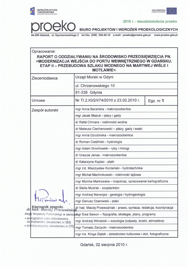 Opracowanie: RAPORT O ODDZIAŁYWANIU NA ŚRODOWISKO PRZEDSIĘWZIĘCIA PN. >MODERNIZACJA WEJŚCIA DO PORTU WEWNĘTRZNEGO W GDAŃSKU. ETAP II – PRZEBUDOWA SZLAKU WODNEGO NA MARTWEJ WIŚLE I MOTŁAWIE< Zleceniodawca Urząd Morski w Gdyni ul. Chrzanowskiego 10 81-338 Gdynia Umowa Nr TI.2.IG/2/I/74/2010 z 23.02.2010 r. Zespół autorski mgr Anna Barańska - makrozoobentos Egz. nr 1 mgr Jacek Błażuk - płazy i gady dr Rafał Chmara - roślinność wodna dr Mateusz Ciechanowski – płazy, gady i ssaki mgr Anna Dziubińska - makrozoobentos dr Roman Cieśliński - hydrologia mgr Adam Grochowski - ryby i minogi dr Urszula Janas - makrozoobentos dr Katarzyna Kopiec - ptaki mgr inż. Mieczysław Korzeński - hydrotechnika mgr Michał Machnikowski - roślinność lądowa mgr Monika Markowska – krajobraz, opracowanie kartograficzne dr Stella Mudrak - zooplankton mgr Andrzej Narwojsz - geologia i hydrogeologia mgr Dariusz Ożarowski - ptaki Kierownik zespołu dr hab. Maciej Przewoźniak - prawo, synteza, redakcja, koordynacja mgr Ewa Sawon – fizjografia, strategie, plany, programy mgr Andrzej Winiarski – sozologia (odpady, ścieki, atmosfera) mgr Tomasz Zarzycki - makrozoobentos mgr inż. Kinga Ziętek - dziedzictwo kulturowe i dok. fotograficzna Gdańsk, 02 sierpnia 2010 r. 2 proeko TOM 1 RAPORT Spis treści: 1. 2. 2.1. 2.2. 2.3. 2.4. 2.5. 2.6. 3. 3.1. 3.2. PODSTAWY PRAWNE I ZAKRES RAPORTU (Przewoźniak Maciej) .................10 CHARAKTERYSTYKA PLANOWANEGO PRZEDSIĘWZIĘCIA (Kaźmierski Marcin) ...................................................................................................15 Istota przedsięwzięcia – jego cel i zakres, powiązania z przedsięwzięciem pn. >Wykonanie toru wodnego na Wiśle Śmiałej< oraz specyfika wynikająca z położenia ............................................................. 15 Wariant podstawowy przedsięwzięcia i zastosowane w nim rozwiązania chroniące środowisko ....................................................................................... 16 Warianty alternatywne przedsięwzięcia ............................................................ 32 Wariant zaniechania przedsięwzięcia ............................................................... 37 Charakterystyka powiązanego funkcjonalnie przedsięwzięcia pn.: „Wykonanie toru wodnego na odcinku od Kanału Płonie na Martwej Wiśle do ujścia Wisły Śmiałej do Bałtyku”......................................................... 38 Warunki użytkowania terenu i akwenu na etapach budowy i eksploatacji przedsięwzięcia ................................................................................................ 40 ANALIZA I OCENA STANU ŚRODOWISKA MARTWEJ WISŁY, MOTŁAWY I ICH OTOCZENIA ORAZ WISŁY ŚMIAŁEJ .............................................................42 Wprowadzenie (Przewoźniak Maciej) ............................................................... 42 Struktura środowiska przyrodniczego ............................................................... 42 3.2.1. Położenie regionalne (Przewoźniak Maciej) ........................................... 42 3.2.1.1. Regionalizacja fizycznogeograficzna .......................................... 42 3.2.1.2. Podział hydrograficzny................................................................ 44 3.2.1.3. Struktura ekologiczna ................................................................. 44 3.2.2. Środowisko abiotyczne ........................................................................ 45 3.2.2.1. Warunki morfologiczno-geologiczne (Przewoźniak Maciej, Narwojsz Andrzej) .................................... 45 3.2.2.2. Warunki hydrogeologiczne (Narwojsz Andrzej) .......................... 48 3.2.2.3. Hydrologia Martwej Wisły i ujściowego odcinka Motławy oraz elementy hydrologii Wisły Śmiałej (Cieśliński Roman)............... 49 3.2.2.4. Warunki klimatyczne (Sawon Ewa)............................................. 56 3.2.2.5. Gleby (Sawon Ewa) .................................................................... 59 3.2.3. Środowisko biotyczne .......................................................................... 60 3.2.3.1. Szata roślinna Martwej Wisły i ujściowego odcinka Motławy oraz Wisły Śmiałej (Chmara Rafał) ............................................. 60 3.2.3.2. Szata roślinna lądowego otoczenia Martwej Wisły i ujściowego odcinka Motławy oraz Wisły Śmiałej (Machnikowski Michał)................................................................ 74 3.2.3.3. Siedliska Natura 2000 w rejonie Martwej Wisły i ujściowego odcinka Motławy oraz Wisły Śmiałej (Chmara Rafał, Machnikowski Michał) ................................................................. 95 3.2.3.4. Bezkręgowce Martwej Wisły i ujściowego odcinka Motławy oraz Wisły Śmiałej (Zarzycki Tomasz, Janas Urszula., Barańska Anna, Dziubińska Anna) ............................................. 98 3 proeko 3.3. 3.4. 3.5. 3.6. 4. 4.1. 4.2. 4.3. 5. 3.2.3.5. Ichtiofauna i minogi Martwej Wisły i ujściowego odcinka Motławy oraz Wisły Śmiałej (Grochowski Adam) ...................... 107 3.2.3.6. Płazy i gady Martwej Wisły i ujściowego odcinka Motławy oraz Wisły Śmiałej (Ciechanowski Mateusz, Błażuk Jacek) ............. 120 3.2.3.7. Awifauna Martwej Wisły i ujściowego odcinka Motławy, Wisły Śmiałej oraz ich otoczenia (Kopiec Katarzyna, Ożarowski Dariusz) .................................................................................... 124 3.2.3.8. Ssaki w rejonie Martwej Wisły i ujściowego odcinka Motławy oraz Wisły Śmiałej (Ciechanowski Mateusz)............................. 140 Zagrożenia przyrodnicze (Sawon Ewa) .......................................................... 146 Stan sozologiczny środowiska (Sawon Ewa, Winiarski Andrzej) .................... 147 3.4.1. Przekształcenia litosfery .................................................................... 147 3.4.2. Stan 