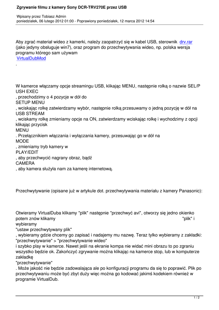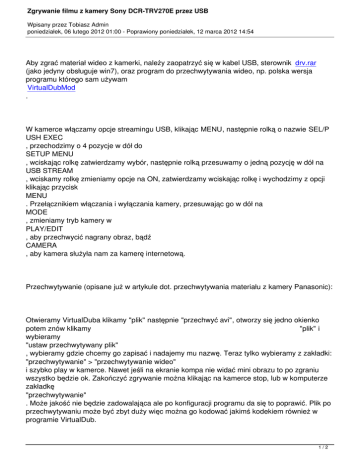 Zgrywanie filmu z kamery Sony DCR-TRV270E przez USB Wpisany przez Tobiasz Admin poniedziałek, 06 lutego 2012 01:00 - Poprawiony poniedziałek, 12 marca 2012 14:54 Aby zgrać materiał wideo z kamerki, należy zaopatrzyć się w kabel USB, sterownik drv.rar (jako jedyny obsługuje win7), oraz program do przechwytywania wideo, np. polska wersja programu którego sam używam VirtualDubMod . W kamerce włączamy opcje streamingu USB, klikając MENU, następnie rolką o nazwie SEL/P USH EXEC , przechodzimy o 4 pozycje w dół do SETUP MENU , wciskając rolkę zatwierdzamy wybór, następnie rolką przesuwamy o jedną pozycję w dół na USB STREAM , wciskamy rolkę zmieniamy opcje na ON, zatwierdzamy wciskając rolkę i wychodzimy z opcji klikając przycisk MENU . Przełącznikiem włączania i wyłączania kamery, przesuwając go w dół na MODE , zmieniamy tryb kamery w PLAY/EDIT , aby przechwycić nagrany obraz, bądź CAMERA , aby kamera służyła nam za kamerę internetową. Przechwytywanie (opisane już w artykule dot. przechwytywania materiału z kamery Panasonic): Otwieramy VirtualDuba klikamy "plik" następnie "przechwyć avi", otworzy się jedno okienko potem znów klikamy "plik" i wybieramy "ustaw przechwytywany plik" , wybieramy gdzie chcemy go zapisać i nadajemy mu nazwę. Teraz tylko wybieramy z zakładki: "przechwytywanie" > "przechwytywanie wideo" i szybko play w kamerce. Nawet jeśli na ekranie kompa nie widać mini obrazu to po zgraniu wszystko będzie ok. Zakończyć zgrywanie można klikając na kamerce stop, lub w komputerze zakładkę "przechwytywanie" . Może jakość nie będzie zadowalająca ale po konfiguracji programu da się to poprawić. Plik po przechwytywaniu może być zbyt duży więc można go kodować jakimś kodekiem również w programie VirtualDub. 1/2 Zgrywanie filmu z kamery Sony DCR-TRV270E przez USB Wpisany przez Tobiasz Admin poniedziałek, 06 lutego 2012 01:00 - Poprawiony poniedziałek, 12 marca 2012 14:54 Aby zmniejszyć rozmiar naszego nagrania, po zgraniu filmu otwieramy go ponownie w VirtualDub, klikamy „plik” > ”zapisz jako”, ustalamy ścieżkę, nadajemy nazwę plikowi, następnie u dołu klikamy na "Tryb wideo:" wybieramy „pełny proces” , kompresja „zmień” , wybieramy jakiś kodek, najlepszą kompresję uzyskamy wybierając kodek DivX lub Xvid , gdyż nasze filmy będą zajmowały około 700 mb dla filmu półtorej godzinnego, czyli jedna płyta CD, klikamy „OK” , a następnie „Zapisz” . Powodzenia! 2/2
