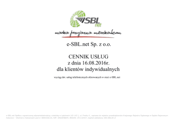 e-SBL.net Sp. z o.o. CENNIK USŁUG z dnia 16.08.2016r. dla klientów indywidualnych wyciąg dot. usług telefonicznych oferowanych w sieci e-SBL.net e-SBL.net Spółka z ograniczoną odpowiedzialnością z siedzibą w Lędzinach (43-143 ), ul. Fredry 6 , wpisana do rejestru przedsiębiorców Krajowego Rejestru Sądowego w Sądzie Rejonowym Katowice – Wschód w Katowicach pod nr 0000326110, NIP: 6462848644, REGON: 241132427, kapitał zakładowy 200.000,00 zł 3. CENNIK USŁUG TELEFONICZNYCH 3.1 taryfa Oszczędna DARMOWE MINUTY OPŁATY MIESIĘCZNE Rodzaj opłaty Abonament kwota Rodzaj darmowy minut Ilość minut 1,00 zł Darmowe minuty na telefony stacjonarne i komórkowe w Polsce brak darmowych minut OPŁATY ZA POŁĄCZENIA LOKALNE ORAZ ZA POŁĄCZENIA DO SIECI KOMÓRKOWYCH: Rodzaj opłaty Dni kwota Połączenia wewnątrz sieci dostawcy Wszystkie dni tygodnia darmowe Połączenia na telefony stacjonarne i komórkowe w Polsce Wszystkie dni tygodnia 0,29 zł Połączenia na telefony stacjonarne w UE, USA i Kanadzie Połączenie na telefony stacjonarne w wybranych państwach świata: Argentyna, Chiny, Malezja, Singapur, Tajwan, Wenezuela, Australia, Indie – Bangalore, Jordan, Peru – Lima, Połączenia do innych operatorów nie sklasyfikowanych w niniejszej tabeli są naliczane w oparciu o cennik szczegółowy znajdujący się na stronie www.netilius.pl . Przed wykonaniem połączenia należy sprawdzić koszt połączenia do danego operatora. Wszystkie dni tygodnia 0,29 zł Wszystkie dni tygodnia 0,29 zł OPŁATY JEDNORAZOWE Rodzaj opłaty Aktywacja usługi Aktywacja usługi – klient posiada własne urządzenia VOIP Aktywacja usługi – wirtualny faks kwota Rodzaj opłaty kwota 199 zł Zamówienie szczegółowego wykazu połą-czeń 5,00 zł 50,00 zł Wymiana sprzętu – aparatu telefoniczne-go (wymiana gwarancyjna) Koszt usługi serwisowej 10,00 zł Wymiana sprzętu – aparatu telefoniczne-go (wymiana pogwarancyjna) cena nowego urządzenia + koszt usługi Usługa serwisowa świadczona u klienta 50,00 zł / każdą rozpoczętą godzinę pracy Zmiana przydzielonego numer 20,00 zł OPŁATY MIESIĘCZNE Rodzaj opłaty Zawieszenie świadczenia usług Szczegółowy wykaz połączeń w formie papierowej dołączony do comie-sięcznej faktury kwota 5,00 zł 5,00 zł Rodzaj opłaty Blokada połączeń wychodzących do sieci komórkowych i na pager Blokada połączeń wychodzących na numery o podwyższonej opłacie 0-70x, 0207x, 0-208x kwota 10,00 zł bezpłatne e-SBL.net Spółka z ograniczoną odpowiedzialnością z siedzibą w Lędzinach (43-143 ), ul. Fredry 6 , wpisana do rejestru przedsiębiorców Krajowego Rejestru Sądowego w Sądzie Rejonowym Katowice – Wschód w Katowicach pod nr 0000326110, NIP: 6462848644, REGON: 241132427, kapitał zakładowy 200.000,00 zł 3.2 taryfa Domowa OPŁATY MIESIĘCZNE DARMOWE MINUTY Rodzaj opłaty kwota Rodzaj darmowy minut Ilość minut Abonament 20,00 zł Darmowe minuty na telefony stacjonarne i komórkowe w Polsce 120 min OPŁATY ZA POŁĄCZENIA LOKALNE ORAZ ZA POŁĄCZENIA DO SIECI KOMÓRKOWYCH: Rodzaj opłaty Dni kwota Połączenia wewnątrz sieci dostawcy Wszystkie dni tygodnia darmowe Połączenia na telefony stacjonarne i komórkowe w Polsce Wszystkie dni tygodnia 0,19 zł Połączenia na telefony stacjonarne w UE, USA i Kanadzie Połączenie na telefony stacjonarne w wybranych państwach świata: Argentyna, Chiny, Malezja, Singapur, Tajwan, Wenezuela, Australia, Indie – Bangalore, Jordan, Peru – Lima, Połączenia do innych operatorów nie sklasyfikowanych w niniejszej tabeli są naliczane w oparciu o cennik szczegółowy znajdujący się na stronie www.netilius. Przed wykonaniem połączenia należy sprawdzić koszt połączenia do danego operatora. Wszystkie dni tygodnia 0,19 zł Wszystkie dni tygodnia 0,29 zł OPŁATA AKTYWACYJNA Rodzaj opłaty/ czas trwania umowy Umowa zawarta na czas nieokreślony Umowa zawarta na 12 miesięcy Umowa zawarta na 24 miesiące Umowa zawarta na 36 miesięcy Opłata aktywacyjna 199,00 zł 199,00 zł 199,00 zł 199,00 zł Opłata aktywacyjna w pakiecie z internetem 199,00 zł 29,00 zł 29,00 zł 29,00 zł e-SBL.net Spółka z ograniczoną odpowiedzialnością z siedzibą w Lędzinach (43-143 ), ul. Fredry 6 , wpisana do rejestru przedsiębiorców Krajowego Rejestru Sądowego w Sądzie Rejonowym Katowice – Wschód w Katowicach pod nr 0000326110, NIP: 6462848644, REGON: 241132427, kapitał zakładowy 200.000,00 zł 3.3 taryfa europejska OPŁATY MIESIĘCZNE DARMOWE MINUTY Rodzaj opłaty kwota Rodzaj darmowy minut Ilość minut Abonament 29,00 zł Darmowe minuty na telefony stacjonarne i komórkowe w Polsce, darmowe na stacjonarne w UE 180 min OPŁATY ZA POŁĄCZENIA LOKALNE ORAZ ZA POŁĄCZENIA DO SIECI KOMÓRKOWYCH: Rodzaj opłaty Dni kwota Połączenia wewnątrz sieci dostawcy Wszystkie dni tygodnia darmowe Połączenia na telefony stacjonarne i komórkowe w Polsce Wszystkie dni tygodnia 0,19 zł Połączenia na telefony stacjonarne w UE, USA i Kanadzie Połączenie na telefony stacjonarne w wybranych państwach świata: Argentyna, Chiny, Malezja, Singapur, Tajwan, Wenezuela, Australia, Indie – Bangalore, Jordan, Peru – Lima, Połączenia do innych operatorów nie sklasyfikowanych w niniejszej tabeli są naliczane w oparciu o cennik szczegółowy znajdujący się na stronie www.netilius. Przed wykonaniem połączenia należy sprawdzić koszt połączenia do danego operatora. Wszystkie dni tygodnia 0,19 zł Wszystkie dni tygodnia 0,29 zł OPŁATA AKTYWACYJNA Rodzaj opłaty/ czas trwania umowy Umowa zawarta na czas nieokreślony Umowa zawarta na 12 miesięcy Umowa zawarta na 24 miesiące Umowa zawarta na 36 miesięcy Opłata aktywacyjna 199,00 zł 199,00 zł 199,00 zł 199,00 zł Opłata aktywacyjna w pakiecie z internetem 199,00 zł 29,00 zł 29,00 zł 29,00 zł e-SBL.net Spółka z ograniczoną odpowiedzialnością z siedzibą w Lędzinach (43-143 ), ul. Fredry 6 , wpisana do rejestru przedsiębiorc