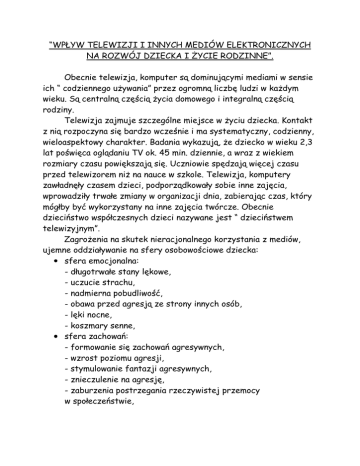 “WPŁYW TELEWIZJI I INNYCH MEDIÓW ELEKTRONICZNYCH NA ROZWÓJ DZIECKA I śYCIE RODZINNE”. Obecnie telewizja, komputer są dominującymi mediami w sensie ich “ codziennego uŜywania” przez ogromną liczbę ludzi w kaŜdym wieku. Są centralną częścią Ŝycia domowego i integralną częścią rodziny. Telewizja zajmuje szczególne miejsce w Ŝyciu dziecka. Kontakt z nią rozpoczyna się bardzo wcześnie i ma systematyczny, codzienny, wieloaspektowy charakter. Badania wykazują, Ŝe dziecko w wieku 2,3 lat poświęca oglądaniu TV ok. 45 min. dziennie, a wraz z wiekiem rozmiary czasu powiększają się. Uczniowie spędzają więcej czasu przed telewizorem niŜ na nauce w szkole. Telewizja, komputery zawładnęły czasem dzieci, podporządkowały sobie inne zajęcia, wprowadziły trwałe zmiany w organizacji dnia, zabierając czas, który mógłby być wykorzystany na inne zajęcia twórcze. Obecnie dzieciństwo współczesnych dzieci nazywane jest “ dzieciństwem telewizyjnym”. ZagroŜenia na skutek nieracjonalnego korzystania z mediów, ujemne oddziaływanie na sfery osobowościowe dziecka: • sfera emocjonalna: - długotrwałe stany lękowe, - uczucie strachu, - nadmierna pobudliwość, - obawa przed agresją ze strony innych osób, - lęki nocne, - koszmary senne, • sfera zachowań: - formowanie się zachowań agresywnych, - wzrost poziomu agresji, - stymulowanie fantazji agresywnych, - znieczulenie na agresję, - zaburzenia postrzegania rzeczywistej przemocy w społeczeństwie, - (moŜe spowodować) zachwianie równowagi psychicznej ( sceny grozy, okrucieństwa), - naśladowanie negatywnych postaci występujących w filmach, grach komputerowych ( szczególnie duŜy wpływ na dzieci niedostosowane społecznie, z rodzin rozbitych, zdemoralizowanych, dla których takie formy zachowań są wzorem do przyjęcia i zaakceptowania), - zachęcanie do podejmowania działań aspołecznych, podsuwanie sposobów dokonywania przestępstw, • sfera poznawcza: - rozleniwienie intelektualne, - postawa bierna, - zagroŜenia dotyczące słownictwa i wymowy dziecka, - osłabienie wyobraźni, zdolności językowych, - zachęcanie do “ myślowego lenistwa”, • dezorganizacja struktury budŜetu czasu: - redukcja czasu na naukę szkolną w domu, - redukcja czasu na prace na rzecz domu, rodziny, - redukcja czasu na zajęcia rekreacyjne, sportowe, czytelnictwo, • ujemny wpływ na stan zdrowia dziecka: - wzrost chorób: oczu, układu kostnego, nerwowego, - zaburzenia przemiany materii, - alergie, - upośledzenie rozwoju mózgowia. Ponadto telewizja często wyręcza rodziców w pełnieniu funkcji opiekuńczo – wychowawczych. Zdarza się, Ŝe jest ona pierwszym i jedynym nauczycielem w Ŝyciu dziecka od najmłodszych lat. Telewizja często “ podkopuje” Ŝycie rodzinne, jest “ narkotykiem” i zniekształca realny świat. “ Nałogowymi telewidzami” często są dzieci osamotnione, pozbawione miłości rodzinnej, przeŜywające sytuacje konfliktowe. Ponadto pełni rolę “ wizualnego tła” – towarzyszy spotkaniom, uroczystościom odbywającym się w domu, posiłkom. Często telewizor włącza się od razu po przyjściu z pracy, ze szkoły, podczas odrabiania lekcji. MoŜna powiedzieć, Ŝe telewizja wtopiona jest w obowiązki dnia codziennego i wypoczynek świąteczny. Relacje między oglądaniem telewizji a agresywnym zachowaniem dzieci: znieczulenie – oglądanie przemocy przytępia reakcje widza na gwałt dziejący się w rzeczywistości, oczyszczenie ( katharsis) – oglądanie przemocy fikcyjnej moŜe wyciszyć, zlikwidować agresję u dzieci w sposób zastępczy, identyfikowanie się – widz przyswaja agresywne zachowania bohaterów, z którymi identyfikuje się, a którego brutalne zachowanie jest pokazane jako usprawiedliwione, wzmocnienie – przemoc moŜe wzmocnić wcześniej ukształtowane w środowisku społecznym wzorce zachowania. Wychowawcze oddziaływanie telewizji i innych mediów (wykorzystywanych w racjonalny sposób): • stanowią źródło wiedzy o najnowszych osiągnięciach w nauce, kulturze, technice, • przekazują najwaŜniejsze wartości społeczne, obyczajowe, moralne wzbogacając osobowość dziecka, • wspomagają szkołę, rodzinę w dostarczaniu nieznanych dotąd informacji, jest źródłem wiedzy dla rodziców, • programy edukacyjne umoŜliwiają rodzicom zdobywanie wiedzy pedagogicznej, psychologicznej, dotyczącej róŜnych zagadnień związanych z wychowaniem dziecka, • są formą rozrywki, odpoczynku, • programy odpowiednio dobrane pod względem merytorycznym i artystycznym, mogą pomóc dziecku w poznaniu i prawidłowym rozumieniu współczesnego świata, ale potrzebne tu są rozmowy z dorosłymi w celu wyjaśniania niezrozumiałych kwestii, • inspirują dzieci do podejmowania róŜnych działań o charakterze społecznym, opiekuńczym, technicznym, do nowych, pozytywnych zachowań w rodzinie, grupie rówieśniczej, • wzory osobowe postaci telewizyjnych budzą aprobatę dzieci, które pragną identyfikować się z nimi, • wspólny rodzinny odbiór telewizji moŜe integrować rodzinę poprzez umacnianie więzi psychicznej miedzy dziećmi i rodzicami, stwarzać okazje do przebywania razem, współprzeŜywania odbieranych treści, porozumiewania się między sobą. Telewizja oraz inne media mają zarówno pozytywny jak i negatywny wpływ na dziecko, środowisko rodzinne. Dziecko jest podatne na ten wpływ, bo ma niski poziom zdolności i umiejętności percepcyjnych oraz wąski bagaŜ doświadczeń Ŝyciowych, który pozwoliłby mu na ocenę , wartościowanie odbieranych treści. To my – dorośli, rodzice, szkoła - powinniśmy przygotowywać naszych podopiecznych do selektywnego, krytycznego odbioru przekazywanych poprzez mass-media treści, by stali się mądrymi konsumentami i świadomymi odbiorcami. BIBLIOGRAFIA: JADWIGA IZDEBSKA “RODZINA, DZIECKO, TELEWIZJA : SZANSE WYCHOWAWCZE I ZAGROśENIA TELEWIZJI”. [WYD. 2] B