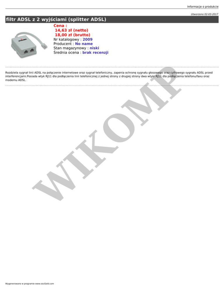 Informacje o produkcie Utworzono 02-03-2017 filtr ADSL z 2 wyjściami (splitter ADSL) Cena : 14,63 zł (netto) 18,00 zł (brutto) Nr katalogowy : 2009 Producent : No name Stan magazynowy : niski Średnia ocena : brak recenzji W IK O M P Rozdziela sygnał linii ADSL na połączenie internetowe oraz sygnał telefoniczny, zapenia ochronę sygnału głosowego oraz cyfrowego sygnału ADSL przed interferencjami.Posiada wtyk RJ11 dla podłączenia linii telefonicznej z jednej strony z drugiej strony dwa wtyki RJ11 dla podłączenia telefonu/faxu oraz modemu ADSL. Wygenerowano w programie www.oscGold.com
