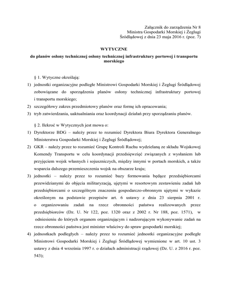Załącznik do zarządzenia Nr 8 Ministra Gospodarki Morskiej i Żeglugi Śródlądowej z dnia 23 maja 2016 r. (poz. 7) WYTYCZNE do planów osłony technicznej osłony technicznej infrastruktury portowej i transportu morskiego § 1. Wytyczne określają: 1) jednostki organizacyjne podległe Ministrowi Gospodarki Morskiej i Żeglugi Śródlądowej zobowiązane do sporządzenia planów osłony technicznej infrastruktury portowej i transportu morskiego; 2) szczegółowy zakres przedmiotowy planów oraz formę ich opracowania; 3) tryb zatwierdzania, uaktualniania oraz koordynacji działań przy sporządzaniu planów. § 2. Ilekroć w Wytycznych jest mowa o: 1) Dyrektorze BDG – należy przez to rozumieć Dyrektora Biura Dyrektora Generalnego Ministerstwa Gospodarki Morskiej i Żeglugi Śródlądowej; 2) GKR – należy przez to rozumieć Grupę Kontroli Ruchu wydzielaną ze składu Wojskowej Komendy Transportu w celu koordynacji przedsięwzięć związanych z wysłaniem lub przyjęciem wojsk własnych i sojuszniczych, między innymi w portach morskich, a także wsparcia dalszego przemieszczenia wojsk na obszarze kraju; 3) jednostki – należy przez to rozumieć bazy formowania będące przedsiębiorcami przewidzianymi do objęcia militaryzacją, ujętymi w resortowym zestawieniu zadań lub przedsiębiorcami o szczególnym znaczeniu gospodarczo-obronnym ujętymi w wykazie określonym na podstawie przepisów art. 6 ustawy z dnia 23 sierpnia 2001 r. o organizowaniu zadań na rzecz obronności państwa realizowanych przez przedsiębiorców (Dz. U. Nr 122, poz. 1320 oraz z 2002 r. Nr 188, poz. 1571), w odniesieniu do których organem organizującym i nadzorującym wykonywanie zadań na rzecz obronności państwa jest minister właściwy do spraw gospodarki morskiej; 4) jednostkach podległych – należy przez to rozumieć jednostki organizacyjne podległe Ministrowi Gospodarki Morskiej i Żeglugi Śródlądowej wymienione w art. 10 ust. 3 ustawy z dnia 4 września 1997 r. o działach administracji rządowej (Dz. U. z 2016 r. poz. 543); 5) Ministrze – należy przez to rozumieć Ministra Gospodarki Morskiej i Żeglugi Śródlądowej; 6) Ministerstwie – należy przez to rozumieć Ministerstwo Gospodarki Morskiej i Żeglugi Śródlądowej; 7) osłonie technicznej – należy przez to rozumieć osłonę techniczną infrastruktury transportowej, o której mowa w rozporządzeniu Rady Ministrów z dnia 3 lutego 2004 r. w sprawie warunków i sposobu przygotowania i wykorzystania transportu na potrzeby obronne państwa, a także jego ochrony w czasie wojny, oraz właściwości organów w tych sprawach (Dz. U. Nr 34, poz. 294), zwanym dalej „rozporządzeniem RM z dnia 3 lutego 2004 r.”; 8) planie – należy przez to rozumieć plan osłony technicznej, o którym mowa w rozporządzeniu RM z dnia 3 lutego 2004 r. § 3.1. Dyrektor BDG sporządza „Plan osłony technicznej działu administracji rządowej gospodarka morska”. 2. Właściwy terytorialnie kierownik jednostki podległej sporządza, według swoich właściwości, „Plan osłony technicznej infrastruktury portowej i transportu morskiego”. 3. Jednostki bezpośrednio realizujące zadania osłony technicznej biorą udział w opracowywaniu planów, na zasadach określonych przez właściwego kierownika jednostki podległej. 4. Plany zatwierdza Minister. 5. Właściwy kierownik jednostki podległej sporządza dla jednostek wypisy z planu w zakresie ich zadań i obszaru działania. 6. Plan sporządza się zgodnie z odrębnymi przepisami w zakresie przygotowania obronnego transportu i infrastruktury transportowej 1). 7. Plan oraz wyciągi z planu podlegają ochronie na podstawie obowiązujących przepisów w zakresie ochrony informacji niejawnych2). 2) 2) Ustawa z dnia 21 listopada 1967 r. o powszechnym obowiązku obrony Rzeczypospolitej Polskiej (Dz. U. z 2015 r. poz. 1220, 1224, 1830, 2183 i 2281 oraz z 2016 r. poz. 178), rozporządzenie Rady Ministrów z dnia 15 czerwca 2004 r. w sprawie warunków i trybu planowania i finansowania zadań wykonywanych w ramach przygotowań obronnych państwa przez organy administracji rządowej i organy samorządu terytorialnego (Dz. U. Nr 152, poz. 1599 oraz z 2007 r. Nr 197, poz. 1426) oraz rozporządzenie Rady Ministrów z dnia 3 lutego 2004 r. w sprawie warunków i sposobu przygotowania i wykorzystania transportu na potrzeby obronne państwa, a także jego ochrony w czasie wojny, oraz właściwości organów w tych sprawach (Dz. U. Nr 34, poz. 294). Ustawa z dnia 5 sierpnia 2010 r. o ochronie informacji niejawnych (Dz. U. Nr 182, poz. 1228, z 2015 r. poz. 21, 1224 i 2281). § 4.1. Plan składa się z części opisowej i graficznej. 2. Część opisowa planu, według właściwości jednostki sporządzającej, zawiera: 1) ocenę zagrożeń militarnych i niemilitarnych w obszarze infrastruktury portowej i transportu morskiego; 2) charakterystykę infrastruktury portowej i transportu morskiego podlegających osłonie technicznej, w tym charakterystykę: a) dostępnych środków transportowych, b) tras żeglugowych, c) techniczno-eksploatacyjną portów morskich, d) morskich przejść granicznych; 3) organizację punktów odkażania i dezaktywacji; 4) materiały i środki techniczne przeznaczone do wykorzystania w osłonie technicznej, w tym miejsca ich przechowywania; 5) zamiar kierowania jednostkami bezpośrednio realizującymi zadania osłony technicznej; 6) zasadnicze zadania w realizacji osłony technicznej transportu morskiego i wytypowanej infrastruktury portowej; 7) strukturę organizacyjną, możliwości i zadania jednostek przeznaczonych do realizacji zadań osłony technicznej; 8) kierowanie i organizację łączności; 9) organizację współdziałania, w tym: a) pomiędzy własnymi jednostkami organizacyjnymi, b) z GKR, c) z innymi poza resortowymi organami wspierającymi realizację zadań osłony technicznej infrastruktury portowej i transportu morskiego; 10) inne informacje uwzględniające 
