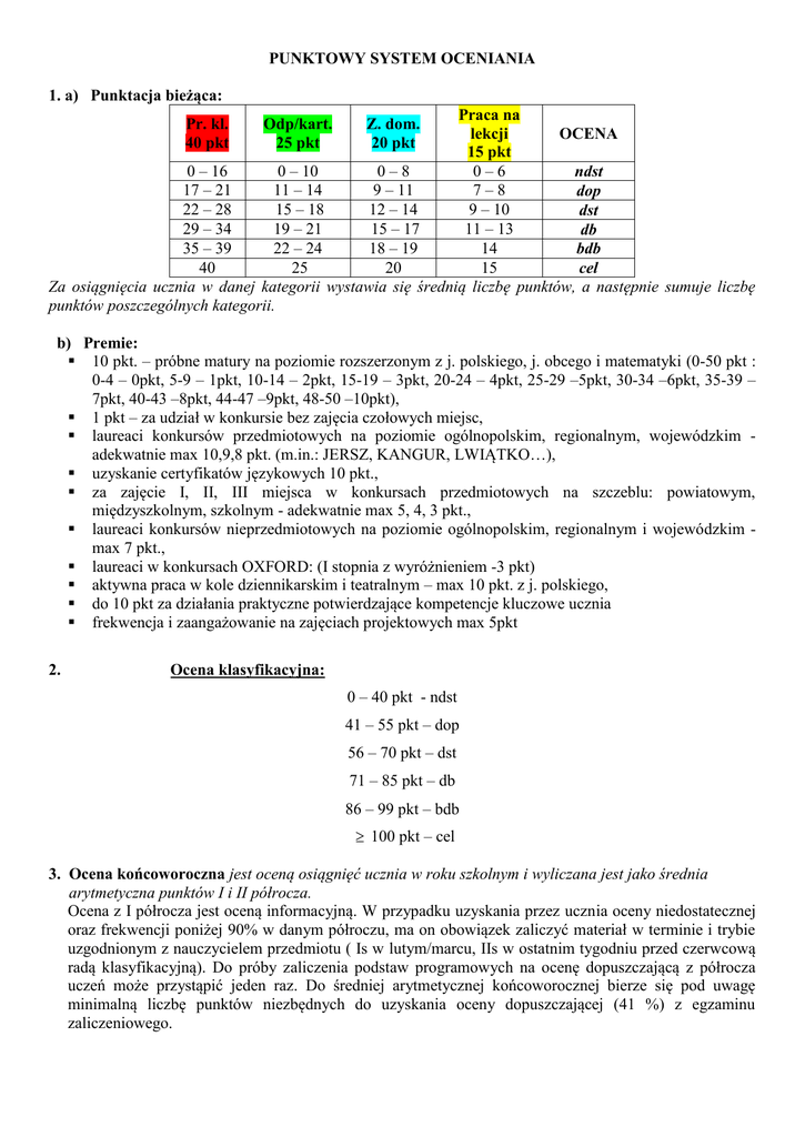 PUNKTOWY SYSTEM OCENIANIA 1. a) Punktacja bieżąca: Praca na lekcji OCENA 15 pkt 0 – 16 0 – 10 0–8 0–6 ndst 17 – 21 11 – 14 9 – 11 7–8 dop 22 – 28 15 – 18 12 – 14 9 – 10 dst 29 – 34 19 – 21 15 – 17 11 – 13 db 35 – 39 22 – 24 18 – 19 14 bdb 40 25 20 15 cel Za osiągnięcia ucznia w danej kategorii wystawia się średnią liczbę punktów, a następnie sumuje liczbę punktów poszczególnych kategorii. Pr. kl. 40 pkt Odp/kart. 25 pkt Z. dom. 20 pkt b) Premie: 10 pkt. – próbne matury na poziomie rozszerzonym z j. polskiego, j. obcego i matematyki (0-50 pkt : 0-4 – 0pkt, 5-9 – 1pkt, 10-14 – 2pkt, 15-19 – 3pkt, 20-24 – 4pkt, 25-29 –5pkt, 30-34 –6pkt, 35-39 – 7pkt, 40-43 –8pkt, 44-47 –9pkt, 48-50 –10pkt), 1 pkt – za udział w konkursie bez zajęcia czołowych miejsc, laureaci konkursów przedmiotowych na poziomie ogólnopolskim, regionalnym, wojewódzkim adekwatnie max 10,9,8 pkt. (m.in.: JERSZ, KANGUR, LWIĄTKO…), uzyskanie certyfikatów językowych 10 pkt., za zajęcie I, II, III miejsca w konkursach przedmiotowych na szczeblu: powiatowym, międzyszkolnym, szkolnym - adekwatnie max 5, 4, 3 pkt., laureaci konkursów nieprzedmiotowych na poziomie ogólnopolskim, regionalnym i wojewódzkim max 7 pkt., laureaci w konkursach OXFORD: (I stopnia z wyróżnieniem -3 pkt) aktywna praca w kole dziennikarskim i teatralnym – max 10 pkt. z j. polskiego, do 10 pkt za działania praktyczne potwierdzające kompetencje kluczowe ucznia frekwencja i zaangażowanie na zajęciach projektowych max 5pkt 2. Ocena klasyfikacyjna: 0 – 40 pkt - ndst 41 – 55 pkt – dop 56 – 70 pkt – dst 71 – 85 pkt – db 86 – 99 pkt – bdb 100 pkt – cel 3. Ocena końcoworoczna jest oceną osiągnięć ucznia w roku szkolnym i wyliczana jest jako średnia arytmetyczna punktów I i II półrocza. Ocena z I półrocza jest oceną informacyjną. W przypadku uzyskania przez ucznia oceny niedostatecznej oraz frekwencji poniżej 90% w danym półroczu, ma on obowiązek zaliczyć materiał w terminie i trybie uzgodnionym z nauczycielem przedmiotu ( Is w lutym/marcu, IIs w ostatnim tygodniu przed czerwcową radą klasyfikacyjną). Do próby zaliczenia podstaw programowych na ocenę dopuszczającą z półrocza uczeń może przystąpić jeden raz. Do średniej arytmetycznej końcoworocznej bierze się pod uwagę minimalną liczbę punktów niezbędnych do uzyskania oceny dopuszczającej (41 %) z egzaminu zaliczeniowego.
