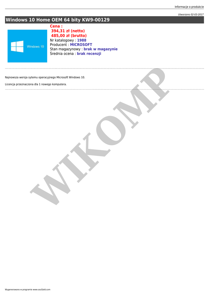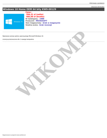 Informacje o produkcie Utworzono 02-03-2017 Windows 10 Home OEM 64 bity KW9-00129 Cena : 394,31 zł (netto) 485,00 zł (brutto) Nr katalogowy : 1988 Producent : MICROSOFT Stan magazynowy : brak w magazynie Średnia ocena : brak recenzji Najnowsza wersja sytemu operacyjnego Microsoft Windows 10. W IK O M P Licencja przeznaczona dla 1 nowego komputera. Wygenerowano w programie www.oscGold.com