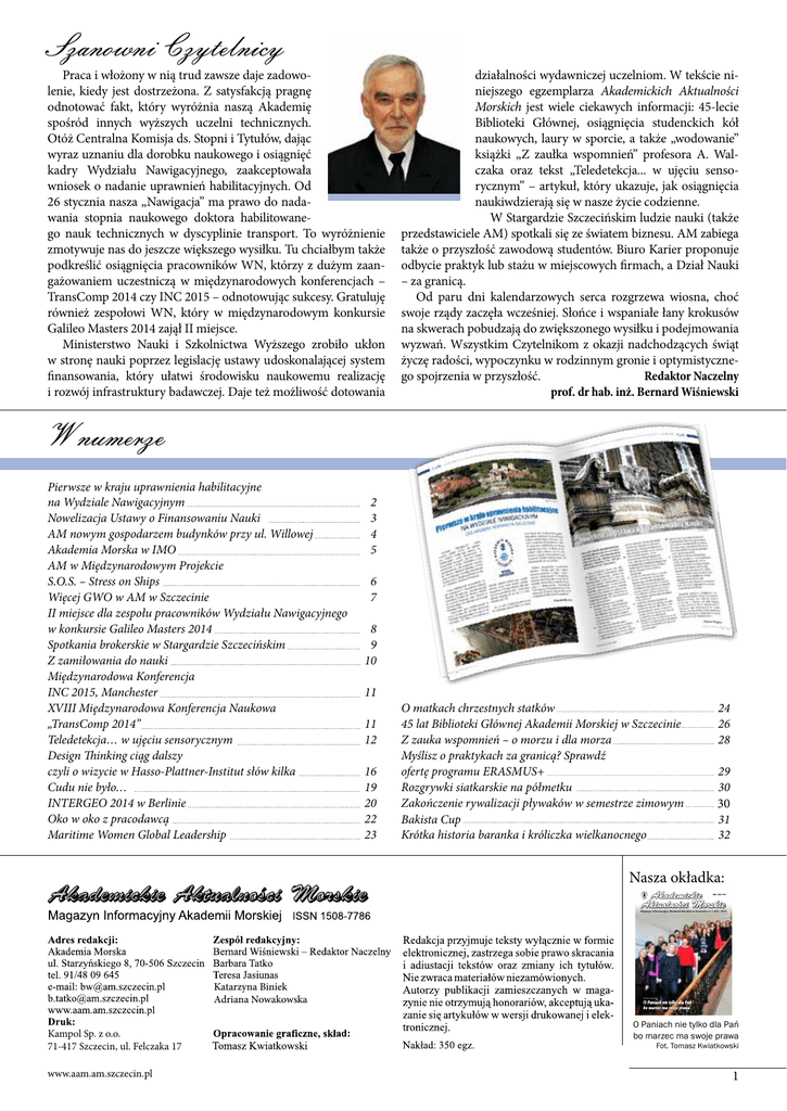Szanowni Czytelnicy Praca i włożony w nią trud zawsze daje zadowolenie, kiedy jest dostrzeżona. Z satysfakcją pragnę odnotować fakt, który wyróżnia naszą Akademię spośród innych wyższych uczelni technicznych. Otóż Centralna Komisja ds. Stopni i Tytułów, dając wyraz uznaniu dla dorobku naukowego i osiągnięć kadry Wydziału Nawigacyjnego, zaakceptowała wniosek o nadanie uprawnień habilitacyjnych. Od 26 stycznia nasza „Nawigacja” ma prawo do nadawania stopnia naukowego doktora habilitowanego nauk technicznych w dyscyplinie transport. To wyróżnienie zmotywuje nas do jeszcze większego wysiłku. Tu chciałbym także podkreślić osiągnięcia pracowników WN, którzy z dużym zaangażowaniem uczestniczą w międzynarodowych konferencjach – TransComp 2014 czy INC 2015 – odnotowując sukcesy. Gratuluję również zespołowi WN, który w międzynarodowym konkursie Galileo Masters 2014 zajął II miejsce. Ministerstwo Nauki i Szkolnictwa Wyższego zrobiło ukłon w stronę nauki poprzez legislację ustawy udoskonalającej system finansowania, który ułatwi środowisku naukowemu realizację i rozwój infrastruktury badawczej. Daje też możliwość dotowania działalności wydawniczej uczelniom. W tekście niniejszego egzemplarza Akademickich Aktualności Morskich jest wiele ciekawych informacji: 45-lecie Biblioteki Głównej, osiągnięcia studenckich kół naukowych, laury w sporcie, a także „wodowanie” książki „Z zaułka wspomnień” profesora A. Walczaka oraz tekst „Teledetekcja... w ujęciu sensorycznym” – artykuł, który ukazuje, jak osiągnięcia naukiwdzierają się w nasze życie codzienne. W Stargardzie Szczecińskim ludzie nauki (także przedstawiciele AM) spotkali się ze światem biznesu. AM zabiega także o przyszłość zawodową studentów. Biuro Karier proponuje odbycie praktyk lub stażu w miejscowych firmach, a Dział Nauki – za granicą. Od paru dni kalendarzowych serca rozgrzewa wiosna, choć swoje rządy zaczęła wcześniej. Słońce i wspaniałe łany krokusów na skwerach pobudzają do zwiększonego wysiłku i podejmowania wyzwań. Wszystkim Czytelnikom z okazji nadchodzących świąt życzę radości, wypoczynku w rodzinnym gronie i optymistycznego spojrzenia w przyszłość. Redaktor Naczelny prof. dr hab. inż. Bernard Wiśniewski W numerze Pierwsze w kraju uprawnienia habilitacyjne na Wydziale Nawigacyjnym Nowelizacja Ustawy o Finansowaniu Nauki AM nowym gospodarzem budynków przy ul. Willowej Akademia Morska w IMO AM w Międzynarodowym Projekcie S.O.S. – Stress on Ships Więcej GWO w AM w Szczecinie II miejsce dla zespołu pracowników Wydziału Nawigacyjnego w konkursie Galileo Masters 2014 Spotkania brokerskie w Stargardzie Szczecińskim Z zamiłowania do nauki Międzynarodowa Konferencja INC 2015, Manchester XVIII Międzynarodowa Konferencja Naukowa „TransComp 2014” Teledetekcja… w ujęciu sensorycznym Design Thinking ciąg dalszy czyli o wizycie w Hasso-Plattner-Institut słów kilka Cudu nie było… INTERGEO 2014 w Berlinie Oko w oko z pracodawcą Maritime Women Global Leadership 2 3 4 5 6 7 8 9 10 11 11 12 16 19 20 22 23 O matkach chrzestnych statków 24 45 lat Biblioteki Głównej Akademii Morskiej w Szczecinie 26 Z zauka wspomnień – o morzu i dla morza 28 Myślisz o praktykach za granicą? Sprawdź ofertę programu ERASMUS+ 29 Rozgrywki siatkarskie na półmetku 30 Zakończenie rywalizacji pływaków w semestrze zimowym30 Bakista Cup 31 Krótka historia baranka i króliczka wielkanocnego 32 Nasza okładka: Magazyn Informacyjny Akademii Morskiej w Szczecinie nr 1 (85) / 2015 Katarzyna Biniek Adriana Nowakowska Kampol Sp. z o.o. 71-417 Szczecin, ul. Felczaka 17 www.aam.am.szczecin.pl W tym numerze: O Paniach nie tylko dla Pań bo marzec ma swoje prawa O Paniach nie tylko dla Pań bo marzec ma swoje prawa Fot. Tomasz Kwiatkowski 1 AAM nr 1 (85) / 2015 Zdjęcia: archiwum Pierwsze w kraju uprawnienia habilitacyjne na Wydziale Nawigacyjnym dla Akademii Morskiej w Szczecinie nie transport oraz geodezja i kartografia. Tym samym miał prawo do prowadzenia studiów doktoranckich (trzeciego stopnia) w wymienionych dyscyplinach. Teraz ma pełne prawa akademickie, co ułatwia rozpoczęcie procedury o nadanie na tym wydziale tytułu profesora (do tej pory wnioski o nadanie tytułu profesora pracownikom Wydziału Nawigacyjnego AM kierowane były na inne uczelnie). Wydział Nawigacyjny naszej uczelni zdobył prawo do nadawania stopnia naukowego doktora habilitowanego nauk technicznych w dyscyplinie transport. Jest tym samym pierwszym w kraju Wydziałem z tymi uprawnieniami dla transportu morskiego. Oprócz Akademii Morskiej w Szczecinie kształcenie na takim wydziale prowadzą jeszcze: Akademia Morska w Gdyni i Akademia Marynarki Wojennej. Prawa habilitacyjne w dziedzinie nauki techniczne, w dyscyplinie transport Wydział Nawigacyjny otrzymał decyzją Centralnej Komisji ds. Stopni i Tytułów 26 stycznia bieżącego roku. Wniosek o nadanie uprawnień złożony został w maju ubiegłego roku. Otrzymanie praw habilitacyjnych to wyraz uznania dla dorobku naukowego Wydziału Nawigacyjnego i osiągnięć naszej kadry. To także potwierdzenie po- 2 tencjału naukowo-badawczego zespołu. Jesteśmy z tego bardzo dumni, z pewnością podnosi to rangę wydziału i daje nam motywację do dalszej pracy – powiedział dziekan wydziału dr inż. kpt. ż.w. Jerzy Hajduk, prof. AM. Do tej pory wydział posiadał prawa do nadawania stopnia doktora w dziedzi- Wydział Nawigacyjny szczecińskiej Akademii Morskiej jest tym samym czwartym wydziałem w kraju z uprawnieniami habilitacyjnymi w dyscyplinie transport (obok Wydziału Transportu Politechniki Warszawskiej, Wydziału Transportu i Elektrotechniki Uniwersytetu Technologiczno-Humanistycznego w Radomiu oraz Wydziału Maszyn Roboczych i Transportu Politechniki Poznańskiej). Bogna Bartkiewicz nr 1 (85) / 2015 AAM Nowelizacja Ustawy o Finansowaniu Nauki Fot. archiwum 4 lutego 
