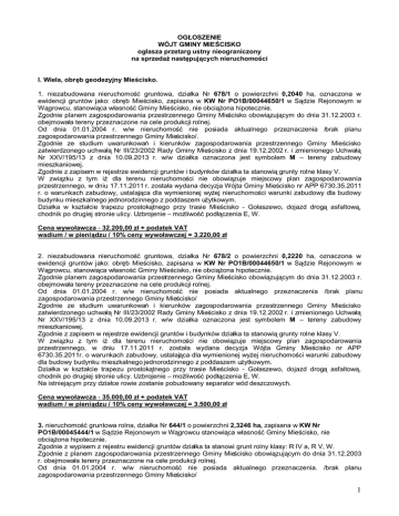 OGŁOSZENIE WÓJT GMINY MIEŚCISKO ogłasza przetarg ustny nieograniczony na sprzedaż następujących nieruchomości I. Wiela, obręb geodezyjny Mieścisko. 1. niezabudowana nieruchomość gruntowa, działka Nr 678/1 o powierzchni 0,2040 ha, oznaczona w ewidencji gruntów jako: obręb Mieścisko, zapisana w KW Nr PO1B/00044650/1 w Sądzie Rejonowym w Wągrowcu, stanowiąca własność Gminy Mieścisko, nie obciążona hipotecznie. Zgodnie planem zagospodarowania przestrzennego Gminy Mieścisko obowiązującym do dnia 31.12.2003 r. obejmowała tereny przeznaczone na cele produkcji rolnej. Od dnia 01.01.2004 r. w/w nieruchomość nie posiada aktualnego przeznaczenia /brak planu zagospodarowania przestrzennego Gminy Mieścisko/. Zgodnie ze studium uwarunkowań i kierunków zagospodarowania przestrzennego Gminy Mieścisko zatwierdzonego uchwałą Nr III/23/2002 Rady Gminy Mieścisko z dnia 19.12.2002 r. i zmienionego Uchwałą Nr XXV/195/13 z dnia 10.09.2013 r. w/w działka oznaczona jest symbolem M – tereny zabudowy mieszkaniowej. Zgodnie z zapisem w rejestrze ewidencji gruntów i budynków działka ta stanowią grunty rolne klasy V. W związku z tym iż dla terenu nieruchomości nie obowiązuje miejscowy plan zagospodarowania przestrzennego, w dniu 17.11.2011 r. została wydana decyzja Wójta Gminy Mieścisko nr APP 6730.35.2011 r. o warunkach zabudowy, ustalająca dla wymienionej wyżej nieruchomości warunki zabudowy dla budowy budynku mieszkalnego jednorodzinnego z poddaszem użytkowym. Działka w kształcie trapezu prostokątnego przy trasie Mieścisko - Gołaszewo, dojazd drogą asfaltową, chodnik po drugiej stronie ulicy. Uzbrojenie – możliwość podłączenia E, W. Cena wywoławcza - 32.200,00 zł + podatek VAT wadium / w pieniądzu / 10% ceny wywoławczej = 3.220,00 zł 2. niezabudowana nieruchomość gruntowa, działka Nr 678/2 o powierzchni 0,2220 ha, oznaczona w ewidencji gruntów jako: obręb Mieścisko, zapisana w KW Nr PO1B/00044650/1 w Sądzie Rejonowym w Wągrowcu, stanowiąca własność Gminy Mieścisko, nie obciążona hipotecznie. Zgodnie planem zagospodarowania przestrzennego Gminy Mieścisko obowiązującym do dnia 31.12.2003 r. obejmowała tereny przeznaczone na cele produkcji rolnej. Od dnia 01.01.2004 r. w/w nieruchomość nie posiada aktualnego przeznaczenia /brak planu zagospodarowania przestrzennego Gminy Mieścisko/ Zgodnie ze studium uwarunkowań i kierunków zagospodarowania przestrzennego Gminy Mieścisko zatwierdzonego uchwałą Nr III/23/2002 Rady Gminy Mieścisko z dnia 19.12.2002 r. i zmienionego Uchwałą Nr XXV/195/13 z dnia 10.09.2013 r. w/w działka oznaczona jest symbolem M – tereny zabudowy mieszkaniowej. Zgodnie z zapisem w rejestrze ewidencji gruntów i budynków działka ta stanowią grunty rolne klasy V. W związku z tym iż dla terenu nieruchomości nie obowiązuje miejscowy plan zagospodarowania przestrzennego, w dniu 17.11.2011 r. została wydana decyzja Wójta Gminy Mieścisko nr APP 6730.35.2011r. o warunkach zabudowy, ustalająca dla wymienionej wyżej nieruchomości warunki zabudowy dla budowy budynku mieszkalnego jednorodzinnego z poddaszem użytkowym. Działka w kształcie trapezu prostokątnego przy trasie Mieścisko - Gołaszewo, dojazd drogą asfaltową, chodnik po drugiej stronie ulicy. Uzbrojenie – możliwość podłączenia E, W. Na istniejącym przy działce rowie zostanie pobudowany separator wód deszczowych. Cena wywoławcza - 35.000,00 zł + podatek VAT wadium / w pieniądzu / 10% ceny wywoławczej = 3.500,00 zł 3. nieruchomość gruntowa rolna, działka Nr 644/1 o powierzchni 2,3246 ha, zapisana w KW Nr PO1B/00045444/1 w Sądzie Rejonowym w Wągrowcu stanowiąca własność Gminy Mieścisko, nie obciążona hipotecznie. Zgodnie z wypisem z rejestru ewidencji gruntów działka ta stanowi grunt rolny klasy: R IV a, R V, W. Zgodnie z planem zagospodarowania przestrzennego Gminy Mieścisko obowiązującym do dnia 31.12.2003 r. obejmowała tereny przeznaczone na cele produkcji rolnej. Od dnia 01.01.2004 r. w/w nieruchomość nie posiada aktualnego przeznaczenia. /brak planu zagospodarowania przestrzennego Gminy Mieścisko/ 1 Zgodnie ze studium uwarunkowań i kierunków zagospodarowania przestrzennego Gminy Mieścisko zatwierdzony uchwałą Nr III/23/2002 Rady Gminy Mieścisko z dnia 19.12.2002 r. i zmieniony Uchwałą Nr XXV/195/13 z dnia 10.09.2013 r. w/w działka oznaczona jest symbolami: O- tereny obejmujące użytki rolne podlegające ochronie D – tereny lasów zalesień korytarzy ekologicznych na użytkach rolnych nie podlegających ochronie i w niewielkiej części AG – tereny aktywizacji gospodarczej. Działka posiada dostęp do drogi publicznej – dojazd drogą gruntową, otoczona polami uprawnymi i zabudową siedliskową. Cena wywoławcza - 70.600,00 zł wadium / w pieniądzu / 10% ceny wywoławczej = 7.060,00 zł Wartości rynkowe dla w/w nieruchomości zostały określone przez rzeczoznawcę majątkowego, w operacie szacunkowym z dnia 22.01.2014 r. Termin do złożenia wniosku przez osoby, którym przysługiwało pierwszeństwo w nabyciu nieruchomości na podstawie art.34 ust.1 pkt 1 i pkt 2 ustawy z dnia 21 sierpnia 1997 r. o gospodarce nieruchomościami /tekst jednolity Dz. U. 2010 Nr 102, poz. 651 z ze zmianami./ minął dnia 31 marca 2014 r. Przetargi odbędą się w dniu 15 maja 2014 r. 1. działka nr 678/1 godz. 9.00 2. działka nr 678/2 godz. 9.30 3. działka nr 644/1 godz. 10.00 w Urzędzie Gminy w Mieścisku, 62-290 Mieścisko Pl. Powstańców Wlkp.13, pok. Nr 18 Wadium w pieniądzu w wysokości 10 % ceny wywoławczej należy wpłacić na konto Gminy Mieścisko w Banku Spółdzielczym Gniezno o/Mieścisko Nr 72 9065 0006 0030 0300 0231 0002 do dnia 12 maja 2014 r. Za datę wpływu wadium uważa się dzień wpływu środków finansowych na wskazany wyżej rachunek bankowy. W przypadku zainteresowania zakupem kilku działek należy wpłacić wadium na każdą działkę odrębnie, z podaniem nr 