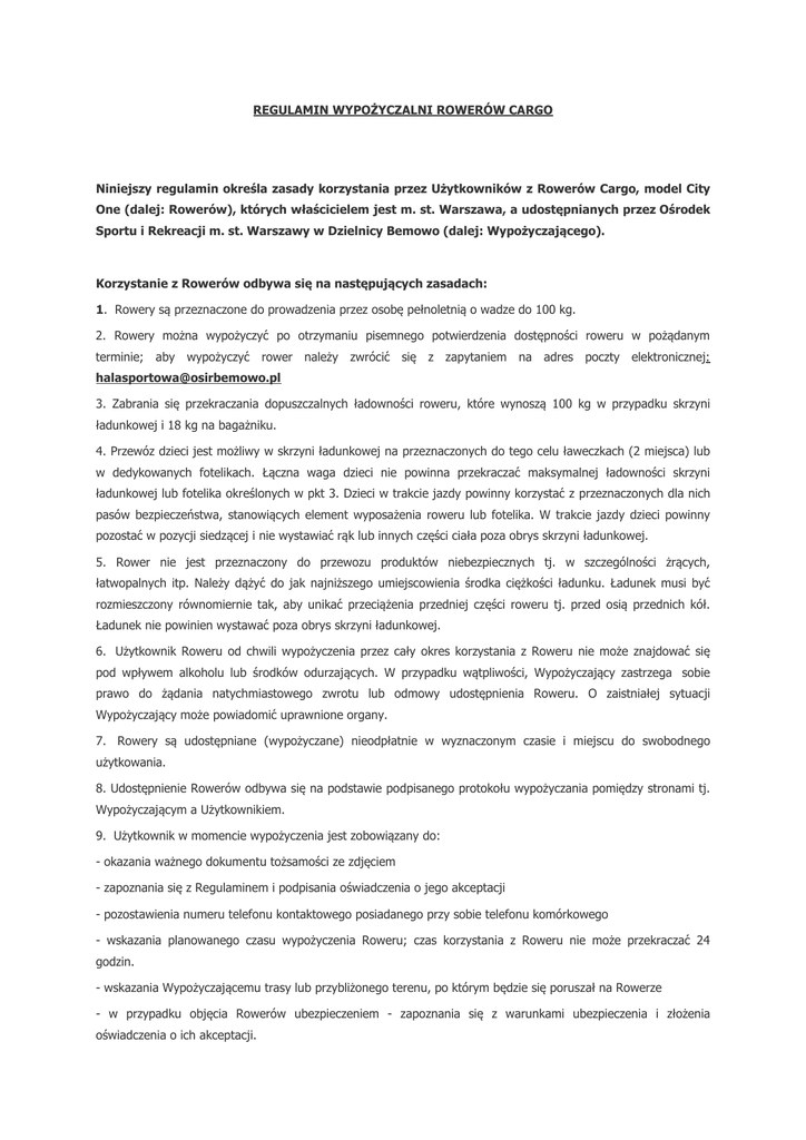 REGULAMIN WYPOŻYCZALNI ROWERÓW CARGO Niniejszy regulamin określa zasady korzystania przez Użytkowników z Rowerów Cargo, model City One (dalej: Rowerów), których właścicielem jest m. st. Warszawa, a udostępnianych przez Ośrodek Sportu i Rekreacji m. st. Warszawy w Dzielnicy Bemowo (dalej: Wypożyczającego). Korzystanie z Rowerów odbywa się na następujących zasadach: 1. Rowery są przeznaczone do prowadzenia przez osobę pełnoletnią o wadze do 100 kg. 2. Rowery można wypożyczyć po otrzymaniu pisemnego potwierdzenia dostępności roweru w pożądanym terminie; aby wypożyczyć rower należy zwrócić się z zapytaniem na adres poczty elektronicznej: [email protected] 3. Zabrania się przekraczania dopuszczalnych ładowności roweru, które wynoszą 100 kg w przypadku skrzyni ładunkowej i 18 kg na bagażniku. 4. Przewóz dzieci jest możliwy w skrzyni ładunkowej na przeznaczonych do tego celu ławeczkach (2 miejsca) lub w dedykowanych fotelikach. Łączna waga dzieci nie powinna przekraczać maksymalnej ładowności skrzyni ładunkowej lub fotelika określonych w pkt 3. Dzieci w trakcie jazdy powinny korzystać z przeznaczonych dla nich pasów bezpieczeństwa, stanowiących element wyposażenia roweru lub fotelika. W trakcie jazdy dzieci powinny pozostać w pozycji siedzącej i nie wystawiać rąk lub innych części ciała poza obrys skrzyni ładunkowej. 5. Rower nie jest przeznaczony do przewozu produktów niebezpiecznych tj. w szczególności żrących, łatwopalnych itp. Należy dążyć do jak najniższego umiejscowienia środka ciężkości ładunku. Ładunek musi być rozmieszczony równomiernie tak, aby unikać przeciążenia przedniej części roweru tj. przed osią przednich kół. Ładunek nie powinien wystawać poza obrys skrzyni ładunkowej. 6. Użytkownik Roweru od chwili wypożyczenia przez cały okres korzystania z Roweru nie może znajdować się pod wpływem alkoholu lub środków odurzających. W przypadku wątpliwości, Wypożyczający zastrzega sobie prawo do żądania natychmiastowego zwrotu lub odmowy udostępnienia Roweru. O zaistniałej sytuacji Wypożyczający może powiadomić uprawnione organy. 7. Rowery są udostępniane (wypożyczane) nieodpłatnie w wyznaczonym czasie i miejscu do swobodnego użytkowania. 8. Udostępnienie Rowerów odbywa się na podstawie podpisanego protokołu wypożyczania pomiędzy stronami tj. Wypożyczającym a Użytkownikiem. 9. Użytkownik w momencie wypożyczenia jest zobowiązany do: - okazania ważnego dokumentu tożsamości ze zdjęciem - zapoznania się z Regulaminem i podpisania oświadczenia o jego akceptacji - pozostawienia numeru telefonu kontaktowego posiadanego przy sobie telefonu komórkowego - wskazania planowanego czasu wypożyczenia Roweru; czas korzystania z Roweru nie może przekraczać 24 godzin. - wskazania Wypożyczającemu trasy lub przybliżonego terenu, po którym będzie się poruszał na Rowerze - w przypadku objęcia Rowerów ubezpieczeniem - zapoznania się z warunkami ubezpieczenia i złożenia oświadczenia o ich akceptacji. 10. Administratorem danych osobowych osób korzystających z wypożyczalni rowerów jest Ośrodek Sportu i Rekreacji m. st. Warszawy w Dzielnicy Bemowo reprezentowany przez Dyrektora z siedzibą w Warszawie przy ul. Oławskiej 3a – „Wypożyczający”. Dane przetwarzane są jedynie w celu wypożyczania rowerów i nie są przekazywane żadnym odbiorcom w rozumieniu art. 7 ust . 6 ustawy o ochronie danych osobowych (Dz. U. z 2014 r. poz. 1182, 1662). Podanie danych jest dobrowolne, niemniej wypożyczenie roweru nie jest możliwe bez ich podania. Osobie, której dane dotyczą, przysługuje prawo dostępu do treści jej danych oraz możliwość ich poprawiania. Pismo z prośbą o usunięcie/zmianę danych powinno zostać wysłane na adres poczty elektronicznej: [email protected] lub listem poleconym na adres Wypożyczającego. 11. Użytkownik jest zobowiązany do: - dbania o powierzony sprzęt, w tym o jego bezpieczeństwo - korzystania ze sprzętu zgodnie z jego przeznaczeniem - posiadania przy sobie przez cały czas korzystania z Roweru sprawnego i aktywnego telefonu komórkowego wskazanego w punkcie poprzednim, jak też utrzymywania przy jego pomocy kontaktu z Wypożyczającym (przyjmowanie połączeń w czasie korzystania z Roweru, z zachowaniem zasad bezpieczeństwa w ruchu) - przestrzegania obowiązujących przepisów ruchu drogowego, przepisów miejscowych i zaleceń Wypożyczającego; - zwrotu Roweru w określonym czasie i stanie niepogorszonym w stosunku do stanu w jakim Rower został wydany. - poinformowania o wszelkich uszkodzeniach lub brakach w wypożyczonym Rowerze - poinformowania o wszelkich szkodach zaistniałych z użyciem Roweru w mieniu osób trzecich. 12. Zabrania się udostępnianie Roweru osobom trzecim przez Użytkownika. 13. Użytkownik ponosi pełną odpowiedzialność materialną za powierzony Rower i za szkody związane z korzystaniem z niego. Wartość ewentualnych szkód zaistniałych w Rowerze określona będzie na podstawie danych wskazanych przez producenta Rowerów. 14. W przypadku awarii lub zaistnienia szkody w mieniu osób trzecich, Użytkownik ma obowiązek natychmiastowego powiadomienia Wypożyczającego o tym fakcie dzwoniąc na następujący numer telefonu: 22 877 44 62 15. W przypadku kolizji z innym uczestnikiem ruchu (rower, samochód, osoba piesza) Użytkownik ma obowiązek poinformowania Wypożyczającego o zaistniałym fakcie na wskazany w punkcie poprzednim numer telefonu i pozostania na miejscu do czasu przyjazdu przedstawiciela Wypożyczającego, o ile nie stoi to w sprzeczności z koniecznością uzyskania opieki medycznej lub udzielenia pomocy medycznej osobie trzeciej. Użytkownik jest zobowiązany do podjęcia kroków zmierzających do minimalizacji zaistniałych szkód i uniknięcia powstania dalszych szkód. 16. W przypadku utraty wypożyczonego Roweru lub jego wyposażenia na skutek kradzieży lub zgubienia 
