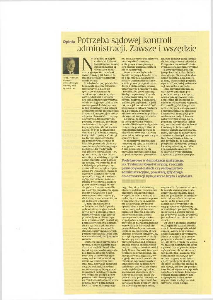Opinia Potrzeba sądowej kontroli administracji. Zawsze i wszędzie Prof. Roman Hauser przewodniczący Krajowej Rady Sądownictwa N ny. Teza, że prawo podmiotowe np. pies domowy canis familiaie sądzę, by współ cześnie ktokolwiek musi wynikać z ustawy, ris jest przyjacielem człowieka. kwestionował zasadę a nie prawa wewnętrznego, Przepis ten ma wartość eduka funkcjonowania są swe miejsce znalazła ostatecz cyjną, ale ona nie może wynikać downictwa admi z aktu prawnego, podlega nie w konstytucji. nistracyjnego. Warto jednak Orzecznictwo Trybunału jącego kontroli sądu admini Konstytucyjnego dowodzi dziś, zwrócić uwagę, jak bardzo po stracyjnego. Na szczęście sfera trzebna jest sądowa kontrola że z procesem legislacyjnym uczuć pozostaje poza kontro administracji. jest źle. Czasem proces stano lą sądu, trudno sobie przecież U schyłku lat 70., gdy władza wienia prawa przypomina ra wyobrazić, na jakiej podstawie fundowała społeczeństwu ko dosną i niefrasobliwą zabawę sąd orzekałby o przyjaźni. lejne kryzysy, a plany go ustawodawcy z ludźmi w kotka Inny przykład przepisu za i myszkę albo grę w reformy. spodarcze nie przynosiły wartego w gminnym pro oczekiwanych skutków, oży gramie ochrony zwierząt to Kto będzie pierwszy? Czy uda się przemycić taką czy inną wiły się dyskusje o utworze norma: psy agresywne i nie niu niezależnego sądownictwa bezpieczne dla otoczenia po normę? Zdążymy z publikacją? administracyjnego. Czyż to nie winny mieć nałożony kaganiec. Zaskarżą do trybunału? A jeśli tak, to w jakim zakresie? Dość swoisty paradoks historyczny, Kto i według jakich reguł ma że tak podstawowe dla ustroju kosztowna to zabawa fundowa ocenić, czy pies jest agresywny demokratycznego instytucje jak na z pieniędzy podatników. i niebezpieczny, czy pieski ras Trybunał Konstytucyjny, rzecz Minister nie powinien publicz karłowatych muszą być pro nik praw obywatelskich czy są wadzone na uwięzi? Zawsze nie wyrażać swojego stosunku downictwo administracyjne, do prawa, deklarując, należy zwrócić uwagę na po że literę prawa ma w nosie. powstały w czasach, gdy droga prawność jurydyczną i języko do demokracji była jeszcze I może zlikwidować sądy, także wą, zrozumiałość sformułowań kręta, wyboista, ale już nie tak i uniknięcie śmieszności. te świetnie pracujące. Skutki tych działań mają bowiem do daleka? W 1980 r. utworzono Często brakuje zwykłej staran Naczelny Sąd Administracyjny, niosłe konsekwencje - zawsze ności, przepisy są nieczytelne, który miał rozpatrywać skargi przecież są jakieś prawa nabyte, a niektóre obowiązki niem oż na decyzje organów władzy. sprawy w toku. liwe do wykonania. Istotne Jak przekonywali ojcowie za jest również to, że naruszenie W mniejszym stopniu inte łożyciele, powstanie pionu są resujemy się tym, co dzieje się przepisów tej uchwały podlega downictwa administracyjnego karze wymierzanej w trybie w organach terenowych. nie będzie dla władzy ludo A tam proces stanowienia i na zasadach określonych wej groźne i niepożądane - ot, prawa nie przebiega lepiej niż w prawie o wykroczeniach. na poziomie prawa powszech sprawdzenie, czy data odpo Zapowiadają się ciekawe po wiednia, czy właściwy urzędnik dobrej pieczątki użył, podpisu Podstawowe w demokracji instytucje, jąc decyzję. We wrześniu 1980 jak Trybunał Konstytucyjny, rzecznik r. dziewięciu pierwszych sę dziów NSA rozpoczęło urzędo praw obywatelskich czy sądownictwo wanie. Po wydaniu pierwszego administracyjne, powstały, gdy droga wyroku w gazetach królował do demokracji była jeszcze kręta i wyboista tytuł „Córal wygrał z wojewo dą” (przedmiotem rozstrzy gnięcia była sprawa z zakresu prawa budowlanego). Wresz stępowania. Cytowana uchwa nego. Skutki tych działań są cie po latach stało się m ożli we nie tylko rozpatrzenie sporu niestety podobne; Na poziomie ła została wydana przez radę między obywatelem a pań gminy dużego miasta, gdzie przepisów gminnych przede wszystkim należy wskazać na stwem przez niezależny sąd, nie ma problemów ze znalezie ale i postępowanie zakończyło nader częste stanowienie prawa niem odpowiednio przygoto wanej kadry prawniczej. z przekroczeniem upoważnie się sukcesem jednostki. O tym, jak ważną rolę nia ustawowego czy też bez Można sobie wyobrażać, jak w świadomości ludzi pełniły wygląda proces legislacyjny upoważnienia. Można tu wska sądy administracyjne, świad w mniejszych gminach. Dla eli zać uchwały rad gmin zwal czy to, że w porozumieniach minowania z obrotu prawne niające od płacenia podatków mimo ustanowienia przez sierpniowych (a więc jeszcze go podobnych aktów potrzebna ustawę obowiązku podatko przed upływem pierwszego jest sądowa kontrola admini wego (podatek od posiadania roku działania NSA) znalazł się stracji. postulat zwiększenia kognicji Od 1980 r. możemy kontrolo psów czy od nieruchomości) lub NSA o sprawy z zakresu cen wać legalność działań admini wprowadzanie instytucji nie zury. Sądownictwo admini przewidzianych przez ustawę stracji. To niewątpliwie wielki (gminny rzecznik praw obywa stracyjne utrzymywało wysoki sukces i ważne uprawnienie poziom orzeczniczy i było trak telskich, konwent sołtysów). Ba, służące każdemu obywatelowi. towane nieomal jako jutrzenka zdarzył się przypadek uchwały Niech ta kontrola ma zawsze świadczący o działaniu ponad wolności. przymiot ważności i zasadno ści, ale oby też nigdy nie dopro prawem: jedna z rad zmieniła Warto tu także przypomnieć granice miasta, chociaż wiado sprawę, z której wynikła teza wadzała do nadużywania drogi aktualna do dziś. Przed NSA mo, że należy to do właściwości sądowej. Czy na pewno zawsze toczył się spór o odmowę nada Rady Ministrów. Akty terenowe sądowa kontrola administracji nia dziecku imienia Aramis. jest niezbędna i zasadna? Czy tworzone s