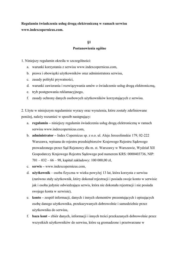 Regulamin świadczenia usług drogą elektroniczną w ramach serwisu www.indexcopernicus.com. §1 Postanowienia ogólne 1. Niniejszy regulamin określa w szczególności: a. warunki korzystania z serwisu www.indexcopernicus.com, b. prawa i obowiązki użytkowników oraz administratora serwisu, c. zasady polityki prywatności, d. warunki zawierania i rozwiązywania umów o świadczenie usług drogą elektroniczną, e. tryb postępowania reklamacyjnego, f. zasady ochrony danych osobowych użytkowników korzystających z serwisu. 2. Użyte w niniejszym regulaminie wyrazy oraz wyrażenia, które zostały zdefiniowane poniżej, należy rozumieć w sposób następujący: a. regulamin – niniejszy regulamin świadczenia usług drogą elektroniczną w ramach serwisu www.indexcopernicus.com, b. administrator – Index Copernicus sp. z o.o. ul. Aleje Jerozolimskie 179, 02-222 Warszawa, wpisana do rejestru przedsiębiorców Krajowego Rejestru Sądowego prowadzonego przez Sąd Rejonowy dla m. st. Warszawy w Warszawie, Wydział XII Gospodarczy Krajowego Rejestru Sądowego pod numerem KRS: 0000403736, NIP: 701 – 032 – 66 – 98, kapitał zakładowy: 100 000,00 zł, c. serwis – www.indexcopernicus.com, d. użytkownik – osoba fizyczna w wieku powyżej 13 lat, która korzysta z serwisu (zarówno stały użytkownik, który dokonał rejestracji i posiada swoje konto w serwisie jak i osoba jedynie odwiedzająca serwis, która nie dokonała rejestracji i nie posiada swojego konta w serwisie), e. konto – zespół informacji, danych i innych elementów prezentujących i opisujących osobę danego użytkownika, przekazywanych dobrowolnie i samodzielnie przez użytkownika do serwisu, f. baza kont – zbiór danych, informacji i innych treści przekazanych dobrowolnie przez wszystkich użytkowników do serwisu, które są gromadzone i przetwarzane w uporządkowany sposób w systemie informatycznym przez administratora za zgodą użytkownika, na potrzeby świadczenia usług serwisu. g. materiały – materiały publikowane w serwisie, w jakiejkolwiek formie (w szczególności w formie: tekstu, grafiki, zdjęć, video, dźwięku). §2 Wymagania techniczne 1. Wymagania techniczne niezbędne do współpracy z system informatycznym, którym posługuje się administrator: a. połączenie z siecią Internet, b. przeglądarka internetowa umożliwiająca wyświetlanie na ekranie komputera dokumentów hipertekstowych w formacie HTML, powiązanych w sieci Internet przez sieciową usługę WWW, obsługującej język oprogramowania JavaScript oraz umożliwiającą zapis plików Cookie, c. w przypadku użytkowników dokonujących rejestracji – posiadanie aktywnego konta poczty elektronicznej, czyli adresu e- mail. §3 Zawarcie umowy i założenie konta 1. Każdorazowe korzystanie z serwisu www.indexcopernicus.com jest równoznaczne z zaakceptowaniem regulaminu i zawarciem umowy o świadczenie usług drogą elektroniczną. 2. Z niniejszym regulaminem użytkownik może zapoznać się za pośrednictwem serwisu www.indexcopernicus.com, oraz pozyskać go i utrwalić bezpłatnie. 3. Użytkownik rozpoczynający korzystanie z serwisu oświadcza, że: a. jest uprawniony do zawarcia umowy o świadczenie usług drogą elektroniczną, b. podane przez niego materiały oraz informacje nie naruszają jakichkolwiek praw osób trzecich, c. zapoznał się z treścią regulaminu, akceptuje regulamin i zobowiązuje się przestrzegać jego postanowień. 4. Użytkownik dokonuje rejestracji w serwisie poprzez wypełnienie formularza rejestracyjnego dostępnego w serwisie. 5. Podczas zakładania konta (rejestracji) użytkownik zobowiązuje się podać prawdziwe, pełne i dokładne informacje wymagane przez administratora. 6. Użytkownik zobowiązuje się do utrzymania w tajemnicy i nie udostępniania osobom trzecim swojego personalnego hasła, niezbędnego do zalogowania się do serwisu. 7. Użytkownik ma możliwość usunięcia swojego konta w serwisie poprzez zalogowanie się w nim i wysłanie przy pomocy formularza kontaktowego prośby o usunięcie swojego konta. Po otrzymaniu takiej prośby, administrator usunie wskazane konto bez zbędnej zwłoki. 8. Zakazane jest przenoszenie praw przysługujących użytkownikowi, wynikających z posiadania konta w serwisie na osoby trzecie. 9. Użytkownik jest uprawniony do administrowania swoim kontem w serwisie, w szczególności do dodawania i aktualizowania danych i informacji w ramach swojego konta. §4 Prawa i obowiązki użytkowników oraz administratora serwisu 1. Użytkownik korzystający z serwisu, zobowiązuje się: a. nie dystrybuować żadnych treści zamieszczonych w serwisie przez administratora, na jakichkolwiek nośnikach bez uzyskania jego uprzedniej pisemnej zgody, b. nie zmieniać treści oraz formy materiałów udostępnionych w serwisie przez administratora bądź też innych użytkowników serwisu, c. nie dokonywać czynności polegających na omijaniu, blokowaniu oraz nie podejmować innego rodzaju działań polegających na zakłócaniu funkcjonowania elementów zabezpieczenia serwisu, d. nie instalować w serwisie żadnego oprogramowania, e. nie zbierać danych osobowych oraz informacji o pozostałych użytkownikach serwisu, f. nie korzystać z serwisu w celu pozyskiwania zleceń w obrocie handlowym lub w związku z prowadzonym przedsiębiorstwem, bez zgody administratora, g. nie umieszczać treści o charakterze bezprawnym w świetle ustawodawstwa i regulacji prawnych Rzeczypospolitej Polskiej, w tym przede wszystkim treści powszechnie uznawanych za obraźliwe i wulgarne, treści przedstawiających przemoc lub namawiających do jej używania, treści propagujących faszyzm, nazizm, komunizm oraz jakichkolwiek treści popierających nienawiść na tle etnicznym, rasowym, narodowościowym i wyznaniowym, h. nie zamieszczać materiałów, które są przedmiotem ochrony praw majątkowych osób trzecich, i. do korzystania z serwisu w sposób zgody z prawem, dobrymi obyczajami