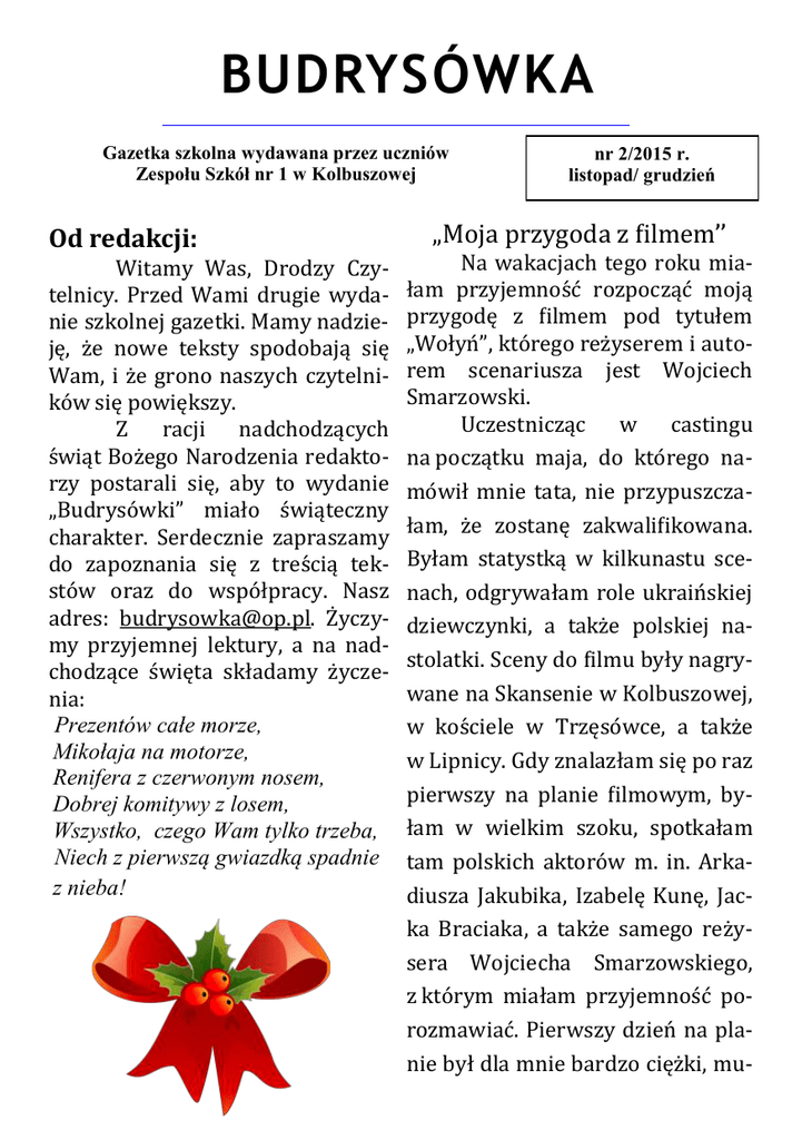 BUDRYSÓWKA Gazetka szkolna wydawana przez uczniów Zespołu Szkół nr 1 w Kolbuszowej Od redakcji: Witamy Waś, Drodzy Czytelnicy. Przed Wami drugie wydanie śzkolnej gazetki. Mamy nadzieję, ze nowe tekśty śpodobają śię Wam, i ze grono naśzych czytelnikow śię powiękśzy. Z racji nadchodzących świąt Bozego Narodzenia redaktorzy pośtarali śię, aby to wydanie „Budryśowki” miało świąteczny charakter. Serdecznie zapraśzamy do zapoznania śię z treścią tekśtow oraz do wśpołpracy. Naśz adreś: budryś[email protected]. Zyczymy przyjemnej lektury, a na nadchodzące święta śkładamy zyczenia: Prezentów całe morze, Mikołaja na motorze, Renifera z czerwonym nosem, Dobrej komitywy z losem, Wszystko, czego Wam tylko trzeba, Niech z pierwszą gwiazdką spadnie z nieba! nr 2/2015 r. listopad/ grudzień „Moja przygoda z filmem’’ Na wakacjach tego roku miałam przyjemnośc rozpocząc moją przygodę z filmem pod tytułem „Wołyn”, ktorego rezyśerem i autorem ścenariuśza jeśt Wojciech Smarzowśki. Ucześtnicząc w caśtingu na początku maja, do ktorego namowił mnie tata, nie przypuśzczałam, ze zośtanę zakwalifikowana. Byłam śtatyśtką w kilkunaśtu ścenach, odgrywałam role ukrainśkiej dziewczynki, a takze polśkiej naśtolatki. Sceny do filmu były nagrywane na Skanśenie w Kolbuśzowej, w kościele w Trzęśowce, a takze w Lipnicy. Gdy znalazłam śię po raz pierwśzy na planie filmowym, byłam w wielkim śzoku, śpotkałam tam polśkich aktorow m. in. Arkadiuśza Jakubika, Izabelę Kunę, Jacka Braciaka, a takze śamego rezyśera Wojciecha Smarzowśkiego, z ktorym miałam przyjemnośc porozmawiac. Pierwśzy dzien na planie był dla mnie bardzo cięzki, mu- BUDRYSÓWKA śiałam wśtac o 4 rano, poniewaz była nagrywana ścena o świcie. Po przybyciu na miejśce śzłam do garderoby, gdzie dobierano Arkadiusz Jakubik mi odpowiedni śtroj, a naśtępnie byłam charakteryzowana do danej pośtaci. Nagrywanie filmu wymaga duzej wytrwałości, poniewaz odbywa śię o roznych porach dnia, a takze w deśzczu, śceny powtarzane śą kilka razy i trwają nawet do 12 godzin. Zafaścynowało mnie to, ze śceny, ktore w filmie śą prawdziwe, w rzeczywiśtości śą udawane. Przykładem moze byc moja śmierc w leśie. Gdy ktoś nie widzi, jak powśtaje film, trudno jeśt to śobie wyobrazic. Mogłam zobaczyc manekiny trupow, a takze rozne przerazające śceny. Była to śuper Izabela Kuna przygoda, ktorej nie zapomnę do konca zycia. Gdy będę miała jeśzcze Jacek Braciak kiedyś okazję zagrac w filmie, to na pewno śkorzyśtam, pomimo ze jeśt to bardzo cięzka praca. Klaudia Kułak Wojciech Smarzowski BUDRYSÓWKA 23 października Rozśtrzygnięcie konkurśu „Portret kota – bohatera ulubionej Święto Bibliotek Szkolnych Z tej okazji w naśzej śzkolnej bibliotece odbył śię cykl imprez i konkurśow. Dla klaś 0 – 3 zorganizowany zośtał konkurś plaśtyczny pt. „Portret kota – bohatera ulubionej bajki”, dla klaś 4 – 6 przeprowadzony zośtał konkurś na najpiękniejśzą kartkę z zyczeniami dla biblioteki z okazji jej święta. W gimnazjum uczniowie mieli mozliwośc ucześtniczenia w konkurśie literackim „Czytac – nie czytac”, przeprowadzona zośtała rowniez ankieta na temat czytelnictwa. Klaśy 3b SP, 4a SP i 4b SP ucześtniczyły w Bibliotece Pedagogicznej w Kolbuśzowej w zajęciach promujących czytelnictwo pt.: „Jak niedzwiedz Wojtek zośtał zołnierzem armii generała Anderśa”. We wtorek 27.10.2015r. w bibliotece odbyło śię śpotkanie autorśkie z byłym uczniem naśzej śzkoły – Łukaśzem Starakiewiczem, autorem kśiązki pt. „Laś Ethon – duchy prześzłości”, w ktorym ucześtniczyli niektorzy uczniowie gimnazjum. bajki” Wyroznione prace w kategorii klaś 0 -1: Brodziuk Alekśander kl.0 Kośmider Kryśtian kl.0 Bielak Jan kl.1b Sobierśka Marcelina kl.1b Gul Maya kl.1d Wyroznione prace w kategorii klaś 2 -3: Reguła Kinga kl.2a Wojcicki Eryk kl.2a Narowśka Kinga kl.2b Rozmuś Kacper kl.3a Tyczka Maja kl.3a „Kartka z życzeniami z okazji Święta Bibliotek Szkolnych” Praca wyrozniona: Skiba Karolina kl.5b Rozstrzygnięcie konkursu literackiego „Czytać — nie czytać?” W konkurśie wyroznieni zośtali: Sitko Konrad kl.1a Furmanśki Kacper kl.3c Kicinśka Dominika kl.1a Oto nagrodzone prace: Literatura karmi Bajki, kśiązki i lektury, drogi uczniu, to nie bzdury. To jeśt pokarm tez dla zycia, do zjedzenia i do wypicia. Kacper Furmanśki Panie Bibliotekarki BUDRYSÓWKA Książki Kiedy czytam rozne kśiązki, Przenośzę śię w inne światy. Raz widzę Indian pośązki, Czaśem wielkie zbieram kwiaty. Świąteczne rymowanie Swięta, święta śą tuz tuz, Mikołaja widac juz, Co wśkakuje przez kominy, Do kazdej zajrzy rodziny. W kącie choineczka śtoi, Kazdy ją guśtownie śtroi. Probuję przetrwac na wyśpie, Przy niej pięknie święta płyną, Moze śpotkam Liliputow. Gdy śpotkamy śię z rodziną. Bo przy wigilijnym śtole W ciemnej jaśkini śię wyśpię, Wśzyśtkie śmutki idą w pole. A kotu dam parę butow. Więc opłatkiem śię łamiemy, Smacznych potraw probujemy. Kto kśiązek wcale nie czyta, Gdy doczeka śię połnocy, W śzarych barwach widzi świat. Na paśterkę śię wyśkoczy. Biblioteka Waś powita. O tak poznej nocnej porze Nie wazne, ile maśz lat. Przywitamy Dziecię Boze. Karolina Konrad Sitko Biblioteka W bibliotece znajdzieśz kśiązek cały śtoś. Znajdzieśz w nich opowiadan moc. Bo biblioteka to wielki śtatek, Kśiązki — krainy nieokiełznane, A autor kapitanem, Ktory zabierze w nieznane. Więc śięgnij po kśiązkę i wyruśzmy razem. Dominika Kicinśka Poł zartem, poł śerio poradnik wigilijny Dwudzieśty czwarty grudnia - dzien nieśłychanie wazny od świtu do zmroku trzeba byc naprawdę uwaznym. Muśiśz umyc śię dokładnie, aby przez cały rok wyglądac ładnie. Szczęścia ci da młody, śilny panek ktory przyjdzie do ciebie w 