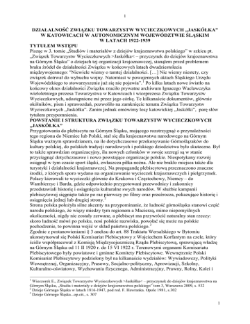 1 DZIAŁALNOŚĆ ZWIĄZKU TOWARZYSTW WYCIECZKOWYCH „JASKÓŁKA” W KATOWICACH W AUTONOMICZNYM WOJEWÓDZTWIE ŚLĄSKIM W LATACH 1922-1939 TYTUŁEM WSTĘPU Pisząc w 3. tomie „Studiów i materiałów z dziejów krajoznawstwa polskiego” w szkicu pt. „Związek Towarzystw Wycieczkowych >Jaskółka< – przyczynek do dziejów krajoznawstwa na Górnym Śląsku” o dziejach tej organizacji krajoznawczej, stanąłem przed problemem braku źródeł do działalności Związku w końcowych latach dwudziestolecia międzywojennego: "Niewiele wiemy o tamtej działalności. […] Nie wiemy niestety, czy związek dotrwał do wybuchu wojny. Natomiast w powojennych aktach Śląskiego Urzędu Wojewódzkiego to stowarzyszenie już się nie pojawia”. 1 Po kilku latach nowe światło na końcowy okres działalności Związku rzuciło prywatne archiwum Ignacego Wacławczyka wieloletniego prezesa Towarzystwa w Katowicach i wiceprezesa Związku Towarzystw Wycieczkowych, udostępnione mi przez jego córkę. Te kilkanaście dokumentów, głównie okólników, pism i sprawozdań, pozwoliło na zamknięcie tematu Związku Towarzystw Wycieczkowych „Jaskółka”. Zanim jednak omówimy losy katowickiej „Jaskółki”, parę słów tytułem przypomnienia. POWSTANIE I STRUKTURA ZWIĄZKU TOWARZYSTW WYCIECZKOWYCH „JASKÓŁKA” Przygotowania do plebiscytu na Górnym Śląsku, mającego rozstrzygnąć o przynależności tego regionu do Niemiec lub Polski, stał się dla krajoznawstwa narodowego na Górnym Śląsku ważnym sprawdzianem, na ile dotychczasowe przekonywanie Górnoślązaków do kultury polskiej, do polskich tradycji narodowych i polskiego dziedzictwa było skuteczne. Był to także sprawdzian organizacyjny, ilu nowych członków w swoje szeregi są w stanie przyciągnąć dotychczasowe i nowo powstające organizacje polskie. Niespotykany rozwój osiągnął w tym czasie sport śląski, zwłaszcza piłka nożna. Ale nie brakło miejsca także dla turystyki i działalności krajoznawczej. Na propagandę plebiscytową przeznaczono znaczne środki, z których sporo wydano na organizowanie wycieczek krajoznawczych i pielgrzymek. Polacy kierowali te wycieczki głównie do Krakowa i Częstochowy, Niemcy – do Wambierzyc i Barda, gdzie odpowiednio przygotowani przewodnicy i zakonnicy przedstawiali historię i osiągnięcia kulturalne swych narodów. W służbie kampanii plebiscytowej sięgnięto także po raz pierwszy po filmy oraz przeźrocza, pokazujące historię i osiągnięcia jednej lub drugiej strony. 2 Strona polska położyła silne akcenty na przypominanie, że ludność górnośląska stanowi część narodu polskiego, że więzy miedzy tym regionem a Macierzą, mimo niepomyślnych okoliczności, nigdy nie zostały zerwane, a plebiscyt ma przywrócić naturalny stan rzeczy: skoro ludność mówi po polsku, nosi polskie nazwiska, powołać się może na polskie pochodzenie, to powinna wejść w skład państwa polskiego. 3 Zgodnie z postanowieniami § 3 aneksu do art. 88 Traktatu Wersalskiego w Bytomiu ukonstytuował się Polski Komisariat Plebiscytowy z Wojciechem Korfantym na czele, który ściśle współpracował z Komisją Międzysojuszniczą Rządu Plebiscytową, sprawującą władzę na Górnym Śląsku od 11 II 1920 r. do 15 VI 1922 r. Terenowymi organami Komisariatu Plebiscytowego były powiatowe i gminne Komitety Plebiscytowe. Wewnętrznie Polski Komisariat Plebiscytowy podzielony był na kilkanaście wydziałów: Wywiadowczy, Polityki Wewnętrznej, Organizacyjny, Prasowy, Socjalno-polityczny, Aprowizacji, Szkolny, Kulturalno-oświatowy, Wychowania fizycznego, Administracyjny, Prawny, Rolny, Kolei i Wieczorek E., Związek Towarzystw Wycieczkowych >Jaskółka< – przyczynek do dziejów krajoznawstwa na Górnym Śląsku, „Studia i materiały z dziejów krajoznawstwa polskiego” tom 3, Warszawa 2009, s. 532 2 Dzieje Górnego Śląska w latach 1816-1947, pod red. F. Hawranka. Opole 1981, s.302 3 Dzieje Górnego Śląska...op.cit., s. 307 1 1 2 Poczt, Kościelny, Gospodarczy, Górniczy, Przemysłu i Handlu, Reemigracyjny, Statystyczny, Centrali druku i papieru, Wydawnictw, Dyplomatyczny, Propagandy zagranicznej, Zdrowia, PCK 4. Jedną z pięciu sekcji Wydziału Wychowania Fizycznego („Sokół”, harcerstwo, sport, Towarzystwo Młodzieży Górnośląskiej) była sekcja IV „Jaskółka”, będąca jednocześnie centralą Związku Towarzystw Wycieczkowych „Jaskółka”, utworzonego 8 VIII 1920 r. Kierownikiem sekcji, a zarazem prezesem Związku, był Z. Wagnerowski 5, skarbnikiem Ludwik Kopiec (równocześnie prezes Towarzystwa w Siemianowicach), a sekretarką M. Fojcikówna. Związek posiadał własną odznakę i jednolite czapki. Na kilku zachowanych archiwalnych fotografiach widać uczestników w charakterystycznych „maciejówkach”. Czapki tak dla druhów, jak i druhen, były szare. Posiadały amarantową obwódkę z białym jedwabnym sznurem i czarnym skórzanym daszkiem. Wprowadzona 8 VIII 1920 r. odznaka miała średnicę ok. 2 cm i była zrobiona z mosiądzu, częściowo emaliowana. W środku na czerwonym tle widniała skrzyżowana gitara i mandolina, nad nimi jaskółka. Wokół biegł biały otok z napisem „ZWIĄZEK TOW. WYC. JASKÓŁKA. GÓRNY ŚLĄSK”. Fot.1 Odznaka ZTW Członkowie Związku pozdrawiali się: „Cześć Jaskółkom!” Związek posiadał strukturę federacyjną: autonomiczne Towarzystwa Wycieczkowe „Jaskółka” przystępowały do Związku Towarzystw Wycieczkowych. Poszczególne Towarzystwa zaczęły powstawać już w lipcu 1920 r., a za datę powstania Związku przyjmuje się 8 VIII 1920 r. Rozwój organizacyjny Związku przerwał w sierpniu 1920 r. wybuch II powstania śląskiego (17/18-28 VIII 1920), ale już w połowie września istniało 21 Towarzystw, skupionych w Związku: Bielszowice (zał.11 VII) 6, Bykowina 7, Bytom, Chorzów, Frydenshuta 8, Godula 9, Janów Miejski 10, Karb 11, Królewska Huta 12, Lipiny (zał. 2 IX) 13, Miechow