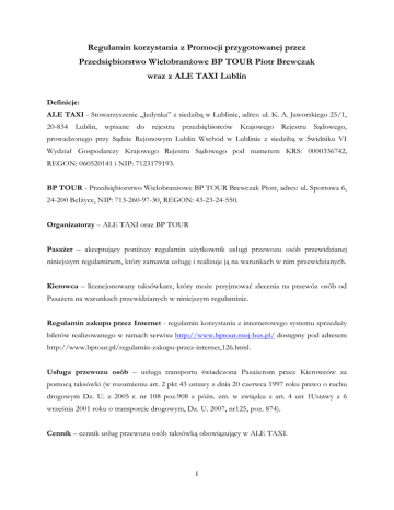 Regulamin korzystania z Promocji przygotowanej przez Przedsiębiorstwo Wielobranżowe BP TOUR Piotr Brewczak wraz z ALE TAXI Lublin Definicje: ALE TAXI - Stowarzyszenie „Jedynka” z siedzibą w Lublinie, adres: ul. K. A. Jaworskiego 25/1, 20-834 Lublin, wpisane do rejestru przedsiębiorców Krajowego Rejestru Sądowego, prowadzonego przy Sądzie Rejonowym Lublin Wschód w Lublinie z siedzibą w Świdniku VI Wydział Gospodarczy Krajowego Rejestru Sądowego pod numerem KRS: 0000336742, REGON: 060520141 i NIP: 7123179193. BP TOUR - Przedsiębiorstwo Wielobranżowe BP TOUR Brewczak Piotr, adres: ul. Sportowa 6, 24-200 Bełżyce, NIP: 713-260-97-30, REGON: 43-23-24-550. Organizatorzy – ALE TAXI oraz BP TOUR Pasażer – akceptujący poniższy regulamin użytkownik usługi przewozu osób przewidzianej niniejszym regulaminem, który zamawia usługę i realizuje ją na warunkach w nim przewidzianych. Kierowca – licencjonowany taksówkarz, który może przyjmować zlecenia na przewóz osób od Pasażera na warunkach przewidzianych w niniejszym regulaminie. Regulamin zakupu przez Internet - regulamin korzystania z internetowego systemu sprzedaży biletów realizowanego w ramach serwisu http://www.bptour.moj-bus.pl/ dostępny pod adresem http://www.bptour.pl/regulamin-zakupu-przez-internet,126.html. Usługa przewozu osób – usługa transportu świadczona Pasażerom przez Kierowców za pomocą taksówki (w rozumieniu art. 2 pkt 43 ustawy z dnia 20 czerwca 1997 roku prawo o ruchu drogowym Dz. U. z 2005 r. nr 108 poz.908 z późn. zm. w związku z art. 4 ust 1Ustawy z 6 września 2001 roku o transporcie drogowym, Dz. U. 2007, nr125, poz. 874). Cennik – cennik usług przewozu osób taksówką obowiązujący w ALE TAXI. 1 Voucher – czek podróżny otrzymywany przez Pasażera przy zakupie biletu autobusowego umożliwiający realizację świadczeń promocyjnych przewidzianych w niniejszym Regulaminie. Regulamin – niniejszy Regulamin. § 1. Ogólne uwagi dotyczące usługi promocyjnej oferowanej przez BP TOUR oraz ALE TAXI 1. Promocja przewidziana jest wyłącznie dla osób, które w ramach jednej transakcji zakupu biletu zakupiły bilet autobusowy na połączenie realizowane przez BP TOUR na trasie Lublin – Kraków na poszczególne kursy z godziny 4,35 , 7,57 , 10,42 , 15,52 oraz powrotne na trasie Kraków – Lublin z godziny 8,10 , 12,15 , 15,15 , 17,50 za pośrednictwem internetowego systemu sprzedaży biletów (serwis www.bptour.mojbus.pl), na warunkach przewidzianych w Regulaminie zakupu przez Internet. 2. Promocja dotyczy kursów autobusowych realizowanych przez BP TOUR w ramach linii Lublin - Kraków oraz Kraków - Lublin, które odbywać się będą odpowiednio z Dworca Autobusowego w Lublinie przy ul. Tysiąclecia lub z Dworca Autobusowego w Krakowie przy ul. Bosackiej. 3. Przy zakupie biletu na przewóz na trasie objętej Promocją, za pośrednictwem serwisu www.bptour.moj-bus.pl, Pasażer wraz z elektronicznym biletem otrzyma voucher o wartości 15 (piętnaście) złotych, który uprawnia go do jednorazowego skorzystania z usługi przewozu osób świadczonej przez ALE TAXI służącej wykonaniu przewozu autobusowego na trasie objętej Promocją. 4. Promocja obowiązuje począwszy od dnia 3 października 2015 roku do czasu jej odwołania. Zakończenie Promocji nie wpływa na prawa nabyte przez korzystających z Promocji w okresie jej trwania. 5. Promocja nie obowiązuje w razie zakupu biletu na przewóz na trasie Lublin - Kraków oraz na trasie Kraków – Lublin w ramach dwóch transakcji sprzedaży biletów oddzielnie dla każdej trasy. 2 § 2. Ogólne warunki korzystania z Vouchera 1. Voucher uprawnia do zniżkowego jednorazowego przejazdu taksówką wyłącznie na trasie od miejsca podstawienia taksówki wskazanego przez Pasażera do Dworca Autobusowego w Lublinie przy ul. Tysiąclecia lub od Dworca Autobusowego w Lublinie przy ul. Tysiąclecia do miejsca wskazanego przez Pasażera, w ramach którego Pasażer zobligowany jest do uiszczenia kierowcy opłaty w wysokości kwoty wyświetlonej na taksometrze pomniejszonej o przysługującą Pasażerowi zniżkę wynikającą, z przysługującego mu vouchera. Voucher nie obowiązuje na innych trasach i nie jest możliwy do wykorzystania w innym dniu niż dzień przewozu realizowany przez BP TOUR w ramach relacji Lublin – Kraków lub Kraków – Lublin. 2. Wartość vouchera wynosi 15 (piętnaście) złotych. 3. Jeżeli kwota wyświetlona na taksometrze będzie równa lub niższa od kwoty przysługującej pasażerowi z tytułu przyznanego mu vouchera, to taka usługa przewozu osób jest traktowana jako usługa bezpłatna, jednocześnie niewykorzystana część przysługującej klientowi zniżki zostaje utracona. Jakakolwiek wypłata ekwiwalentu vouchera w gotówce lub w innej formie nie jest możliwa. W przypadku gdy koszt przejazdu taksówką jest wyższy niż wartość vouchera Pasażer zobligowany jest do zapłaty różnicy za dany kurs bezpośrednio Kierowcy, po zrealizowaniu kursu. 4. Koszt usługi przewozu taksówką obliczany jest zgodnie z Cennikiem obowiązującym ALE TAXI dostępny na www.aletaxi.pl/cennik. § 3. Sposób wykorzystania Vouchera 1. W ramach jednego przejazdu nie można skorzystać jednocześnie z więcej niż jednego vouchera, kodu promocyjnego, zniżki, kuponów czy innych rabatów wpływających na kwotę należną Kierowcy za przejazd. 2. Vouchery obowiązują jedynie do zamówień dokonanych w ramach serwisu www.bptour.moj-bus.pl i na trasach określonych w niniejszym Regulaminie. 3. Voucher, który uległ zagubieniu lub kradzieży, nie może zostać wykorzystany, zabroniona jest również jego odsprzedaż. 3 § 4. Odpowiedzialność Stron 1. W ramach ogólnych warunków przewidzianych niniejszym Regulaminem ALE TAXI ponosi odpowiedzialność za niewykonanie lub nienależyte wykonanie przewozu taksówką na trasie od miejsca rozpoczęcia przewozu do momentu jego zakończenia. Powyższe dotyczy także 