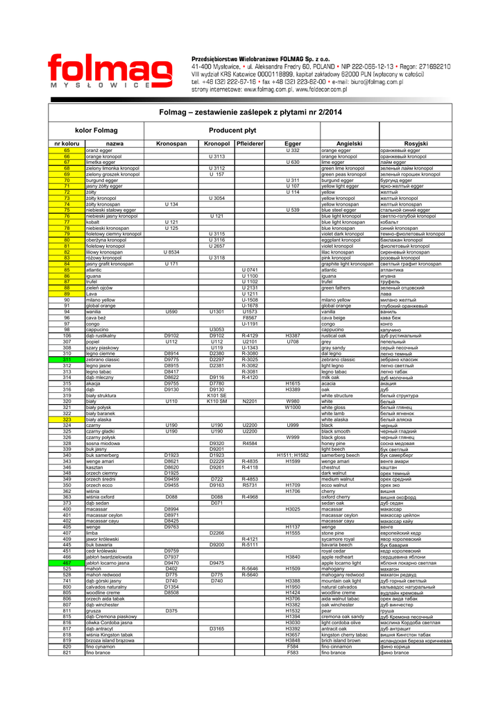 Folmag – zestawienie zaślepek z płytami nr 2/2014 Producent płyt kolor Folmag nr koloru nazwa 65 66 67 68 69 70 71 72 73 74 75 76 77 78 79 80 81 82 83 84 85 86 87 88 89 90 91 94 96 97 98 106 307 308 310 311 312 313 314 315 316 319 320 321 322 323 324 325 326 328 339 340 343 346 348 349 350 362 363 373 400 401 402 405 407 409 445 451 466 467 525 528 741 800 805 806 807 811 815 816 817 818 819 820 821 oranż egger orange kronopol limetka egger zielony limonka kronopol zielony groszek kronopol burgund egger jasny żółty egger żółty żółty kronopol żółty kronospan niebieski stalowy egger niebieski jasny kronopol kobalt niebieski kronospan fioletowy ciemny kronopol oberżyna kronopol fioletowy kronopol liliowy kronospan różowy kronopol jasny grafit kronospan atlantic iguana trufel zieleń ojców Lava milano yellow global orange wanilia cava beż congo cappucino dąb rustikalny popiel szary piaskowy legno ciemne zebrano classic legno jasne legno tabac dąb mleczny akacja dąb biały struktura biały biały połysk biały baranek biały alaska czarny czarny gładki czarny połysk sosna miodowa buk jasny buk samerberg wenge amari kasztan orzech ciemny orzech średni orzech ecco wiśnia wiśnia oxford dąb sedan macassar macassar ceylon macassar cayu wenge limba jawor królewski buk bawaria cedr królewski jabłoń twardzielowata jabłoń locarno jasna mahoń mahoń redwood dąb górski jasny calvados naturalny woodline creme orzech aida tabak dąb winchester grusza dąb Cremona piaskowy oliwka Cordoba jasna dąb antracyt wiśnia Kingston tabak brzoza island brązowa fino cynamon fino brance Kronospan Kronopol Pfleiderer Egger U 332 U 3113 U 630 U 3112 U 157 U 311 U 107 U 114 U 3054 U 134 U 539 U 121 U 121 U 125 U 3115 U 3116 U 2657 U 8534 U 3118 U 171 U590 D9102 U112 D8914 D9775 D8915 D8417 D8622 D9755 D9130 U1301 U3053 D9102 U112 U119 D2380 D2297 D2381 U110 D9116 D7780 D9130 K101 SE K110 SM U190 U190 U 0741 U 1100 U 1102 U 2131 U 1211 U-1508 U-1678 U1573 F8567 U-1191 R-4129 U2101 U-1343 R-3080 R-3025 R-3082 R-3081 R-4120 H3387 U708 H1615 H3389 N2201 W980 W1000 U190 U190 U2200 U2200 U999 D9320 D9201 D1923 D2229 D9261 R4584 R-4835 R-4118 D722 D9163 R-4853 R5731 D088 D071 R-4968 W999 D1923 D8621 D8620 D1925 D9459 D9455 D088 D8994 D8971 D8425 D9763 H1709 H1706 H3025 H1137 H1555 D2266 D9200 D9759 D7937 D9470 D402 D775 D740 D1354 D8508 H1511; H1582 H1599 R-4121 R-5111 H3840 D9475 D775 D740 D375 D3165 R-5646 R-5640 H1509 H3388 H1950 H1424 H3706 H3382 H1532 H1394 H3030 H3392 H3657 H3848 F584 F583 Angielski orange egger orange kronopol lime egger green lime kronopol green peas kronopol burgund egger yellow light egger yellow yellow kronopol yellow kronospan blue steel egger blue light kronopol blue light kronospan blue kronospan violet dark kronopol eggplant kronopol violet kronopol lilac kronospan pink kronopol graphite light kronospan atlantic iguana trufel green fathers milano yellow global orange vanilla cava beige congo cappucino rustical oak grey gray sandy dal legno zebrano classic light legno legno tabac milk oak acacia oak white structure white white gloss white lamb white alaska black black smooth black gloss honey pine light beech samerberg beech wenge amari chestnut dark walnut medium walnut ecco walnut cherry oxford cherry sedan oak macassar macassar ceylon macassar cayu wenge stone pine sycamore royal bavaria beech royal cedar apple redheart apple locarno light mahogany mahogany redwood mountain oak light natural calvados woodline creme aida walnut tabac oak winchester pear cremona oak sandy light cordoba olive antracit oak kingston cherry tabac brich island brown fino cinnamon fino brance Rosyjski оранжевый egger оранжевый kronopol лайм egger зеленый лайм kronopol зеленый горошек kronopol бургунд egger ярко-желтый egger желтый желтый kronopol желтый kronospan стальной синий egger светло-голубой kronopol кобальт синий kronospan темно-фиолетовый kronopol баклажан kronopol фиолетовый kronopol сиреневый kronospan розовый kronopol светлый графит kronospan атлантика игуана труфель зеленый отцовский лава милано желтый глубокий оранжевый ваниль кава беж конго капучино дуб рустикальный пепельный серый песочный легно темный зебрано классик легно светлый легно табак дуб молочный акация дуб белый структура белый белый глянец белый ягненок белый аляска черный черный гладкий черный глянец сосна медовая бук светлый бук самерберг венге амари каштан орех темный орех средний орех эко вишня вишня оксфорд дуб седан макассар макассар цейлон макассар кайу венге европейский кедр явор королевский бук бавария кедр королевский сердцевина яблони яблоня локарно светлая махагон махагон редвуд дуб горный светлый кальвадос натуральный вудлайн кремовый орех аида табак дуб винчестер груша дуб Кремона песочный маслина Кордоба светлая дуб антрацит вишня Кингстон табак исландская береза коричневая фино корица фино brance 824 826 828 829 831 833 834 835 838 840 842 843 844 845 846 847 848 849 850 851 852 853 854 855 856 857 858 859 860 861 862 863 864 865 866 867 868 869 870 871 872 873 930 931 933 936 962 964 965 96