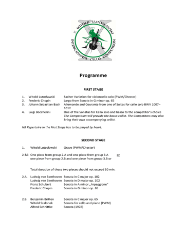 Programme FIRST STAGE 1. 2. 3. Witold Lutosławski Frederic Chopin Johann Sebastian Bach 4. Luigi Boccherini Sacher Variation for violoncello solo (PWM/Chester) Largo from Sonata in G minor op. 65 Allemande and Courante from one of Suites for cello solo BWV 1007– 1012 One of the Sonatas for Cello solo and basso to the competitor's choice The Competition will provide the basso cellist. The Competitors may also bring their own accompanying cellist. NB Repertoire in the First Stage has to be played by heart. SECOND STAGE 1. Witold Lutosławski Grave (PWM/Chester) 2 &3 One piece from group 2.A and one piece from group 3.A one piece from group 2.B and one piece from group 3.B or Total duration of these two pieces should not exceed 30 min. 2.A. Ludwig van Beethoven Ludwig van Beethoven Franz Schubert Frederic Chopin Sonata in C major op. 102 Sonata in D major op. 102 Sonata in A minor „Arpeggione” Sonata in G minor op. 65 2.B. Benjamin Britten Witold Szalonek Alfred Schnittke Sonata in C major op. 65 Sonata for cello and piano (PWM) Sonata (1978) or 3.A. Jerzy Bauer Jerzy Bauer Bela Bartok Henri Dutilleux Andrzej Krzanowski Krzysztof Penderecki Marta Ptaszyńska Paweł Szymański Sonata in one movement for cello and piano (1982) (PWM EDITION) Passacaglia almost in Old Style for Cello and Piano (2011) (PWM EDITION) I. Rhapsody for cello and piano Trois Strophes sur le nom de Sacher Relief V for cello solo (1986) (PWM EDITION) Divertimento for cello solo (1994) (Schott) Moon flowers for cello and piano (1986) (PWM EDITION) A Kaleidoscope for M.C.E. (copy will be sent on candidate's request) 3.B. Robert Schumann Robert Schumann Robert Schumann Antonin Dvorak Addagio and Allegro op.70 Fantasiestücke op.73 Fünf Stücke im Volkston op.102 Rondo in G minor op.94 4 Paweł Mykietyn ............... (5’) Piece commissioned for the X Competition; will be available from November 1, 2014 NB In the Second Stage only Grave by Witold Lutosławski has to be played by heart. FINAL 1. One of the following Concertos: Joseph Haydn Concerto in D major Hob. VIIb:2 Robert Schumann Concerto in A minor op. 129 Witold Lutosławski Concerto for cello and orchestra NB Concertos by Haydn and Schumann have to be played by heart.