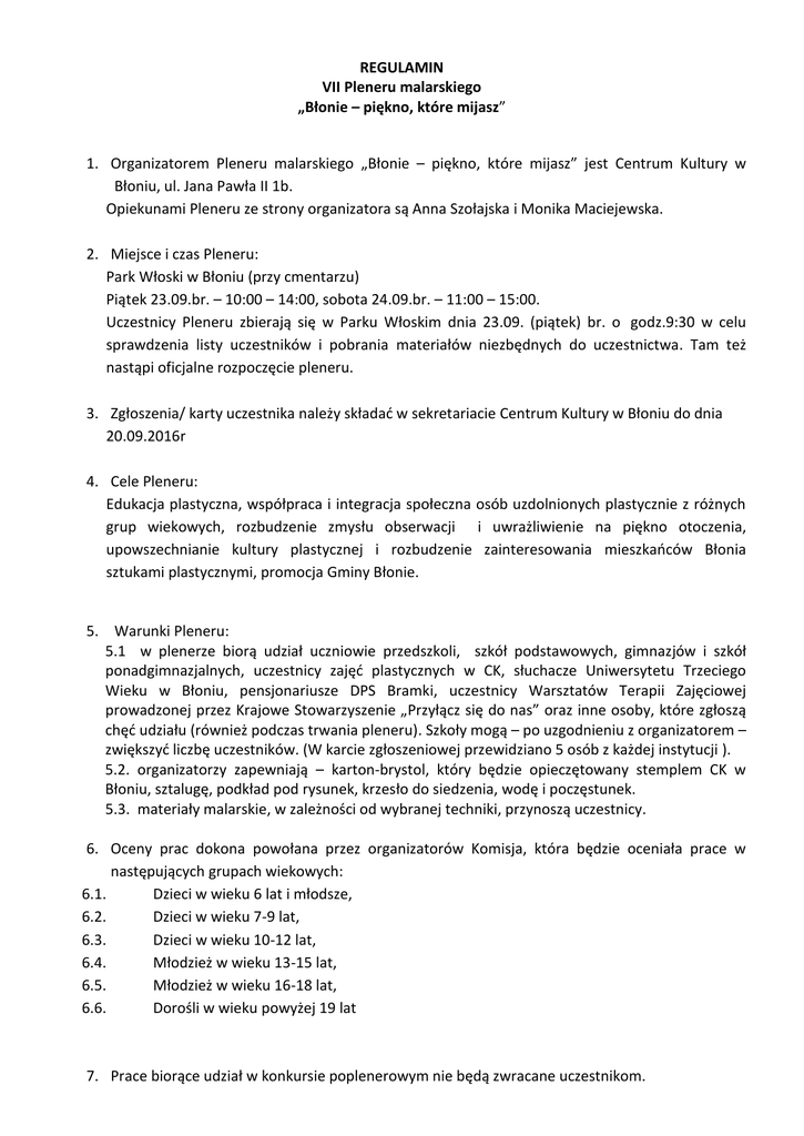 REGULAMIN VII Pleneru malarskiego „Błonie – piękno, które mijasz” 1. Organizatorem Pleneru malarskiego „Błonie – piękno, które mijasz” jest Centrum Kultury w Błoniu, ul. Jana Pawła II 1b. Opiekunami Pleneru ze strony organizatora są Anna Szołajska i Monika Maciejewska. 2. Miejsce i czas Pleneru: Park Włoski w Błoniu (przy cmentarzu) Piątek 23.09.br. – 10:00 – 14:00, sobota 24.09.br. – 11:00 – 15:00. Uczestnicy Pleneru zbierają się w Parku Włoskim dnia 23.09. (piątek) br. o godz.9:30 w celu sprawdzenia listy uczestników i pobrania materiałów niezbędnych do uczestnictwa. Tam też nastąpi oficjalne rozpoczęcie pleneru. 3. Zgłoszenia/ karty uczestnika należy składać w sekretariacie Centrum Kultury w Błoniu do dnia 20.09.2016r 4. Cele Pleneru: Edukacja plastyczna, współpraca i integracja społeczna osób uzdolnionych plastycznie z różnych grup wiekowych, rozbudzenie zmysłu obserwacji i uwrażliwienie na piękno otoczenia, upowszechnianie kultury plastycznej i rozbudzenie zainteresowania mieszkańców Błonia sztukami plastycznymi, promocja Gminy Błonie. 5. Warunki Pleneru: 5.1 w plenerze biorą udział uczniowie przedszkoli, szkół podstawowych, gimnazjów i szkół ponadgimnazjalnych, uczestnicy zajęć plastycznych w CK, słuchacze Uniwersytetu Trzeciego Wieku w Błoniu, pensjonariusze DPS Bramki, uczestnicy Warsztatów Terapii Zajęciowej prowadzonej przez Krajowe Stowarzyszenie „Przyłącz się do nas” oraz inne osoby, które zgłoszą chęć udziału (również podczas trwania pleneru). Szkoły mogą – po uzgodnieniu z organizatorem – zwiększyć liczbę uczestników. (W karcie zgłoszeniowej przewidziano 5 osób z każdej instytucji ). 5.2. organizatorzy zapewniają – karton-brystol, który będzie opieczętowany stemplem CK w Błoniu, sztalugę, podkład pod rysunek, krzesło do siedzenia, wodę i poczęstunek. 5.3. materiały malarskie, w zależności od wybranej techniki, przynoszą uczestnicy. 6. Oceny prac dokona powołana przez organizatorów Komisja, która będzie oceniała prace w następujących grupach wiekowych: 6.1. Dzieci w wieku 6 lat i młodsze, 6.2. Dzieci w wieku 7-9 lat, 6.3. Dzieci w wieku 10-12 lat, 6.4. Młodzież w wieku 13-15 lat, 6.5. Młodzież w wieku 16-18 lat, 6.6. Dorośli w wieku powyżej 19 lat 7. Prace biorące udział w konkursie poplenerowym nie będą zwracane uczestnikom. 8. Organizator zastrzega sobie prawo do wykorzystywania prac i ich zdjęć oraz wizerunku uczestnika do celów promocyjnych Centrum Kultury. 9. Rodzic/opiekun wyraża zgodę na wykorzystanie wizerunku swojego dziecka na potrzeby dokumentujące działalność Centrum Kultury. 10. Zgłoszenie dziecka do uczestnictwa w plenerze jest wyrażeniem zgody na przetwarzanie danych osobowych zgodnie z art. 23 ust.1 z dnia 29 sierpnia 1997 roku o ochronie danych osobowych. Ochrona nie dotyczy udostępniania danych podmiotom trzecim. 11. Zgłoszenie uczestnika do uczestnictwa w plenerze jest jednoznaczne z zapoznaniem się z treścią niniejszego Regulaminu i jego akceptacją. 12. Organizator ma prawo zmienić termin pleneru.