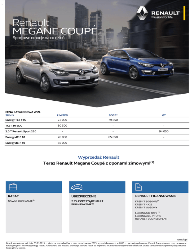3 CENA KATALOGOWA W ZŁ SILNIK LIMITED BOSE® Energy TCe 115 72 000 79 850 TCe 130 EDC 80 300 - - - - 94 050 Energy dCi 110 78 000 85 850 - Energy dCi 130 85 000 - - 2.0 T Renault Sport 220 GT Wyprzedaż Renault Teraz Renault Megane Coupé z oponami zimowymi(1) RABAT NAWET DO 9 500 ZŁ (2) UBEZPIECZENIE RENAULT FINANSOWANIE 2,5% Z OFERTĄ RENAULT FINANSOWANIE (3) KREDYT 50/50 0% (4) KREDYT 4X25 KREDYT ULGOWY LEASING OD 102% (5) LEASING ALL-IN-ONE RENAULT BUSINESS PLAN Cennik obowiązuje od dnia 03.11.2015 r., dotyczy samochodów z roku modelowego 2015, wyprodukowanych w 2015 r., spełniających normę Euro 6. Prezentowane ceny są cenami katalogowymi i nie uwzględniają rabatu. Oferowana dla modelu promocja zawiera rabat od Importera i Autoryzowanego Partnera Re nault. Liczba samochodów w promocji ograniczona. Szczegóły w salonie . Limited Bose® GT ABS z systemem wspomagania nagłego hamowania (AFU) ● ● ● System dynamicznej kontroli toru jazdy (ESC) ● ● ● System wspomagania przy ruszaniu pod górę (HSA) ● ● ● System kontroli ciśnienia w oponach ● ● ● 1 600 P P Regulator-ogranicznik prędkości ● ● ● Automatycznie włączane światła awaryjne w przypadku gwałtownego hamowania ● ● ● Czołowe poduszki powietrzne kierowcy i pasażera dostosowujące się do siły zderzenia ● ● ● Możliwość ręcznej dezaktywacji poduszki powietrznej pasażera z przodu ● ● ● Boczne poduszki powietrzne chroniące klatkę piersiową i miednicę osób siedzących na przednich miejscach ● ● ● Poduszki kurtynowe ● ● ● Sygnalizacja dźwiękowa niezapięcia pasa bezpieczeństwa kierowcy i pasażera z przodu ● ● ● 3-punktowe pasy bezpieczeństwa, z napinaczami dostosowującymi się do siły zderzenia i ogranicznikami napięcia, na przednich miejscach ● ● ● 3-punktowe pasy bezpieczeństwa na tylnych miejscach ● ● ● Zagłówki na przednich i tylnych miejscach ● ● ● System mocowania fotelika dla dziecka Isofix na bocznych tylnych miejscach ● ● ● Elektronicznie kodowany system blokady zapłonu ● ● ● Blokowanie/odblokowywanie drzwi w trakcie jazdy ● ● ● Elektryczne, zmienne wspomaganie układu kierowniczego ● ● ● Ręczny hamulec postojowy ● ● ● Automatyczny hamulec postojowy, elektromechaniczny P 1 060 1 060 / P Komputer pokładowy ● ● ● Analogowy obrotomierz i cyfrowy prędkościomierz ● ● - Analogowy obrotomierz i prędkościomierz - - ● BEZPIECZEŃSTWO CZYNNE I BIERNE Visio System® ZABEZPIECZENIE SAMOCHODU PROWADZENIE POJAZDU - URZĄDZENIA KONTROLNE Karta Renault ze zdalnym sterowaniem centralnego zamka drzwi ● - ● Karta Renault Hands Free P ● 1 060 / P System wspomagania parkowania tyłem ● - ● System wspomagania parkowania przodem i tyłem - ● 800 System wspomagania parkowania tyłem, z kamerą cofania - - 1 200 System wspomagania parkowania przodem i tyłem, z kamerą cofania - P P System R.S. Monitor - - 1 060 System R.S. Monitor 2.0 - - 1 060 Światła przeciwmgłowe ● ● - Światła do jazdy dziennej LED ● ● ● Funkcja oświetlenia drogi do domu ● ● ● Wycieraczki przedniej szyby o zmiennej częstotliwości pracy, z czujnikiem deszczu ● ● P Lusterko wewnętrzne o 2 położeniach (dzień/noc) ● - ● Elektrochromatyczne lusterko wewnętrzne ● P Podświetlane lusterka w osłonach przeciwsłonecznych ● P WIDOCZNOŚĆ – OŚWIETLENIE KOMFORT Klimatyzacja manualna - - ● Klimatyzacja automatyczna, dwustrefowa ● ● P Lusterka boczne elektrycznie sterowane i składane oraz podgrzewane ● ● ● Elektrycznie podnoszone szyby przednie ● ● ● Centralny zamek drzwi, bagażnika i klapki wlewu paliwa ● ● ● Kierownica z regulacją wysokości i głębokości, pokryta skórą ● ● ● ● FOTELE – SCHOWKI Fotel kierowcy z regulacją wysokości i podparcia lędźwiowego ● ● Fotel kierowcy z regulacją elektryczną - P - 850 850 / P 850 Środkowa konsola z podłokietnikiem i schowkiem ● ● ● Tylna kanapa w układzie 1/3 - 2/3 ● ● ● Fotele przednie podgrzewane Limited Bose® GT MULTIMEDIA System nawigacji Carminat TomTom® Live P - P System multimedialny R-Link Evolution P ● P Mapa Europy - wersja podstawowa P - - Mapa Europy - wersja rozszerzona P ● P Radioodtwarzacz R-Plug&Radio+ ● ● Radioodtwarzacz R-Plug&Radio+ kompatybilny z systemem multimedialnym R-Link P - P Bose® Energy Efficient Series Sound System kompatybilny z systemem multimedialnym R-Link ● P Tonacja wnętrza - grafit ● ● ● Tapicerka materiałowa ● - Tapicerka materiałowa łączona z elementami skóry ekologicznej ● ● Tapicerka skórzana łączona z elementami alcantary i skóry ekologicznej 5 300 - Tapicerka skórzana łączona z elementami skóry ekologicznej 5 300 Aluminiowe nakładki na pedały ● Nakładki na progi drzwi "Renault Sport" ● Zewnętrzne klamki drzwi w kolorze nadwozia ● ● - Obudowy lusterek bocznych w kolorze lśniącej czerni ● ● - Zderzak przedni o specyficznym kształcie z oznakowaniem GT oraz tylny dyfuzor - - ● Obudowy lusterek bocznych i zewnętrzne klamki drzwi w kolorze ciemnoszarym - - ● Ozdobna chromowana wstawka w grillu przednim - ● - Boczne listwy ochronne drzwi w kolorze nadwozia ● ● ● Dach panoramiczny, stały 3 200 3 200 3 200 Szyby tylne przyciemniane ● ● 540 Obręcze kół ze stopu metali lekkich 16" ● - - Obręcze kół ze stopu metali lekkich 17" 1 060 ● - Obręcze kół ze stopu metali lekkich 18" - - ● WYGLĄD WEWNĘTRZNY WYGLĄD ZEWNĘTRZNY Zestaw do naprawy uszkodzenia opony ● ● - 310 310 ● Lakier metalizowany 2 100 2 100 2 100 Lakier metalizowany specjalny QNC 2 800 2 800 2 800 Lakier metalizowany specjalny RNT - - 2 800 - - 1 600 - 3 500 - - - 250 2 500 - 2 500 - 3 000 3 000 1 990 - - - - 2 500 3 900 - 3 900 - 5 100 Koło zapasowe dojazdowe (wyklucza zestaw do naprawy uszkodzenia opony) PAKIETY WYPOSAŻENIA Pakiet Komfort: klimatyzacja automatyczna, dwustr