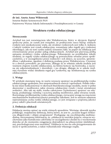 Regionalne i lokalne diagnozy edukacyjne dr inż. Aneta Anna Wiktorzak Instytut Badań Systemowych PAN Państwowa Wyższa Szkoła Informatyki i Przedsiębiorczości w Łomży Struktura rynku edukacyjnego Streszczenie Artykuł ten jest rozwinięciem idei Walukiewicza, który w skrypcie Kapitał społeczny pisze, że rynek jest wszędzie, że praktycznie rzecz biorąc różnych rynków jest nieskończenie wiele, ale struktur rynkowych jest tylko 6. Jednym z takich rynków jest rynek edukacyjny, rozumiany jako reguły gry rynkowej określające, jak na tym rynku należy rozumieć fakt, że popyt na edukację jest równoważony przez podaż usług edukacyjnych. Artykuł jest pierwszą próbą opisania struktury rynku edukacyjnego. Pokazujemy na przykładzie szkoły średniej, że reguły rynku edukacyjnego są powszechnie uważne przez społeczeństwo, a w szczególności przez rodziców i ich dzieci, za uczciwe, sprawiedliwe i adekwatne, zgodnie z definicją podaną przez Walukiewicza. Czynimy to z dwóch powodów: po pierwsze, dlatego że to właśnie szkoła średnia jest ważnym etapem ścieżki edukacyjnej, na której kończy się beztroska, a zaczyna się odpowiedzialność i dorosłość, i po drugie, dlatego że w szkole średniej wyraźnie widać działania reguł gry rynkowej, np. konkurencję na rynku edukacyjnym. 1. Wstęp W artykule stawiamy tezę, że warto wreszcie spojrzeć na problematykę rynku edukacyjnego spokojnie, bez niepotrzebnych emocji i uprzedzeń. Polska szkoła nie musi funkcjonować w okowach biurokratycznego modelu, może w pełni skorzystać z możliwości, jakie stwarza edukacyjny rynek i świat oświatowej wolności. Aby tak się stało, trzeba całościowo (systemowo) spojrzeć na edukację, podejmując rzetelną i uczciwą analizę możliwości, jakie stwarza rynek. Rozważając problematykę rynku edukacyjnego, zwracamy uwagę na znaczenie mechanizmów konkurencyjności pomiędzy szkołami. Jest to naszym zdaniem najważniejsza cecha rynku edukacyjnego, co jest związane z poprawą jakości pracy szkół i placówek oświatowych. 2. Definicja edukacji Edukację można opisać na wiele różnych sposobów. Wertując słownik języka polskiego, znajdziemy definicję, która mówi, że jest to „uczenie kogoś zwłaszcza długotrwale i objęte programem”. Posługując się encyklopedią multimedialną, otrzymujemy informację, że „edukacja to szerokie pojęcie, oznacza wychowanie jako kształcenie człowieka (w szczególności chodzi tu o wychowanie dziecka aż do momentu osiągnięcia dojrzałości) na płaszczyźnie intelektualnej, psychologicznej oraz moralnej”. Edukacja ta ma na celu przygotowanie do życia w społeczeństwie, a także wykształcenie własnego osądu. 277 XVIII Konferencja Diagnostyki Edukacyjnej, Wrocław 2012 Zdecydowanie bardziej wyczerpujące temat wyjaśnienie znajduje się w reformie edukacji. Podana tam informacja mówi, że „edukacja to realizacja programu ewolucji istoty ludzkiej w toku całego życia z myślą o integralnym rozwoju w zakresie umysłowym, fizycznym, afektywnym, moralnym, duchowym, proces obejmujący nie tylko przekazywanie wiedzy i umiejętności, szeroko pojętych wartości kultury, lecz także inspirowanie postawy twórczej, otwartej, samodzielności myślenia, zdolności do samokształcenia”. Edukacja, według Wincentego Okonia, jest to ogół procesów i oddziaływań, których celem jest zmienianie ludzi, przede wszystkim dzieci i młodzieży, stosownie do panujących w danym społeczeństwie ideałów i celów wychowawczych. Obecnie upowszechnia się szerokie rozumienie tego terminu jako oznaczającego ogół procesów oświatowo-wychowawczych, obejmujących kształcenie i wychowanie oraz szeroko pojmowaną oświatę. Jak wynika z definicji, edukacja nie jest czymś ustalonym odgórnie, narzuconym i jednakowym dla wszystkich. W różnych krajach pojmowana jest inaczej, jest mniej lub bardziej nastawiona na wiedzę teoretyczną i odwrotnie - na praktyczną. Edukacja według Zbigniewa Kwiecińskiego to ogół wpływów na jednostki i grupy ludzkie, sprzyjających takiemu ich rozwojowi, aby w najwyższym stopniu stały się one świadomymi i twórczymi członkami wspólnoty społecznej, kulturowej i narodowej oraz były zdolne do aktywnej samorealizacji własnej tożsamości i własnego JA poprzez podejmowanie zadań ponadosobistych. Edukacja według Tarzycjusza Bulińskiego to „zbiorowe wychowanie, przekazujące wiedzę niezbędną do funkcjonowania jednostek w społeczeństwie jako członków jakiejś grupy, zorganizowane czasowo i przestrzennie w powtarzalny sposób, będące przy tym częścią codzienności i realizowane przez ludzi specjalnie w tym celu powołanych”. Edukacja według Stephena J. Balla „przygotowuje uczniów nie tylko do podporządkowania się władzy, ale także - przynajmniej niektórych spośród nich - do akcentowania swojej podmiotowości”. Tak więc edukacja - z łac. educatio - to wychowanie, a pojęcie to wiąże się z rozwojem intelektualnym i wiedzą człowieka. Edukacja to wychowanie, a wychowanie to, inaczej mówiąc, wykształcenie, nauka, proces polegający na zdobywaniu wiedzy w szkole lub poza nią. Przez termin edukacja rozumiemy także określenie poziomu wiedzy danej osoby, społeczeństwa lub państwa. Inaczej rzecz ujmując, jest to wartość kapitału ludzkiego pojedynczej istoty, jak też i całego społeczeństwa danego kraju. Jest to ogół czynności polegający na zdobywaniu, przekazywaniu, kształtowaniu cech i umiejętności. Wyróżnia się cztery etapy edukacji: formalną zwaną też szkolną, nieoficjalną, nieformalną, akcydentalną. W pierwszej fazie, jak sama nazwa na to wskazuje, na edukację wpływa szkoła, w tym studia, szkolenia i certyfikaty. W drugiej fazie uczymy się sami, zdobywamy nowe umiejętności, zwykle bez uzyskania dyplomu, a faza trzecia trwa całe życie, ponieważ ciągle się uczymy i zdobywamy coraz to nowsze