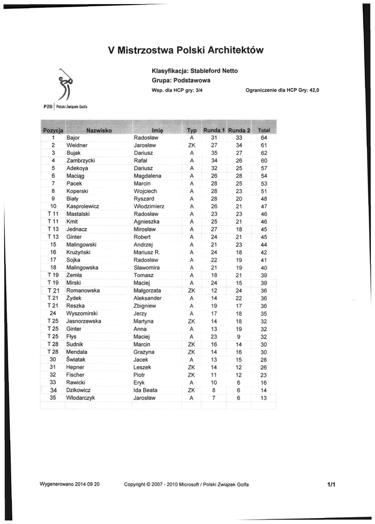 t flG V Mistrzostwa Polski Architektów Klasyfikacja: Stableford Netto Grupa: Podstawowa Wsp. dla HCP gry: 3/4 Ogr aniczen Polski J«ia;elkSn;ra Pozycja 1 2 3 4 5 6 7 8 g 10 T11 T11 T13 T 13 15 16 17 18 T19 T 19 T 21 T 21 T 21 24 T 25 T 25 T 25 T 28 T 28 30 . 31 32 33 34 35 Nazwisko Bajor Weidner Bujak Zambrzycki Adekoya Maciąg Pacek Koperski Biały Kasprolewicz Mastalski Kmit Jednacz Ginter Malingowski Krużyński Sojka Malingowska Zemła Mirski Romanowska Żydek Reszka Wyszomirski Jasnorzewska Ginter Fłys Sudnik Mendala Światak Hepner Fischer Rawicki Dzikowicz Włodarczyk Wygenerowano 2014 09 20 Imię Radosław Jarosław Dariusz Rafał Dariusz Magdalena Marcin Wojciech Ryszard Włodzimierz Radosław Agnieszka Mirosław Robert Andrzej Mariusz R. Radosław Sławomira Tomasz Maciej Małgorzata Aleksander Zbigniew Jerzy Martyna Anna Maciej Marcin Grażyna Jacek Leszek Piotr Eryk Idą Beata Jarosław Typ Runda 1 Runda 2 A ZK A A A A A A A A A A A A A A A A A A ZK A A A ZK A A ZK ZK A ZK ZK A ZK A 31 27 35 34 32 26 28 28 28 26 23 25 27 24 21 24 22 21 18 24 12 14 19 17 14 13 23 16 14 13 14 11 10 8 7 33 34 27 26 25 28 25 23 20 21 23 21 18 21 23 18 19 19 21 15 24 22 17 18 18 19 9 14 16 15 12 12 6 6 6 Copyright © 2007 - 2010 Microsoft / Polski Związek Golfa Total 64 61 62 60 57 54 53 51 48 47 46 46 45 45 44 42 41 40 39 39 36 36 36 35 32 32 32 30 30 28 26 23 16 14 13 1/1 V Mistrzostwa Polski Architektów Klasyfikacja: Strokeplay Brutto Grupa: Podstawowa iOgraniczę Wsp. dla HCP gry: 3/4 H9li MMMM* MU «aS&S«i^Ł|jBi^fc:,: 1 Bujak HMHMMiMMr^ Dariusz 2 Zambrzycki Rafał 3 4 «.->., « ,•.•».>... Koperski Adekoya . . . i , . . . , . . . • : • : . . " ' . HifHflBSM • -••'"•''" 93 175 88 98 186 192 A 82 A Wojciech A 91 101 Dariusz A 91 102 193 --..••. ..., . T5 Mastalski Radosław A 102 101 203 T5 Bajor Radosław A 103 100 203 7 Kasprolewicz Włodzimierz A 96 108 204 8 Krużyński Mariusz R. A 102 107 209 T9 Jednacz Mirosław A 101 112 213 T9 Biały Ryszard A 101 112 213 T11 Pacek Marcin A 106 114 220 107 113 220 109 113 222 D A Ginter Robert 13 Kmit Agnieszka 14 Sojka Radosław A 111 115 226 15 Maciąg Magdalena A 116 111 227 16 Weidner Jarosław ZK 120 111 231 17 Zemła Tomasz A 122 113 235 T18 Kruk Wojciech jnr A 114 123 237 T 18 Fłys Maciej A 110 127 237 20 Wyszomirski Jerzy A 122 116 238 21 Reszka Zbigniew A 120 123 243 T11 22 Malingowska Sławomira A 123 121 244 23 Żydek Aleksander A 127 118 245 24 Malingowski Andrzej A 128 126 254 25 Jasnorzewska Martyna ZK 130 129 259 26 Mirski Maciej A 122 138 260 27 Światak Jacek A 137 129 266 28 Romanowska Małgorzata ZK 145 131 276 29 Ginter Anna A 146 132 278 A 30 Rawicki Eryk 147 139 286 31 Sudnik Marcin ZK 156 138 294 32 Fischer Piotr ZK 140 156 296 33 Mendala Grażyna ZK 154 152 306 34 Włodarczyk Jarosław A 166 141 307 V Mistrzostwa Polski Architektów Klasyfikacja: Strokeplay Brutto Grupa: Podstawowa Wsp. dla HCP gry: 3/4 MM M** MM Ograniczenie dla HCP Gry: 42,0 Net Stableford - Round #1 Fos. Name l 1 AdamTobo 3 a Round l MP Architektów -Turniej Zielonej Karty 2 3 4 5 6 7 8 9 Out 10 11 12 13 14 15 16 17 18 In Gross Net TO&OtĄ 1 1 0 0 0 0 0 0 0 2 0 0 0 1 0 1 0 0 1 3 3 2 1 2 0 0 1 2 1 12 2 1 0 3 1 3 1 1 2 14 5 26 3 2 Marcin Jab onski ( Round l 3AE>toN/SKJ2 0 0 0 0 0 0 1 0 4 0 0 2 1 0 0 3 2 3 0 1 1 0 0 0 0 1 0 3 6 12 2 3 3 2 0 1 0 2 0 13 25 3 Wojciech Siudowski Round l 0 0 0 0 0 0 0 0 0 0 0 0 1 0 0 0 2 0 0 0 0 0 0 0 0 0 0 0 3 0 0 0 0 1 0 0 0 0 0 0 0 0 0 0 0 0 0 0 0 0 1 0 0 0 2 0 0 3 0 l O 4 4 Maria Hepner Round l 0 0 0 0 0 0 0 0 0 0 0 0 0 0 0 0 0 0 0 0 O 3