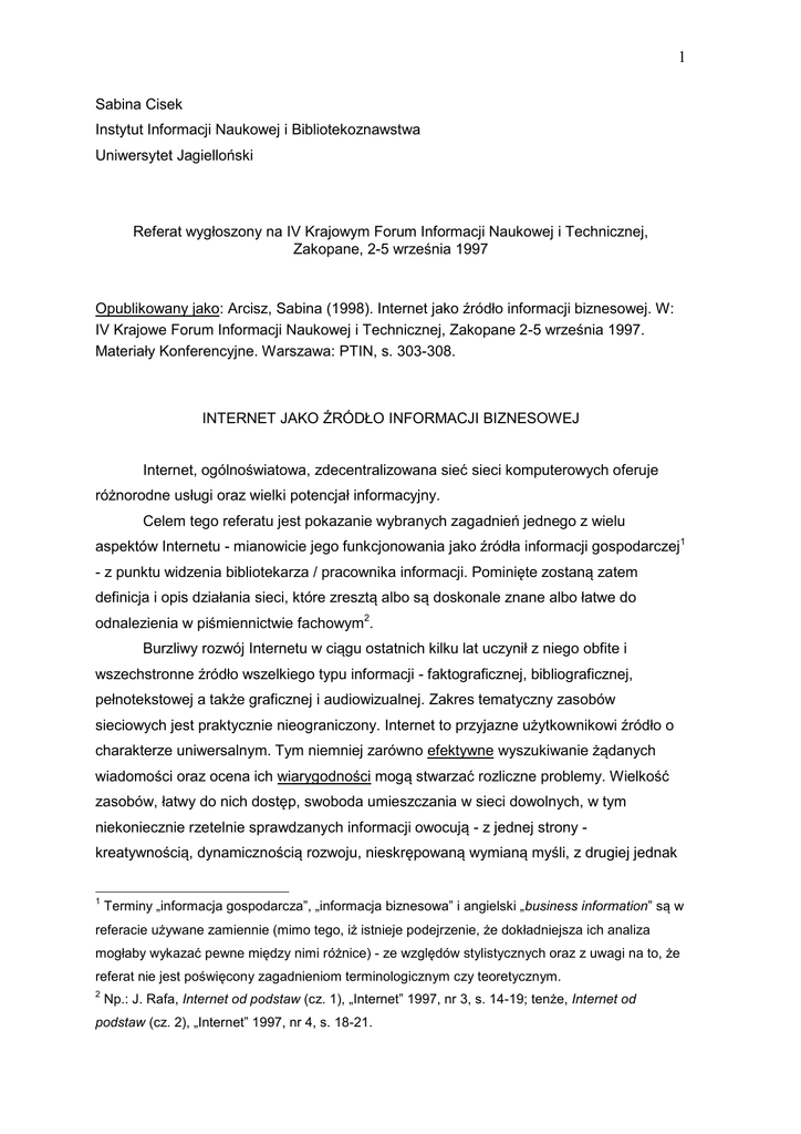 1 Sabina Cisek Instytut Informacji Naukowej i Bibliotekoznawstwa Uniwersytet Jagielloński Referat wygłoszony na IV Krajowym Forum Informacji Naukowej i Technicznej, Zakopane, 2-5 września 1997 Opublikowany jako: Arcisz, Sabina (1998). Internet jako źródło informacji biznesowej. W: IV Krajowe Forum Informacji Naukowej i Technicznej, Zakopane 2-5 września 1997. Materiały Konferencyjne. Warszawa: PTIN, s. 303-308. INTERNET JAKO ŹRÓDŁO INFORMACJI BIZNESOWEJ Internet, ogólnoświatowa, zdecentralizowana sieć sieci komputerowych oferuje różnorodne usługi oraz wielki potencjał informacyjny. Celem tego referatu jest pokazanie wybranych zagadnień jednego z wielu aspektów Internetu - mianowicie jego funkcjonowania jako źródła informacji gospodarczej1 - z punktu widzenia bibliotekarza / pracownika informacji. Pominięte zostaną zatem definicja i opis działania sieci, które zresztą albo są doskonale znane albo łatwe do odnalezienia w piśmiennictwie fachowym2. Burzliwy rozwój Internetu w ciągu ostatnich kilku lat uczynił z niego obfite i wszechstronne źródło wszelkiego typu informacji - faktograficznej, bibliograficznej, pełnotekstowej a także graficznej i audiowizualnej. Zakres tematyczny zasobów sieciowych jest praktycznie nieograniczony. Internet to przyjazne użytkownikowi źródło o charakterze uniwersalnym. Tym niemniej zarówno efektywne wyszukiwanie żądanych wiadomości oraz ocena ich wiarygodności mogą stwarzać rozliczne problemy. Wielkość zasobów, łatwy do nich dostęp, swoboda umieszczania w sieci dowolnych, w tym niekoniecznie rzetelnie sprawdzanych informacji owocują - z jednej strony kreatywnością, dynamicznością rozwoju, nieskrępowaną wymianą myśli, z drugiej jednak 1 Terminy „informacja gospodarcza”, „informacja biznesowa” i angielski „business information” są w referacie używane zamiennie (mimo tego, iż istnieje podejrzenie, że dokładniejsza ich analiza mogłaby wykazać pewne między nimi różnice) - ze względów stylistycznych oraz z uwagi na to, że referat nie jest poświęcony zagadnieniom terminologicznym czy teoretycznym. 2 Np.: J. Rafa, Internet od podstaw (cz. 1), „Internet” 1997, nr 3, s. 14-19; tenże, Internet od podstaw (cz. 2), „Internet” 1997, nr 4, s. 18-21. 2 strony - mogą być powodem wspomnianych trudności. Rozwiązaniem oczywiście nie jest wprowadzenie jakiejś centralnej kontroli, cenzury itp. lecz wypracowanie skutecznych metod poruszania się po „oceanie” informacji. Bibliotekarze i pracownicy informacji potrafią zresztą robić to od zarania istnienia naszej profesji, zmienia się tylko - pod względem formy i treści - świat informacji. Referat jest próbą wskazania - w ogólnym zarysie i wyborze - efektywnych sposobów pracy z wirtualną informacją biznesową. Wyjaśnienia domaga się termin „informacja biznesowa”. Ogólnie rzecz biorąc jest to albo informacja o treści gospodarczej (kryterium merytoryczne) albo informacja dla biznesu, przydatna dla podejmowania decyzji i ostatecznie służąca osiągnięciu celu działania firm, tj. zdobyciu zysków (kryterium celu)3. Dodać należy, iż różne aspekty zagadnienia Internetu jako źródła informacji gospodarczej doczekały się w Polsce własnych opracowań4. Także międzynarodowe środowisko profesjonalnych bibliotekarzy i pracowników informacji naukowej zauważyło już dobrych kilka lat temu, iż Internet może być tutaj nieocenionym źródłem. Anglojęzyczna literatura przedmiotu w tym zakresie jest obfita. Periodyki z dziedziny bibliotekoznawstwa i informacji naukowej oraz pokrewnych zamieszczają wiele wypowiedzi omawiających problematykę informacji biznesowej w Internecie5. Można pokusić się o stwierdzenie, iż wszystkie obecnie oferowane w Internecie usługi - email, listy dyskusyjne, ftp, gopher, telnet, WWW etc. mogą spełniać rolę źródła 3 Dokładniejsze omówienie informacji biznesowej jako takiej, jej użytkowników, potrzeb informacyjnych w tym zakresie etc. znajduje się m.in. w moim referacie wygłoszonym na III Krajowym Forum: S. Arcisz, Potrzeby informacyjne w gospodarce rynkowej, „III Krajowe Forum Informacji Naukowej i Technicznej, Jastrzębie-Zdrój 29.05 - 2.06.1995 r. Materiały Konferencyjne”, [Warszawa 1995]. 4 Np.: W kolejnych - począwszy od nr 4/ 1997 - numerach miesięcznika „Internet”ukazuje się rubryka pod red. Leszka Nowaka Firma w Internecie. Sieciowy poradnik dla ludzi biznesu; cykl publikacji Tomasza Smolenia w czasopiśmie „Marketing w Praktyce”: Marketing w Internecie, 1996 nr 9/10, s. 5-8, Reklama w sieci, 1996 nr 11, s. 12-13, Marketing na stronach WWW, 1996 nr 12, s. 5-8; W. Gawarecki, Handel w Internecie, „Dziennik Polski” 27 marzec 1997, s. 43; Z. Ruszczyk, Internet w biznesie, Gdańsk 1997. 5 Np. - anglojęzyczne wydawnictwa ciągłe: „The Information Advisor”, „Internet Research”, „InfoAlert”, „Business Information Alert: Sources, Strategies and Signposts for Information Professionals” (http://www.alertpub.com), „Journal of Business and Finance Librarianship”. Przykładowe artykuły - poświęcone wybranym zagadnienion z zakresu informacji biznesowej: M. Riley, Riley’s Guided Tour: Job Searching on the Net, „Library Journal” 1996, vol. 121, no. 15, pp. 24-27; C. Murphy, J. McLaughlin, Discover: Financial Information, „Managing Information” March 1997, vol. 4, no. 3, pp. 27-30. 3 informacji gospodarczej i ekonomicznej. Szczególnie interesujące wydają się jednakowoż poczta elektroniczna, listy dyskusyjne oraz World Wide Web. Email Poczta elektroniczna rozważana w kontekście informacji biznesowej jest - w oczywisty sposób - medium dla bezpośredniej wymiany wiadomości między zainteresowanymi użytkownikami, specjalistami business information oraz przedstawicielami świata biznesu. Bibliotekarze z reguły pracują z opublikowanymi źródłami, informacją pochodną - a ich profesjonalizm polega m.in