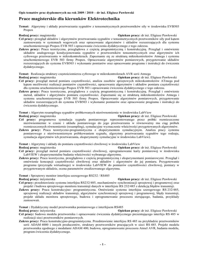 Opis tematów prac dyplomowych na rok 2009 / 2010 – dr inŜ. Eligiusz Pawłowski Prace magisterskie dla kierunków Elektrotechnika Temat: Algorytmy i układy przetwarzania sygnałów z tensometrycznych przetworników siły w środowisku EVB503 Propox Rodzaj pracy: magisterska Opiekun pracy: dr inŜ. Eligiusz Pawłowski Cel pracy: przegląd układów i algorytmów przetwarzania sygnałów z tensometrycznych przetworników siły pod kątem zastosowania w systemach wagowych oraz opracowanie algorytmów i układów rozszerzających dla systemu uruchomieniowego Propox EVB 503 i opracowanie ćwiczenia dydaktycznego z tego zakresu. Zakres pracy: Praca teoretyczna, przeglądowa z częścią programistyczną i konstrukcyjną. Przegląd i omówienie układów analogowego kondycjonowania sygnałów z przetworników tensometrycznych oraz algorytmów ich cyfrowego przetwarzania w mikrokontrolerach. Zapoznanie się ze strukturą mikrokontrolerów Atmega i systemu uruchomieniowego EVB 503 firmy Propox. Opracowanie algorytmów pomiarowych, przygotowanie układów rozszerzających do systemu EVB503 i wykonanie pomiarów oraz opracowanie programu i instrukcji do ćwiczenia dydaktycznego. Temat: Realizacja struktury częstościomierza cyfrowego w mikrokontrolerach AVR serii Atmega Rodzaj pracy: magisterska Opiekun pracy: dr inŜ. Eligiusz Pawłowski Cel pracy: przegląd metod pomiaru częstotliwości, analiza zasobów sprzętowych mikrokontrolerów ATmega pod kątem moŜliwości realizacji pomiarów częstotliwości, opracowanie algorytmów i układów pomiaru częstotliwości dla systemu uruchomieniowego Propox EVB 503 i opracowanie ćwiczenia dydaktycznego z tego zakresu. Zakres pracy: Praca teoretyczna, przeglądowa z częścią programistyczną i konstrukcyjną. Przegląd i omówienie metod, układów i algorytmów pomiaru częstotliwości. Zapoznanie się ze strukturą mikrokontrolerów Atmega i systemu uruchomieniowego EVB 503 firmy Propox. Opracowanie algorytmów pomiarowych, przygotowanie układów rozszerzających do systemu EVB503 i wykonanie pomiarów oraz opracowanie programu i instrukcji do ćwiczenia dydaktycznego. Temat : Algorytm resamplingu sygnałów próbkowanych nierównomiernie w środowisku LabView Rodzaj pracy: magisterska Opiekun pracy: dr inŜ. Eligiusz Pawłowski Cel pracy: programowa symulacja sygnału pomiarowego reprezentowanego przez próbki rozmieszczone nierównomiernie w czasie i układu pomiarowego do jego przetwarzania w równowaŜny mu ciąg próbek rozmieszczonych równomiernie (resampling), symulacyjne wyznaczenie właściwości przygotowanych algorytmów. Zakres pracy: Praca teoretyczno-programistyczna z eksperymentem symulacyjnym. Analiza pracy systemu pomiarowego z nierównomiernym próbkowaniem sygnału, algorytmy przetwarzania sygnałów tego rodzaju, symulacja algorytmów ich przetwarzania, eksperymenty symulacyjne w środowisku LabView). Temat : Algorytmy i układy do pomiaru częstotliwości chwilowej w środowisku LabView Rodzaj pracy: magisterska Opiekun pracy: dr inŜ. Eligiusz Pawłowski Cel pracy: przegląd metod pomiaru częstotliwości chwilowej, oprogramowanie karty pomiarowej w środowisku LabVIEW i eksperymentalne badania właściwości wybranego algorytmu. Zakres pracy: Praca teoretyczna, przeglądowa z częścią programistyczną i eksperymentami pomiarowymi. Przegląd i omówienie koncepcji częstotliwości chwilowej oraz układów i algorytmów do jej pomiaru. Przygotowanie programu (przyrządu wirtualnego) w środowisku LabVIEW do pomiarów częstotliwości chwilowej, pomiary w przygotowanym układzie, ocena parametrów zrealizowanego algorytmu. Temat : Sprzętowy monitor interfejsu szeregowego RS232 / RS485 Rodzaj pracy: inŜynierska Opiekun pracy: dr inŜ. Eligiusz Pawłowski Cel pracy: przedstawienie systemu interfejsu RS232/485, mechanizmów synchronizacji sprzętowej i programowej oraz projekt i budowa sprzętowego monitora transmisji danych w interfejsie RS 232/485 z detekcją błędów transmisji. Zakres pracy: Praca konstrukcyjno- programistyczna. Omówienie systemu interfejsu szeregowego RS 232/485, sprzętowej realizacji układów transmisji, algorytmów synchronizacji sprzętowej i programowej, błędy transmisji, projekt układu monitora sprzętowego, budowa i oprogramowanie procesora sterującego, badania, przykłady zastosowań. Temat : Dydaktyczny model przetwornika pomiarowego z interfejsem RS485 Rodzaj pracy: inŜynierska Opiekun pracy: dr inŜ. Eligiusz Pawłowski Cel pracy: budowa modelu przetwornika i opracowanie ćwiczenia dydaktycznego prezentującego interfejs RS 485 w realizacji sieci przetworników pomiarowych. Zakres pracy: Praca konstrukcyjno-programistyczna. Przedstawienie interfejsu RS 485 na przykładzie przetworników serii ADAM 4000 i innych producentów, struktury przetworników pracujących w sieci RS 485. Projekt modelu przetwornika zgodnego z modułami ADAM 400, budowa, oprogramowanie procesora Atmel AVR, badania modelu, program ćwiczenia dydaktycznego. -1- Opis tematów prac dyplomowych na rok 2009 / 2010 – dr inŜ. Eligiusz Pawłowski Temat : Źródło częstotliwości wzorcowej synchronizowane sygnałem GPS Rodzaj pracy: magisterska Opiekun pracy: dr inŜ. Eligiusz Pawłowski Cel pracy: zaprojektowanie, budowa i badania źródła częstotliwości wzorcowej synchronizowanego sygnałem GPS. Zakres pracy: Praca konstrukcyjna z elementami programistycznymi i eksperymentalnymi. Przegląd współczesnych systemów dystrybucji częstotliwości wzorcowej na falach bardzo długich (VLF), długich (np. 225 kHz), w systemach telewizyjnych, nawigacyjnych i innych, ze szczególnym uwzględnieniem systemu GPS. Budowa i oprogramowanie systemu mikroprocesorowego współpracującego z gotowym odbiornikiem systemu GPS wykorzystującego sygnał sekundowy PPS do synchronizacji lokalnego generatora VCXO, generującego wysokostabilny sygnał częstotliwości wzorcowej. Temat : Synchronizacja rozproszonych systemów pomiarowy