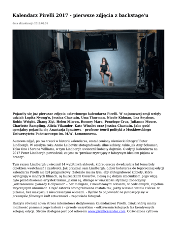 Kalendarz Pirelli 2017 - pierwsze zdjęcia z backstage'u data aktualizacji: 2016.08.31 Pojawiły się już pierwsze zdjęcia osławionego kalendarza Pirelli. W najnowszej sesji wzięły udział: Lupita Nyong’o, Jessica Chastain, Uma Thurman, Nicole Kidman, Lea Seydoux, Robin Wright, Zhang Ziyi, Helen Mirren, Rooney Mara, Penelope Cruz, Julianne Moore, Charlotte Rampling, Alicia Vikander, Kate Winslet oraz Jessica Chastain. Jako gość specjalny pojawiła się Anastazja Ignatowa – profesor teorii polityki z Moskiewskiego Uniwersytetu Państwowego im. M.W. Łomonosowa. Autorem zdjęć, po raz trzeci w historii kalendarza, został ceniony niemiecki fotograf Peter Lindbergh. W zeszłym roku Annie Leibovitz sfotografowała silne kobiety, takie jak Amy Schumer, Yoko Ono i Serena Williams, w tym Lindbergh uwiecznił kobiety dojrzałe. O edycji Kalendarza na 2017 Peter Lindbergh powiedział, że jest to "przekaz zrywający z fałszywym ideałem piękna w branży". Tym razem Lindbergh uwiecznił 14 wybitnych aktorek, które jeszcze dwadzieścia lat temu były obiektem westchnień i zazdrości. Jak przyznał sam Lindbergh, dobór bohaterek do tegorocznej edycji kalendarza Pirelli nie był przypadkowy. Zależało mu na tym, aby sfotografować kobiety, które występują w mądrych filmach, są laureatkami Oscarów, cieszą się dużym szacunkiem. Jego wizją było przedstawienie artystek takimi, jakimi są, dlatego w większości stylizacji zobaczymy „odczarowane gwiazdy Hollywood” – bez makijażu, z nieułożonymi włosami, w codziennych, zupełnie zwyczajnych ubraniach. Część aktorek sfotografowana została tak, jakby właśnie wstała z łóżka: w piżamie, bez makijażu z nieuczesanymi włosami. - Będzie to odpowiedź na panoszący się w przemyśle filmowym kult sztuczności – zapowiada fotograf. Ruszyła również nowa strona internetowa dedykowana Kalendarzowi Pirelli, dzięki której mamy możliwość poznania jego historii i – przede wszystkim – odkrywania kolejnych faz kreatywnych kolejnej edycji. Strona dostępna jest pod adresem www.pirellicalendar.com. Odświeżona cyfrowa platforma, dzięki filmom, fotografiom i różnorodnym ekskluzywnym wywiadom, umożliwia odwiedzającym zagłębienie się w ponad 50-letnią historię The Cal TM. Daje również możliwość poznania kulis powstawania nowego kalendarza oraz podążania krok po kroku wraz z jego autorem Peterem Lindberghiem, w narodzinach The Cal 2017, który ujrzy światło dzienne pod koniec listopada. O Kalendarzu Pirelli Od narodzin w 1964 roku, Kalendarz Pirelli traktowany był jako prestiżowe wydawnictwo. Wyznacza upływ czasu poprzez fotografie najwyżej cenionych fotografów swoich epok, interpretując współczesną kulturę i kreując trendy. Ten najbardziej znany na świecie kalendarz stał się ikoną mody, fotografii i stylu. Kalendarz do dziś nie jest dostępny w sprzedaży. Otrzymywali go jedynie najwybitniejsi koneserzy sztuki – filmowcy, aktorzy, muzycy, artyści i oczywiście najważniejsi klienci firmy Pirelli. Na świecie ukazuje się zaledwie kilkanaście tysięcy egzemplarzy. Pierwszy egzemplarz tradycyjnie przekazywany jest brytyjskiej królowej. Do Polski w 2016 roku trafiło niespełna 100 sztuk. Źródło: