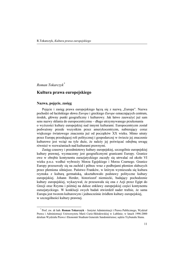 R.Tokarczyk, Kultura prawa europejskiego Roman Tokarczyk * Kultura prawa europejskiego Nazwa, pojęcie, zasięg Pojęcie i zasięg prawa europejskiego łączą się z nazwą „Europa”. Nazwa pochodzi od łacińskiego słowa Europa i greckiego Europe oznaczających centrum, środek, główny punkt geograficzny i kulturowy. Jak łatwo zauważyć już sam sens nazwy skłania do europocentryzmu – długo utrzymywanego przekonania o wyższości kultury europejskiej nad innymi kulturami. Europocentryzm został podważony przede wszystkim przez amerykocentryzm, nabierający coraz większego światowego znaczenia już od początków XX wieku. Mimo utraty przez Europę przodującej roli politycznej i gospodarczej w świecie jej znaczenie kulturowe jest wciąż na tyle duże, że należy jej poświęcać odrębną uwagę również w rozważaniach nad kulturami prawnymi. Zasięg czasowy i przedmiotowy kultury europejskiej, szczególnie europejskiej kultury prawnej, wyznaczony jest geograficznymi granicami Europy. Granice owe w obrębie kontynentu eurazjatyckiego zaczęły się utrwalać od około VI wieku p.n.e. wzdłuż wybrzeży Morza Egejskiego i Morza Czarnego. Granice Europy przesuwały się na zachód i północ wraz z podbojami plemion słabszych przez plemiona silniejsze. Państwo Franków, w którym wymieszała się kultura rzymska z kulturą germańską, ukształtowało podstawy polityczne kultury europejskiej. Johann Herder, historiozof niemiecki, badający pochodzenie kultury europejskiej, wykazywał, że przesuwała się ona z Azji przez Egipt do Grecji oraz Rzymu i później na dalsze enklawy europejskiej części kontynentu eurazjatyckiego. W konkluzji swych badań stwierdził nader trafnie, że sama Europa jest tworem kulturowym i jednocześnie źródłem kultury europejskiej, w szczególności kultury prawnej. * Prof. zw. dr hab. Roman Tokarczyk – Instytut Administracji i Prawa Publicznego, Wydział Prawa i Administracji Uniwersytetu Marii Curie-Skłodowskiej w Lublinie; w latach 1996-2000 dziekan Wydziału Prawa i Ekonomii Studium Generale Sandomiriense; sędzia Trybunału Stanu. 11 Studia Europejskie, 1/2000 Pojęcie kultury prawa europejskiego stało się podstawą wyodrębnienia kultury prawnej Zachodu. Wyodrębniając z wieloznacznego pojęcia „Zachód” jego sens kulturowy, przyjmujemy pogląd, że kultura prawna Zachodu ukształtowała się jako synkretyczna całość złożona z elementów starożytnej kultury greckiej, rzymskiej i judeochrześcijańskiej. Kulturę ową scalało w jedność władztwo kościelne i państwowe o ambicjach uniwersalistycznych. Długo kulturę Zachodu nazywano kulturą okcydentalną jako odmienną od kultury orientalnej, obejmującej kraje islamskie, Indie i Daleki Wschód. Po II wojnie światowej pojęcia „Zachód” i „Wschód” były wykorzystywane dla kontrastowego przeciwstawiania krajów kapitalistycznych krajom socjalistycznym. Wpływy kultury Zachodu w różnym czasie zaznaczyły swoją obecność w Ameryce Północnej, Ameryce Południowej, Australii i ostatnio w rozwiniętych przemysłowo krajach Azji i Afryki. Złożone źródła Od starożytności aż po czasy obecne ukazywane są złożone źródła europejskiej kultury prawnej. Największy wpływ na ukształtowanie się jej podstaw wywarły: grecka filozofia prawa, prawo rzymskie, etyka judeochrześcijańska i prawo zwyczajowe. Mówiąc o wielkim wpływie greckiej filozofii prawa na europejską kulturę prawną „wystarcza hasłowo wspomnieć – jak to ujął R. Sobański – Heraklita z jego twierdzeniem, iż <lud musi walczyć o prawo jak o mury miasta>, co świadczy o przypisywaniu prawu jego specyficznej roli; Protagorasa z jego twierdzeniem, iż człowiek jest miarą wszystkich rzeczy; Sokratesa z jego pytaniem, czy może istnieć państwo, w którym wyroki mogą być przewrócone przez pojedynczą osobę; Platona z jego utopijnym, a jakże groźnym zamysłem realizacji sprawiedliwości idealnej; Arystotelesa, którego nauka o sprawiedliwości stanowi do dziś punkt wyjściowy wszystkich poważnych rozważań o sprawiedliwości i prawie. Grecka filozofia prawa kwitła bujnie obok prawa obowiązującego, ale nie wywierała na nie wpływu. Jej praktyczną użyteczność dostrzegli natomiast Rzymianie i wykorzystali w swych rozważaniach prawniczych, aby wypełnić treścią takie pojęcia jak sprawiedliwość, słuszność, uczciwość i by ustalić kryteria rozróżnienia <ius i vis>”. 1 Wpływ prawa rzymskiego na prawo europejskie objawiał się głównie poprzez jego recepcję. Początki stosowania prawa rzymskiego na zachodnich ziemiach byłego Cesarstwa Zachodniego wiązały się z zamieszkiwaniem na nich zlatynizowanej ludności. Tam, gdzie zwulgaryzowane prawo rzymskie obowiązywało obok prawa zwyczajowego szczepów germańskich kształtowały się zalążki 1 12 R.Sobański, Kultura prawna Europy, „Studia Europejskie”, nr 3/1998, s.119. R.Tokarczyk, Kultura prawa europejskiego późniejszego ius commune. W państwie Franków żywa długo idea kontynuacji Cesarstwa Rzymskiego (continuatio imperi), a późnej w Cesarstwie Rzymskim Narodu Niemieckiego, skłaniała do czerpania z uniwersalistycznych treści rzymskiego prawa publicznego. Największy jednak wpływ na prawo europejskie miała szkoła tzw. glosatorów i postglosatorów, aktywna od XII do XIV wieku. Poprzez jednolitość nauczania prawa rzymskiego wpłynęła ona na jednolitość jego praktycznego stosowania w krajach Europy. Etyka judeochrześcijańska, najpierw czerpiąca z judaizmu, a później chrześcijaństwa, wniosła do europejskiej kultury prawnej wiele istotnych treści. Przede wszystkim etykę czy też moralność przyjęła za główną podstawę oceny i wartościowania prawa. W Bogu upatrując źródło prawa, jego moc wiążącą wysnuwała z przymierza Boga ze swym narodem. Owo przymierze, w świeckich interpretacjach prawa przybrało formę koncepcji umowy społecznej jako t