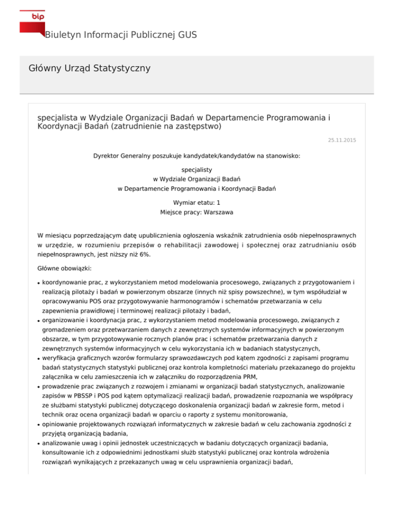 Biuletyn Informacji Publicznej GUS Główny Urząd Statystyczny specjalista w Wydziale Organizacji Badań w Departamencie Programowania i Koordynacji Badań (zatrudnienie na zastępstwo) 25.11.2015 Dyrektor Generalny poszukuje kandydatek/kandydatów na stanowisko: specjalisty w Wydziale Organizacji Badań w Departamencie Programowania i Koordynacji Badań Wymiar etatu: 1 Miejsce pracy: Warszawa W miesiącu poprzedzającym datę upublicznienia ogłoszenia wskaźnik zatrudnienia osób niepełnosprawnych w urzędzie, w rozumieniu przepisów o rehabilitacji zawodowej i społecznej oraz zatrudnianiu osób niepełnosprawnych, jest niższy niż 6%. Główne obowiązki: ● koordynowanie prac, z wykorzystaniem metod modelowania procesowego, związanych z przygotowaniem i realizacją pilotaży i badań w powierzonym obszarze (innych niż spisy powszechne), w tym współudział w opracowywaniu POS oraz przygotowywanie harmonogramów i schematów przetwarzania w celu zapewnienia prawidłowej i terminowej realizacji pilotaży i badań, ● organizowanie i koordynacja prac, z wykorzystaniem metod modelowania procesowego, związanych z gromadzeniem oraz przetwarzaniem danych z zewnętrznych systemów informacyjnych w powierzonym obszarze, w tym przygotowywanie rocznych planów prac i schematów przetwarzania danych z zewnętrznych systemów informacyjnych w celu wykorzystania ich w badaniach statystycznych, ● weryfikacja graficznych wzorów formularzy sprawozdawczych pod kątem zgodności z zapisami programu badań statystycznych statystyki publicznej oraz kontrola kompletności materiału przekazanego do projektu załącznika w celu zamieszczenia ich w załączniku do rozporządzenia PRM, ● prowadzenie prac związanych z rozwojem i zmianami w organizacji badań statystycznych, analizowanie zapisów w PBSSP i POS pod kątem optymalizacji realizacji badań, prowadzenie rozpoznania we współpracy ze służbami statystyki publicznej dotyczącego doskonalenia organizacji badań w zakresie form, metod i technik oraz ocena organizacji badań w oparciu o raporty z systemu monitorowania, ● opiniowanie projektowanych rozwiązań informatycznych w zakresie badań w celu zachowania zgodności z przyjętą organizacją badania, ● analizowanie uwag i opinii jednostek uczestniczących w badaniu dotyczących organizacji badania, konsultowanie ich z odpowiednimi jednostkami służb statystyki publicznej oraz kontrola wdrożenia rozwiązań wynikających z przekazanych uwag w celu usprawnienia organizacji badań, ● organizowanie i koordynacja prac zmierzających do optymalizacji zakresu zmiennych pozyskiwanych w badaniach statystycznych w celu optymalizacji zakresu zmiennych pozyskiwanych w badaniach statystycznych, ● udzielanie wyjaśnień respondentom w zakresie obowiązków sprawozdawczych w celu przekazania informacji o badaniach statystycznych, obowiązkach sprawozdawczych itp. Warunki pracy Warunki dotyczące charakteru pracy na stanowisku i sposobu wykonywania zadań: praca administracyjnobiurowa. Miejsce i otoczenie organizacyjno-techniczne stanowiska pracy: ● Budynek Głównego Urzędu Statystycznego jest częściowo dostosowany dla potrzeb osób niepełnosprawnych. Wejście główne do budynku jest dostosowane dla potrzeb osób niepełnosprawnych, brak progów utrudniających wjazd wózkiem, schody w holu głównym są wyposażone w ruchome platformy do transportu wózka, wewnątrz budynku zapewniona jest odpowiednia szerokość ciągów komunikacyjnych. Windy wyposażone są w informację głosową oraz oznakowanie dla osób niewidomych, natomiast nie są dostosowane do potrzeb osób poruszających się na wózkach inwalidzkich w zakresie usytuowania poręczy i tablicy przyzywowej. Ponadto w budynku znajduje się tylko jedna toaleta przystosowana dla potrzeb osób niepełnosprawnych usytuowana na poziomie parteru. ● Praca przy komputerze. Wykształcenie: wyższe. Wymagania niezbędne: ● znajomość ustawy o służbie cywilnej, ● znajomość ustawy o statystyce publicznej, ● znajomość aktów prawnych dotyczących statystyki publicznej (rozporządzenia PRM w sprawie określenia wzorów formularzy sprawozdawczych, kwestionariuszy i ankiet, rozporządzenia RM w sprawie PBSSP), ● wiedza z zakresu zasad organizacji badań statystycznych, ● umiejętność obsługi komputera (MS Office), ● wykorzystywanie wiedzy i doskonalenie zawodowe, ● rzetelność, ● organizacja pracy i orientacja na osiąganie celów, ● komunikacja interpersonalna, ● komunikacja pisemna, ● współpraca, ● radzenie sobie w sytuacjach kryzysowych, ● myślenie analityczne. Wymagania dodatkowe: ● znajomość języka angielskiego na poziomie komunikatywnym, ● znajomość metod modelowania procesowego. Wymagane dokumenty i oświadczenia: ● życiorys i list motywacyjny, ● kopie dokumentów potwierdzających wykształcenie, ● kopia dokumentu potwierdzającego posiadanie polskiego obywatelstwa lub oświadczenie o posiadaniu obywatelstwa polskiego, ● oświadczenie o korzystaniu z pełni praw publicznych, ● oświadczenie o nieskazaniu prawomocnym wyrokiem za umyślne przestępstwo lub umyślne przestępstwo skarbowe, ● oświadczenie o wyrażeniu zgody na przetwarzanie danych osobowych do celów rekrutacji. Kopie innych dokumentów i oświadczenia: ● kopia dokumentu potwierdzającego niepełnosprawność – w przypadku kandydatek/kandydatów, zamierzających skorzystać z pierwszeństwa w zatrudnieniu, w przypadku, gdy znajdą się w gronie najlepszych kandydatek/kandydatów, ● kopie innych dokumentów potwierdzających spełnianie wymagań niezbędnych i dodatkowych. Dokumenty należy składać lub przesyłać do: 08-12-2015 r., pod adresem: Główny Urząd Statystyczny Biuro Organizacji i Kadr pok. 234 lub 251 al. Niepodległości 208 00-925 Warszawa (w godz. 815-1615) koniecznie z dopiskiem: oferta nr 115/PK/2015 Inne informacje: Zatrudnienie na zastępstwo. Proponowane wynagrodzenie bru
