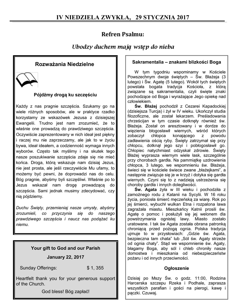 IV NIEDZIELA ZWYKŁA, 29 STYCZNIA 2017 Refren Psalmu: Ubodzy duchem mają wstęp do nieba Rozważania Niedzielne Pójdźmy drogą ku szczęściu Każdy z nas pragnie szczęścia. Szukamy go na wiele różnych sposobów, ale w praktyce rzadko korzystamy ze wskazówek Jezusa z dzisiejszej Ewangelii. Trudno jest nam zrozumieć, że to właśnie one prowadzą do prawdziwego szczęścia. Oczywiście zaprezentowany w nich ideał jest piękny i raczej mu nie zaprzeczamy, ale jak to w życiu bywa, ideał ideałem, a codzienność wymaga innych wyborów. Często tak myślimy i na skutek tego nasze poszukiwanie szczęścia zdaje się nie mieć końca. Droga, którą wskazuje nam dzisiaj Jezus, nie jest prosta, ale jeśli rzeczywiście Mu ufamy, to możemy być pewni, że doprowadzi nas do celu. Bóg pragnie, abyśmy byli szczęśliwi. Właśnie po to Jezus wskazał nam drogę prowadzącą do szczęścia. Sami jednak musimy zdecydować, czy nią pójdziemy. Duchu Święty, przemieniaj nasze umysły, abyśmy zrozumieli, co przyczynia się do naszego prawdziwego szczęścia i naucz nas podążać ku niemu. Your gift to God and our Parish January 22, 2017 Sunday Offerings: $ 1, 355 Heartfelt thank you for your generous support of the Church. God bless! Bóg zapłać! Sakramentalia – znakami blizkości Boga W tym tygodniu wspominamy w Kościele Powszechnym dwoje świętych – Św. Błażeja (3 lutego) i Św. Agatę (5 lutego). Wokół tych świętych powstała bogata tradycja Kościoła, z którą związane są sakramentalia, czyli święte znaki pochodzące od Boga i wyrażające Jego opiekę nad człowiekiem. Św. Błażej pochodził z Cezarei Kapadockiej (dzisiejsza Turcja) i żył w IV wieku. Ukończył studia filozoficzne, ale został lekarzem. Preśladowania chrześcijan w tym czasie dotknęły również św. Błażeja. Został on aresztowany i w dordze do więzienia błogosławił wiernych, wśród których zobaczył chłopca konającego z powodu zadławienia ością ryby. Święty zatrzymał się przy chłopcu, dotknął jego szyi i pobłogosławił go. Chłopiec natychmiast odzyskał zdrowie. Święty Błażej wyprasza wiernym wiele łask, szczególnie przy chorobach gardła. Na pammiątkę uzdrowienia chłopca, 3 lutego, we wspomnieniu św. Błażeja, świeci się w kościele świece zwane „błażejkami”, a następnie związuje się je w krzyż i dotyka się gardła wiernych. Czyni się to z nadzieją ustrzeżenia się choroby gardła i innych dolegliwości. Św. Agata żyła w III wieku i pochodziła z zamożnego rodu z Katanii na Sycylii. W 16 roku życia, poniosła śmierć męczeńską za wiarę. Rok po jej śmierci, wybuchł wulkan Etna i rozpalona lawa zagrażała miastu. Mieszkańcy Katnii prosili św. Agatę o pomoc i posłużyli się jej welonem dla powstrzymania ognistej lawy. Miasto zostało uratowane. I tak św Agata została obrana patronką chroniącą przed pożogą ognia. Polska tradycja ujmuje to w przysłowiach: „Gdzie św. Agata, bezpieczna tam chata” lub „Sól św. Agaty strzeże od ognia chaty”. Stąd we wspomnienie św. Agaty, błagamy Boga, aby sól i chleb chroniły nasze domostwa i mieszkania od niebezpieczeństw pożaru i od innych przeciwności. Ogłoszenie Dzisiaj po Mszy Św. o godz. 11:00, Rodzina Harcerska szczepu Rzeka i Podhale, zaprasza wszystkich parafian i gości na pierogi, kawę i pączki. Czuwaj. 4th SUNDAY IN ORDINARY TIME, JANUARY 29, 2017 Psalm Refrain: Blessed are the poor in spirit; the kingdom of heaven is theirs! Reflection ..... Today's reading is the beginning of Jesus' Sermon on the Mount, which is found in Matthew's Gospel. The form of the Beatitudes found here is not unique to Jesus. Beatitudes are found in the Old Testament, in the psalms, and in wisdom literature, for example. They are a way to teach about who will find favor with God. We quickly note in this reading that the people whom Jesus calls “blessed” and “happy” are not people we think of as blessed or happy . . . the poor in spirit, the meek, the persecuted. This Gospel is one of reversals. Jesus' blueprint for happiness reflects little of what the world might call happiness. “Blessed” is sometimes translated as happy, fortunate, or favored. In other words, Jesus is saying that divine favor is upon those who are poor, those who mourn, those who are persecuted. This news might have been welcome—and surprising—to the crowds who heard Jesus that day. The Beatitudes can be understood as a framework for Christian living. Our vocation as Christians is not to be first in this world, but rather to be first in the eyes of God. By referring to the good things that the faithful will experience, Matthew reminds us that those who act in the manner described in the Beatitudes will find their reward with God. INTENCJE MSZALNE / MASS INTENTIONS Intencja Rodziny Żywego Różańca na miesiąc styczeń: „O pokój na ziemi” Senior Men’s High School Retreat (Grades 11 & 12) The Office of Vocations is hosting a day retreat at Blessed Sacrament Parish, 24 Cheritan Avenue Toronto on Saturday, February 11, 2017 (from 9am to 5pm). Provides a time to pray, interact & socialize with other young Catholic men. Seminarians deliver talks on practical aspects of faith. Day includes Holy Mass, Adoration & Confession. For more information please call the Office of Vocations at 416-968-0997 or email: [email protected] Sunday, January 29, 2017 9:00 am For the repose of the soul of Maria Lan, Anthony Cuong, Anthony An – Requested by the Dang family 11:00 am Za † Piotra Wasilewskiego – Od żony z synami Za † Danute Wareszczak-Stasiak W podziękowaniu za okazywane dobro, zprośbą o Boże błogosławieństwo i opiekę MB dla Andrzeja Dąbrowskiego – Od Zofii i Danuty O Boże błogosławieństwo, opiekę MB i zdrowie dla Urszuli Kornaus Wednesday, February 1, 2017 7:00 pm Za † Marię Siwiec – Od rodziny Thursday, February 2, 2017 (Latin) 7:00 pm O Boże błogosławieńs