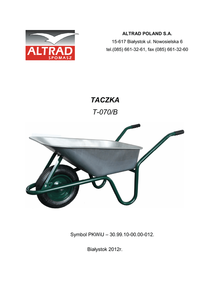 ALTRAD POLAND S.A. 15-617 Białystok ul. Nowosielska 6 tel.(085) 661-32-61, fax (085) 661-32-60 TACZKA T-070/B Symbol PKWiU – 30.99.10-00.00-012. Białystok 2012r. PRZEZNACZENIE Taczka ze skrzynią tłoczoną z blachy ocynkowanej przeznaczona jest do transportu na bliskie odległości materiałów stałych, sypkich i półpłynnych. DANE TECHNICZNE Pojemność Nośność litr kg T-070/B 85 160 Masa kg 14 BUDOWA I DZIAŁANIE Taczka składa się z trzech zasadniczych zespołów: skrzyni, ramy i koła jezdnego. Skrzynia wykonana z blachy cynkowanej przez tłoczenie i odpowiednio ukształtowana pozwala na łatwe i szybkie jej opróżnianie i czyszczenie. INSTRUKCJA MONTAŻU Taczka dostarczana jest w stanie zmontowanym lub w częściach. Montaż jest bardzo prosty i polega na przykręceniu do ramy skrzyni, koła i wspornika wg rysunku montażowego. Śruby należy zakładać od strony pudła, a pod nakrętki zakładać podkładki. W zależności od typu „B” lub „C” wspornik (poz.3) należy przykręcić na niższe lub wyższe otwory wspornika. OBSŁUGA I UŻYTKOWANIE Przed użyciem taczki należy sprawdzić, czy koło jest napompowane i czy lekko się obraca oraz czy skrzynia jest dobrze przykręcona do ramy. Przy przewożeniu ciężkich przedmiotów np. kamieni, gruzu, należy je ładować w skrzyni bliżej koła. ZASADY BEZPIECZNEJ PRACY Podczas transportu należy zachować ostrożność. Nie stawiać wózka taczkowego na przejściach lub drogach przejazdowych, pochyłościach. UWAGA Producent zastrzega sobie prawo wprowadzania zmian konstrukcyjnych wyrobu, nie powodując pogorszenia parametrów technicznych, które nie będą widoczne w instrukcji, przy czym zasadnicze cechy wyrobu zostaną zachowane. CZĘŚCI ZAMIENNE Każdą część taczki użytkownik może nabyć jako część zamienną. Zamówienie na części zamienne należy składać w punktach sprzedaży lub u producenta. WYKAZ CZĘŚCI SKŁADOWYCH Nr katal. 1 2 3 4 5.1 5,2 5.3 Nazwa Ilość Skrzynia tłoczona Rama Wspornik Koło kompl. (felga, opona, ośka, 2 podk, w nakrętki) Części złączne Śruba z łbem stożkowym M8 x 16 Śruba M8 x 16 Nakrętka M 8 1 1 1 1 1 kpl. 5 2 7 5.1 1 3 2 5.2 5.3 4 Rysunek montażowy taczki. ALTRAD POLAND S.A. 15-617 Białystok, ul. Nowosielska 6 tel. (0-85) 661-32-61 fax 661-32-60 KARTA GWARANCYJNA TACZKA T-070/B Data produkcji ................................. WARUNKI GWARANCJI: 1. Gwarancja jest udzielana na sprawne działanie taczki na okres 12 m-cy od daty zakupu. 2. Czas trwania gwarancji nie może przekroczyć 24 m-cy od daty wysyłki wózka taczkowego dystrybutorowi. 3. Gwarancja zobowiązuje producenta do usunięcia stwierdzonych przez użytkownika wad fabrycznych, wadliwe wykonanie, użycie nieodpowiednich materiałów – w terminie 14 dni od daty doręczenia przez odbiorcę zgłoszenia reklamacyjnego wraz z niniejszą karta gwarancyjną oraz dowodem zakupu. 4. Gwarancja traci moc i ulega unieważnieniu w przypadkach: niewłaściwego przechowywania, użytkowania niezgodnego z instrukcją obsługi, wykonywania napraw i przeróbek bez zgody producenta. 5. Nie wypełniona i nie podpisana karta gwarancyjna jest nieważna. DZIAŁ KONTROLI JAKOŚCI Wypełnia punkt sprzedaży Data sprzedaży.................................................................. /dzień, miesiąc, rok/ Pieczęć Podpis sprzedawcy Wypełnia ALTRAD POLAND S.A. Data zgłoszenia reklamacji............................................................................................ Sposób załatwienia........................................................................................................ ....................................................................................................................................... Data.......................................... Podpis...........................................