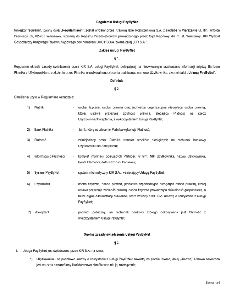 Regulamin Usługi PayByNet Niniejszy regulamin, zwany dalej „Regulaminem”, został wydany przez Krajową Izbę Rozliczeniową S.A. z siedzibą w Warszawie ul. rtm. Witolda Pileckiego 65, 02-781 Warszawa, wpisaną do Rejestru Przedsiębiorców prowadzonego przez Sąd Rejonowy dla m. st. Warszawy, XIII Wydział Gospodarczy Krajowego Rejestru Sądowego pod numerem 0000113064, zwaną dalej „KIR S.A.”. Zakres usługi PayByNet § 1. Regulamin określa zasady świadczenia przez KIR S.A. usługi PayByNet, polegającej na niezwłocznym przekazaniu informacji między Bankiem Płatnika a Użytkownikiem, o złożeniu przez Płatnika nieodwołalnego zlecenia płatniczego na rzecz Użytkownika, zwanej dalej „Usługą PayByNet”. Definicje § 2. Określenia użyte w Regulaminie oznaczają: 1) Płatnik - osoba fizyczna, osoba prawna oraz jednostka organizacyjna niebędąca osoba prawną, której ustawa przyznaje zdolność prawną, zlecająca Płatność na rzecz Użytkownika/Akceptanta, z wykorzystaniem Usługi PayByNet; 2) Bank Płatnika - bank, który na zlecenie Płatnika wykonuje Płatność; 3) Płatność - zainicjowany przez Płatnika transfer środków pieniężnych na rachunek bankowy Użytkownika lub Akceptanta; 4) Informacja o Płatności - komplet informacji opisujących Płatność, w tym: NIP Użytkownika, nazwa Użytkownika, kwota Płatności, data ważności transakcji; 5) System PayByNet - system informatyczny KIR S.A., wspierający Usługę PayByNet; 6) Użytkownik - osoba fizyczna, osoba prawna, jednostka organizacyjna niebędąca osoba prawną, której ustawa przyznaje zdolność prawną, osoba fizyczna prowadząca działalność gospodarczą, a także organ administracji publicznej, które zawarły z KIR S.A. umowę o korzystanie z Usługi PayByNet; 7) Akceptant - podmiot publiczny, na rachunek bankowy którego dokonywana jest Płatność z wykorzystaniem Usługi PayByNet; Ogólne zasady świadczenia Usługi PayByNet § 3. 1. Usługa PayByNet jest świadczona przez KIR S.A. na rzecz: 1) Użytkownika - na podstawie umowy o korzystanie z Usługi PayByNet zawartej na piśmie, zwanej dalej „Umową”. Umowa zawierana jest na czas nieokreślony i każdorazowo określa warunki jej rozwiązania; Strona 1 z 4 2) Płatnika - na podstawie umowy zawartej przez przystąpienie Płatnika do faktycznego skorzystania z Usługi PayByNet; umowa ulega rozwiązaniu po upływie 3 dni od przekierowania Płatnika do jego bankowości elektronicznej, niezależnie do sposobu zakończenia procesu. 2. 3. Usługa PayByNet obejmuje w szczególności: 1) przekazanie do Banku Płatnika Informacji o Płatności; 2) zaprezentowanie Płatnikowi Informacji o Płatności w ramach bankowości elektronicznej Banku Płatnika; 3) przekazanie Użytkownikowi informacji o złożeniu przez Płatnika nieodwołalnego zlecenia płatniczego na jego rzecz. Środki pieniężne każdej Płatności wykonanej przez Płatnika przekazywane są bezpośrednio z rachunku bankowego Płatnika na rachunek bankowy Użytkownika lub Akceptanta zgodnie z dyspozycją Użytkownika. System PayByNet nie pośredniczy w przekazywaniu środków pieniężnych. 4. Kwota Płatności musi być wyrażona w pieniądzu polskim. 5. Z tytułu świadczenia Usługi PayByNet KIR S.A. może pobrać prowizję od Użytkownika na zasadach określonych w Umowie. 6. Z tytułu świadczenia Usługi PayByNet KIR S.A. może pobrać prowizję od Płatnika - w przypadku pobierania prowizji od Płatnika jej wysokość wyświetlana jest każdorazowo na ekranie wyboru banku w Systemie PayByNet. Prowizja pobierana jest automatycznie z chwilą dokonania Płatności przez Płatnika w jego bankowości elektronicznej. 7. Użytkownik zobowiązuje się nie udostępniać Płatnikowi możliwości zlecenia – z wykorzystaniem Usługi PayByNet – Płatności z tytułu czynności niezgodnych z prawem lub zabronionych. 8. Użytkownik korzystając z Usługi PayByNet nie ma prawa dostarczać treści o charakterze bezprawnym. 9. Zakaz, o którym mowa w ust. 7, dotyczy również dostarczania niezamówionej informacji handlowej (w tym obejmującej treści marketingowe i reklamowe) w rozumieniu przepisów ustawy z dnia 18 lipca 2002 r. o świadczeniu usług drogą elektroniczną (Dz.U. Nr 144, poz. 1204, z późn. zm.). Zasady funkcjonowania Systemu PayByNet § 4. 1. Informacja o Płatności przekazywana jest w postaci ciągu znaków umieszczonych w treści wywołania metody HTTP POST lub GET, każdorazowo przesyłanej z wykorzystaniem przeglądarki internetowej Płatnika podczas kolejnych etapów przekazywania Informacji o Płatności. 2. Treść przekazywanej Informacji o Płatności jest każdorazowo chroniona przed zniekształceniem za pomocą podpisu elektronicznego lub dedykowanego algorytmu szyfrującego. 3. Wymagania techniczne niezbędne do współpracy Użytkownika z systemem PayByNet określa „Specyfikacja Techniczna”, która dostarczana jest Użytkownikowi w zależności od indywidualnych wymagań wynikających ze sposobu wdrożenia systemu PayByNet. 4. System PayByNet jest dostępny w trybie 24/7/365 z tym, że KIR S.A. zastrzega sobie prawo do jego niedostępności w przypadkach awarii lub przerw technicznych. KIR S.A. dołoży wszelkich starań, aby przerwy techniczne występowały wyłącznie w soboty i niedziele lub w późnych godzinach nocnych w dni robocze. 5. Właściwe wyświetlanie stron oraz bezproblemowe korzystanie z Usługi PayByNet wymaga spełnienia przez system i oprogramowanie Płatnika następujących minimalnych wymagań technicznych: 1) zastosowania przeglądarek: Internet Explorer, Google Chrome, Mozilla Firefox, Opera, Safari; 2) przeglądarka powinna posiadać zainstalowane i poprawnie działające oprogramowanie do obsługi skryptów i apletów Java; 3) strona internetowa jest optymalizowana w rozdzielczości: 800 x 600, 1024 x 768. Strona 2 z 4 Ochrona danych osobowych § 5. 1. Administratorem danych osobowych Płatnika jest Krajowa Izba Roz