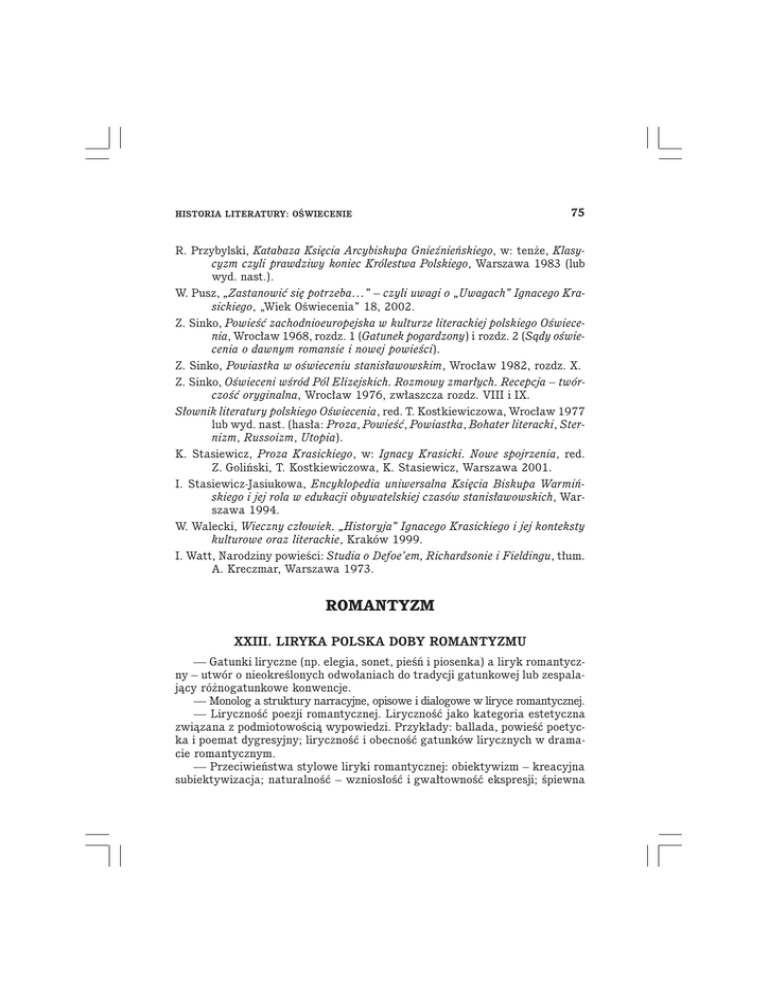 HISTORIA LITERATURY: OŚWIECENIE 75 R. Przybylski, Katabaza Księcia Arcybiskupa Gnieźnieńskiego, w: tenże, Klasycyzm czyli prawdziwy koniec Królestwa Polskiego, Warszawa 1983 (lub wyd. nast.). W. Pusz, „Zastanowić się potrzeba…” – czyli uwagi o „Uwagach” Ignacego Krasickiego, „Wiek Oświecenia” 18, 2002. Z. Sinko, Powieść zachodnioeuropejska w kulturze literackiej polskiego Oświecenia, Wrocław 1968, rozdz. 1 (Gatunek pogardzony) i rozdz. 2 (Sądy oświecenia o dawnym romansie i nowej powieści). Z. Sinko, Powiastka w oświeceniu stanisławowskim, Wrocław 1982, rozdz. X. Z. Sinko, Oświeceni wśród Pól Elizejskich. Rozmowy zmarłych. Recepcja – twórczość oryginalna, Wrocław 1976, zwłaszcza rozdz. VIII i IX. Słownik literatury polskiego Oświecenia, red. T. Kostkiewiczowa, Wrocław 1977 lub wyd. nast. (hasła: Proza, Powieść, Powiastka, Bohater literacki, Sternizm, Russoizm, Utopia). K. Stasiewicz, Proza Krasickiego, w: Ignacy Krasicki. Nowe spojrzenia, red. Z. Goliński, T. Kostkiewiczowa, K. Stasiewicz, Warszawa 2001. I. Stasiewicz-Jasiukowa, Encyklopedia uniwersalna Księcia Biskupa Warmińskiego i jej rola w edukacji obywatelskiej czasów stanisławowskich, Warszawa 1994. W. Walecki, Wieczny człowiek. „Historyja” Ignacego Krasickiego i jej konteksty kulturowe oraz literackie, Kraków 1999. I. Watt, Narodziny powieści: Studia o Defoe’em, Richardsonie i Fieldingu, tłum. A. Kreczmar, Warszawa 1973. ROMANTYZM XXIII. LIRYKA POLSKA DOBY ROMANTYZMU — Gatunki liryczne (np. elegia, sonet, pieśń i piosenka) a liryk romantyczny – utwór o nieokreślonych odwołaniach do tradycji gatunkowej lub zespalający różnogatunkowe konwencje. — Monolog a struktury narracyjne, opisowe i dialogowe w liryce romantycznej. — Liryczność poezji romantycznej. Liryczność jako kategoria estetyczna związana z podmiotowością wypowiedzi. Przykłady: ballada, powieść poetycka i poemat dygresyjny; liryczność i obecność gatunków lirycznych w dramacie romantycznym. — Przeciwieństwa stylowe liryki romantycznej: obiektywizm – kreacyjna subiektywizacja; naturalność – wzniosłość i gwałtowność ekspresji; śpiewna 76 PRZEWODNIK PO TEMATACH OLIMPIADY LITERATURY I JĘZYKA POLSKIEGO harmonia – kontrast i dysonans; bezpośredniość – sugestia, aluzyjność, wieloznaczność; nastawienie na potoczność, konwencjonalność – konstruowanie specyficznego języka liryki; retoryczność – muzyczność. — Dziedziny tematyczne liryki romantycznej: liryka osobista; liryka religijna i filozoficzna; poezja uczuć narodowych i zagadnień społecznych. Profile romantycznej egzystencji w liryce. Liryka a folklor, insurekcja, rewolucja. — Przed- i międzypowstaniowi lirycy drugiego planu (Goszczyński, Zaleski, Pol, Lenartowicz, Ujejski, Romanowski). Żywotność sentymentalizmu w liryce doby romantycznej. Utwory: Poezje liryczne Adama Mickiewicza, Juliusza Słowackiego, Cypriana Norwida. Poeci krajowi wg: Antologia romantycznej poezji krajowej, oprac. M. Grabowska, M. Janion, Warszawa 1958. Opracowania: W. Borowy, O Norwidzie. Rozprawy i notatki, Warszawa 1960. M. Burta, Reszta prawd. „Zdania i uwagi” Adama Mickiewicza, Warszawa 2005. Cypriana Norwida kształt prawdy i miłości. Analizy i interpretacje, red. S. Makowski, Warszawa 1986. H. Friedrich, Struktura nowoczesnej liryki, Warszawa 1978. M. Janion, „Kuźnia natury”, w: taż, Gorączka romantyczna, Warszawa 1975. M. Janion, Poezja w kraju. Próba syntezy, w: Literatura krajowa w okresie romantyzmu 1831–1863, t. 1, red. M. Janion, B. Zakrzewski, M. Dernałowicz, Kraków 1975. M. Janion, Reduta. Romantyczna poezja niepodległościowa, Kraków 1979. T. Kostkiewiczowa, Tradycja sentymentalizmu w poezji epoki romantycznej, (Zarys problemu), w: Problemy polskiego romantyzmu, seria trzecia, red. M. Żmigrodzka, Wrocław 1981. B. Kuczera-Chachulska, Przemiany form i postaw elegijnych w liryce polskiej XIX wieku. Mickiewicz – Słowacki – Norwid – Faleński – Asnyk – Konopnicka, Warszawa 2002. B. Kuczera-Chachulska, Norwida „przypowieść o pięknem” i inne szkice z pogranicza genologii i estetyki, Warszawa 2008. Liryka romantyczna i inne szkice, red. B. Kuczera-Chachulska, Warszawa 2010. M. Maciejewski, „Ażeby ciało powróciło w słowo”. Próba kerygmatycznej interpretacji literatury, Lublin 1991. M. Maciejewski, Od erudycji do poznania, „Roczniki Humanistyczne” 1966, z. 1. HISTORIA LITERATURY: ROMANTYZM 77 M. Maciejewski, Poetyka. Gatunek – obraz. W kręgu poezji romantycznej, Wrocław 1977. Od Kochanowskiego do Mickiewicza. Szkice o polskim cyklu poetyckim, red. B. Kuczera-Chachulska, Warszawa 2004 (stąd szkice M. Piwińskiej, B. Doparta, B. Kuczery-Chachulskiej). I. Opacki, Odwrócona elegia. O przenikaniu się postaci gatunkowych w poezji, Katowice 1999. I. Opacki, Poezja romantycznych przełomów. Szkice, Wrocław 1972. I. Opacki, „W środku niebokręga”. Poezja romantycznych przełomów, Katowice 1995. M. Prussak, Czy słychać jeszcze głos romantyzmu?, Warszawa 2007. D. Seweryn, „…jak tam zaszedłeś”. Mickiewicz w szkole klasycznej, Lublin 1997. D. Seweryn, O wyobraźni lirycznej Mickiewicza, Warszawa 1996. K. Stępnik, Filozofia metafory, Lublin 1988, rozdz. VI. R. Wellek, Pojęcie romantyzmu w historii literatury, tłum. I. Sieradzki, w: Pojęcia i problemy nauki o literaturze, przed., H. Markiewicz, Warszawa 1979. A. Witkowska, Literatura romantyzmu, Warszawa 1986 (lub wyd. nast.), rozdz. VII. A. Witkowska, R. Przybylski, Romantyzm, Warszawa 1997, cz. 2, rozdz. II–VI. D. Zamącińska, Słynne – nieznane. Wiersze późne Mickiewicza, Słowackiego, Norwida, Lublin 1985. Cz. Zgorzelski, Liryka w pełni romantyczna. Studia i szkice o wierszach Słowackiego, Warszawa 1981. Cz. Zgorzelski, Obserwacje, Warszawa 1983. Cz. Zgorzelski, Od oświecenia ku romantyzmowi i współczesności. (Szkice historycznoliterackie), Kraków 1978 (stąd: Romant