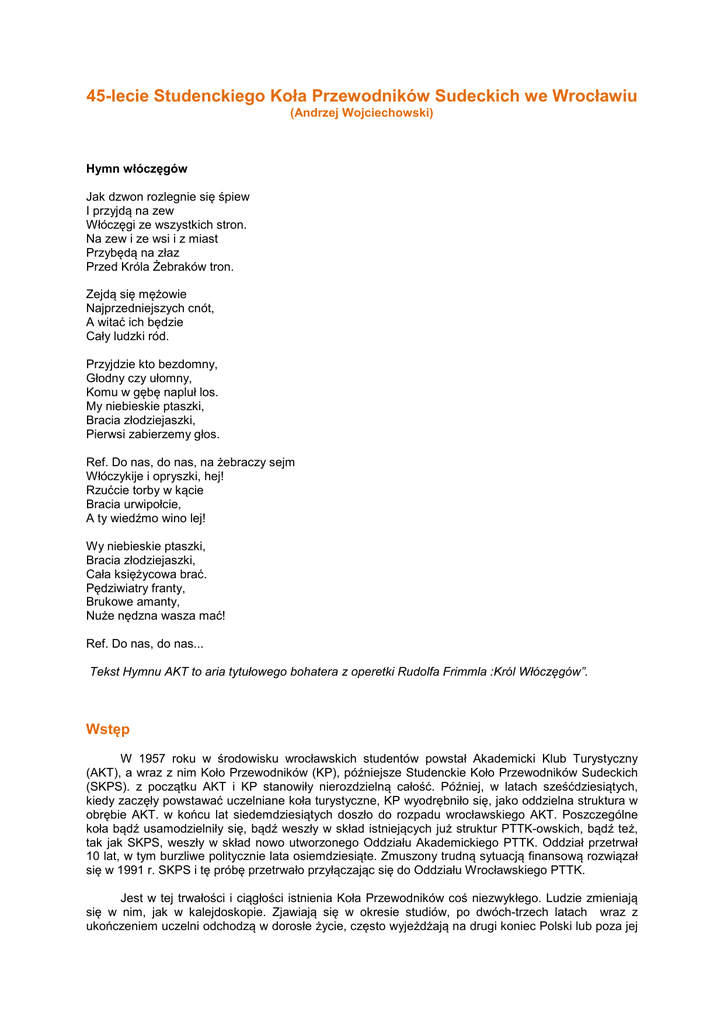 45-lecie Studenckiego Koła Przewodników Sudeckich we Wrocławiu (Andrzej Wojciechowski) Hymn włóczęgów Jak dzwon rozlegnie się śpiew I przyjdą na zew Włóczęgi ze wszystkich stron. Na zew i ze wsi i z miast Przybędą na złaz Przed Króla Żebraków tron. Zejdą się mężowie Najprzedniejszych cnót, A witać ich będzie Cały ludzki ród. Przyjdzie kto bezdomny, Głodny czy ułomny, Komu w gębę napluł los. My niebieskie ptaszki, Bracia złodziejaszki, Pierwsi zabierzemy głos. Ref. Do nas, do nas, na żebraczy sejm Włóczykije i opryszki, hej! Rzućcie torby w kącie Bracia urwipołcie, A ty wiedźmo wino lej! Wy niebieskie ptaszki, Bracia złodziejaszki, Cała księżycowa brać. Pędziwiatry franty, Brukowe amanty, Nuże nędzna wasza mać! Ref. Do nas, do nas... Tekst Hymnu AKT to aria tytułowego bohatera z operetki Rudolfa Frimmla :Król Włóczęgów”. Wstęp W 1957 roku w środowisku wrocławskich studentów powstał Akademicki Klub Turystyczny (AKT), a wraz z nim Koło Przewodników (KP), późniejsze Studenckie Koło Przewodników Sudeckich (SKPS). z początku AKT i KP stanowiły nierozdzielną całość. Później, w latach sześćdziesiątych, kiedy zaczęły powstawać uczelniane koła turystyczne, KP wyodrębniło się, jako oddzielna struktura w obrębie AKT. w końcu lat siedemdziesiątych doszło do rozpadu wrocławskiego AKT. Poszczególne koła bądź usamodzielniły się, bądź weszły w skład istniejących już struktur PTTK-owskich, bądź też, tak jak SKPS, weszły w skład nowo utworzonego Oddziału Akademickiego PTTK. Oddział przetrwał 10 lat, w tym burzliwe politycznie lata osiemdziesiąte. Zmuszony trudną sytuacją finansową rozwiązał się w 1991 r. SKPS i tę próbę przetrwało przyłączając się do Oddziału Wrocławskiego PTTK. Jest w tej trwałości i ciągłości istnienia Koła Przewodników coś niezwykłego. Ludzie zmieniają się w nim, jak w kalejdoskopie. Zjawiają się w okresie studiów, po dwóch-trzech latach wraz z ukończeniem uczelni odchodzą w dorosłe życie, często wyjeżdżają na drugi koniec Polski lub poza jej granice. Nieliczni zostają w Kole na dłużej. a jednak Koło jest, działa i żyje. Ba! Ci, co odeszli, wracają do niego, odnawiają stare przyjaźnie. Czasami spotykają się w mniejszych grupach, co rok w różnych miejscach Sudetów. Niniejsze opracowanie jest próbą spojrzenia wstecz, przybliżenia historii Studenckiego Koła Przewodników Sudeckich. Historii niezwykle ulotnej, tak, jak ulotny w skali życia jest pobyt na uczelni. Chcielibyśmy, by to wszystko nie uciekło w niepamięć. Choć ludzie i czasy zmieniają się w coraz szybszym tempie, zostają wspomnienia wspaniałych obozów, rajdów, przygód na szlaku. Chcielibyśmy uchronić to wszystko od zapomnienia, przelać na papier być może Twoją Czytelniku cząstkę tej wielkiej pasji zwanej turystyką. Wydawnictwo to stanowi zarazem podsumowanie 45-lecia Koła. Obchodzony uroczyście w Ulanowicach k. Lubawki w dniach 7-9 listopada 1997 r. Zlot Jubileuszowy wykazał, jak ogromna jest w nas chęć powrotu do młodzieńczych lat, odnowienia starych przyjaźni, spojrzenia jeszcze raz na obrazy naszej działalności. Jest więc to również opowieść, która być może wyciśnie łezkę w Twoim oku, przywróci wspomnienia czegoś odległego w czasie, a jednak tak bliskiego sercu. Lata niestety biegną. Wydarzenia pokrywają się patyną czasu i uciekają w niepamięć. Zdajemy sobie sprawę z wielu luk historycznych i faktograficznych. Ponieważ w 1975 r. zaginęła część dokumentacji Koła, brak jest m.in. kompletnej listy wszystkich jego członków, zwłaszcza tych sprzed 1973 r. Dlatego prosimy o przekazywanie nam wszelkich informacji o Kole, jego członkach, imprezach robionych przez Koło, jakie zachowały się w zakamarkach Twojej pamięci, bądź w starych szpargałach, a które nie znalazły się w niniejszym opracowaniu. Prosimy o sprostowania i uzupełnienia luk w nim. w szczególności apelujemy o nadsyłanie zdjęć (w miarę możliwości z opisem), zwłaszcza z lat 1957-73. Ocalmy to wszystko od zapomnienia! Historia Studenckiego Koła Przewodników Sudeckich Początki (do 1961) Pisząc o początkach przewodnictwa studenckiego, sięgnąć trzeba do połowy lat pięćdziesiątych. w czasach tych wszystkie dziedziny życia społecznego podporządkowane były wszechobecnej ideologii komunistycznej i poddane ścisłej kontroli władz poprzez przymusową kolektywizację. Nie inaczej było z turystyką. Przedwojenne wzorce wypracowane przez PTT i PTK odłożono do lamusa jako „burżuazyjny i kapitalistyczny przeżytek”, a największy nacisk położono na umasowienie ruchu turystycznego w ramach centralnie organizowanych przez związki zawodowe turnusów wczasowych. Większość obiektów noclegowych przeznaczono dla wczasowiczów, a przypadkowy turysta nie miał w nich czego szukać. Opisując panujące wówczas warunki trzeba wspomnieć o doprowadzonych do absurdu ograniczeniach cenzorskich, które spowodowały, że w ogóle nie wydawano map. w dużej części polskich gór dodatkowym utrudnieniem były przepisy graniczne, zamykające lub bardzo utrudniające turystom dostęp do wielu atrakcyjnych miejsc. w tej sytuacji turystyka indywidualna praktycznie przestała się rozwijać. Furtką dla osób, którym nie odpowiadał FWP-owski model „zasiedziałego” wypoczynku były wędrowne wczasy turystyczne, organizowane przez PTTK i prowadzone przez przewodników. W środowisku studenckim organizację wypoczynku zlecono (także na zasadzie centralnego sterowania) Zrzeszeniu Studentów Polskich. Pierwsze letnie obozy wędrowne przeznaczone dla studentów zorganizowane zostały w 1953 roku poprzez wykupienie w PTTK 20 turnusów na dwóch trasach prowadzących przez Beskidy. Rychło okazało się, że PTTK-owskie obozy mają swoje wady. Korzystanie z usług przewodników PTTK w istotny sposób zwiększało koszty imprez, p