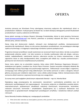OFERTA Jesteśmy pierwszą we Wrocławiu firmą cateringową stworzoną wyłącznie dla najmłodszych dzieci w przedszkolach i żłobkach. Funkcjonujemy od dwóch lat, na dzień dzisiejszy obsługujemy ponad 30 placówek przedszkolnych i żywimy codziennie ok 500 dzieci. Naszą jakość oceniają na bieżąco Eksperci Zdrowego Przedszkolaka, której to akcji jesteśmy Partnerem (www.zdrowyprzedszkolak.org) oraz Nutricii, potentata w produkcji odżywek dla dzieci i Patrona akcji Zdrowo jemy, zdrowo rośniemy. Naszą misją jest dostarczanie ciepłych, zdrowych oraz ekologicznych posiłków, skomponowanych specjalnie dla najmłodszych. Mamy na celu pomoc placówkom przedszkolnym, nie posiadającym własnego zaplecza kuchennego, w osiągnięciu najwyższego standardu żywienia podopiecznych. Pragniemy kreować prawidłowe nawyki żywieniowe we wczesnych latach życia dzieci, tak aby w przyszłości podejmowały właściwy wybór i nie były narażone na choroby cywilizacyjne takie jak alergie, cukrzyca, otyłość, nadpobudliwość, nadciśnienie tętnicze, zaburzenia wzroku czy zmiany nowotworowe, a takie zagrożenia niesie ze sobą nieodpowiednia dieta, szczególnie jeśli składa się z wysoko przetworzonych i genetycznie lub chemicznie modyfikowanych produktów. Nasze menu opiera się na piramidzie żywienia, którą zaleca WHO (Światowa Organizacja Zdrowia) i dodatkowo jest zgodne z zasadami tzw. Kuchni Pięciu Przemian. Zawiera wszystkie niezbędne składniki dla prawidłowego rozwoju fizycznego oraz psychicznego organizmu. Odśluzowuje i usuwa wilgoć z organizmu, zmniejszając ilość infekcji górnych dróg oddechowych. Jest bardzo pomocne w walce z alergiami, których główną przyczyną jest osłabienie odporności i pracy układu pokarmowego. Dobrze skomponowana dieta wzmacnia układ trawienny i poprawia koncentrację oraz uwagę dzieci. Za ocenę menu pod względem jakościowym odpowiada Dietetyk – mgr inż. Monika Biziel Największą wagę przywiązujemy do sezonowości, naturalności i pochodzenia produktów oraz ich właściwości wychładzających lub rozgrzewających. Korzystamy wyłącznie ze składników wysokiej jakości, nieprzetworzonych, pozbawionych szkodliwych substancji chemicznych, konserwantów, barwników, nawozów sztucznych, hormonów i antybiotyków. Zaopatrujemy się u zaufanych dostawców oraz bezpośrednio w gospodarstwach ekologicznych posiadających certyfikaty i świadectwa dobrych praktyk rolniczych. Dania Werandy Smaków składają się z następujących produktów: 1. Pełne ziarna zbóż: naturalny ryż, kasza jaglana, gryczana, orkisz, jęczmień i owies, amarantus, quinoa; 2. Pieczywo razowe, mąka razowa; OFERTA 3. Sól morska nierafinowana, bogata w składniki mineralne i pierwiastki śladowe; 4. Nierafinowany cukier trzcinowy, syrop klonowy, syrop z agawy, miód. 5. Oliwy i oleje z pierwszego tłoczenia, tłoczone na zimno (lniany, sezamowy, oliwa z oliwek). 6. Warzywa z regionu, sezonowe, bez nawozów sztucznych. 7. Warzywa strączkowe bogate w białko. 8. Regionalne owoce sezonowe bez nawozów sztucznych. 9. Orzechy i pestki. Źródło wysokiej jakości kwasów tłuszczowych nienasyconych, błonnika, wapnia, witamin A,B i E. 10. Ryby morskie, drób i mięso z hodowli naturalnych. 11. Ekologiczny nabiał (naturalny jogurt, twaróg z sita, masło tradycyjne opatrzone ogólnopolskim Złotym Medalem Jakości). 12. Napoje: naturalne kompoty i soki, czysta woda, herbatki ziołowe i owocowe. Posiadamy nowoczesne zaplecze kuchenne o powierzchni ponad 100 m2. Nasi pracownicy są młodymi ludźmi z pasją gotującymi, a przede wszystkim ambitnie podchodzącymi do zadań i nowych zasad żywienia. Wśród sprzętów kuchennych znajduje się piec konwekcyjno – parowy umożliwiający gotowanie na parze i efektywne pieczenie z zachowaniem najwyższych wartości odżywczych potraw. Nie posiadamy natomiast kuchenki mikrofalowej i nie smażymy na głębokim tłuszczu. Posiłki dostarczane są w metalowych pojemnikach GN zaopatrzonych w uszczelki oraz w termoboxach utrzymujących właściwą temperaturę. Z wyrazami szacunku Anna Gaweł Anna Kalus - Zielińska Weranda Smaków ul. Karmelkowa 66 Wrocław tel. 664 170 172 / 660 391 769