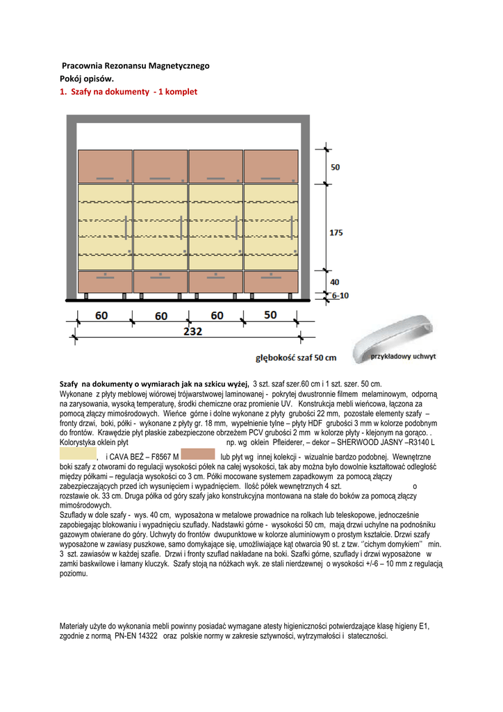 Pracownia Rezonansu Magnetycznego Pokój opisów. 1. Szafy na dokumenty - 1 komplet Szafy na dokumenty o wymiarach jak na szkicu wyżej, 3 szt. szaf szer.60 cm i 1 szt. szer. 50 cm. Wykonane z płyty meblowej wiórowej trójwarstwowej laminowanej - pokrytej dwustronnie filmem melaminowym, odporną na zarysowania, wysoką temperaturę, środki chemiczne oraz promienie UV. Konstrukcja mebli wieńcowa, łączona za pomocą złączy mimośrodowych. Wieńce górne i dolne wykonane z płyty grubości 22 mm, pozostałe elementy szafy – fronty drzwi, boki, półki - wykonane z płyty gr. 18 mm, wypełnienie tylne – płyty HDF grubości 3 mm w kolorze podobnym do frontów. Krawędzie płyt płaskie zabezpieczone obrzeżem PCV grubości 2 mm w kolorze płyty - klejonym na gorąco. . Kolorystyka oklein płyt np. wg oklein Pfleiderer, – dekor – SHERWOOD JASNY –R3140 L , i CAVA BEŻ – F8567 M lub płyt wg innej kolekcji - wizualnie bardzo podobnej. Wewnętrzne boki szafy z otworami do regulacji wysokości półek na całej wysokości, tak aby można było dowolnie kształtować odległość między półkami – regulacja wysokości co 3 cm. Półki mocowane systemem zapadkowym za pomocą złączy zabezpieczających przed ich wysunięciem i wypadnięciem. Ilość półek wewnętrznych 4 szt. o rozstawie ok. 33 cm. Druga półka od góry szafy jako konstrukcyjna montowana na stałe do boków za pomocą złączy mimośrodowych. Szuflady w dole szafy - wys. 40 cm, wyposażona w metalowe prowadnice na rolkach lub teleskopowe, jednocześnie zapobiegając blokowaniu i wypadnięciu szuflady. Nadstawki górne - wysokości 50 cm, mają drzwi uchylne na podnośniku gazowym otwierane do góry. Uchwyty do frontów dwupunktowe w kolorze aluminiowym o prostym kształcie. Drzwi szafy wyposażone w zawiasy puszkowe, samo domykające się, umożliwiające kąt otwarcia 90 st. z tzw. ‘’cichym domykiem’’ min. 3 szt. zawiasów w każdej szafie. Drzwi i fronty szuflad nakładane na boki. Szafki górne, szuflady i drzwi wyposażone w zamki baskwilowe i łamany kluczyk. Szafy stoją na nóżkach wyk. ze stali nierdzewnej o wysokości +/-6 – 10 mm z regulacją poziomu. Materiały użyte do wykonania mebli powinny posiadać wymagane atesty higieniczności potwierdzające klasę higieny E1, zgodnie z normą PN-EN 14322 oraz polskie normy w zakresie sztywności, wytrzymałości i stateczności. Pracownia Rezonansu Magnetycznego Pokój opisów 2. Szafy na dokumenty - 3 szt. Szafy na dokumenty o wymiarach jak na szkicu wyżej, 3 szt. szaf szer.60 cm i gł. 42 do 43 cm. Wykonane z płyty meblowej wiórowej trójwarstwowej laminowanej - pokrytej dwustronnie filmem melaminowym, odporną na zarysowania, wysoką temperaturę, środki chemiczne oraz promienie UV, . Konstrukcja mebli wieńcowa, łączona za pomocą złączy mimośrodowych. Wieńce górne i dolne wykonane z płyty grubości 22 mm, pozostałe elementy szafy – fronty drzwi, boki, półki - wykonane z płyty gr. 18 mm, wypełnienie tylne – płyta HDF grubości min.3 mm w kolorze podobnym do koloru frontów. Krawędzie płyt płaskie zabezpieczone obrzeżem PCV grubości 2 mm w kolorze płyty - klejonym na gorąco. Kolorystyka oklein płyt np. wg oklein firmy Pfleiderer, – dekor – SHERWOOD JASNY –R3140 L i CAVA BEŻ – F8567 M lub płyt wg innej kolekcji - wizualnie bardzo podobnej. Wewnętrzne boki szafy z otworami do regulacji wysokości półek na całej wysokości. Półki mocowane systemem zapadkowym za pomocą złączy zabezpieczających przed ich wysunięciem i wypadnięciem. Ilość półek wewnętrznych 4 szt. o rozstawie ok. 33 cm. Druga półka od góry szafy jako konstrukcyjna montowana na stałe do boków za pomocą złączy mimośrodowych. Szuflady w dole szafy - wys. 40 cm, wyposażona w metalowe prowadnice na rolkach lub teleskopowe, jednocześnie zapobiegając blokowaniu i wypadnięciu szuflady. Nadstawki górne - wysokości 50 cm, mają drzwi uchylne na podnośniku gazowym otwierane do góry. Uchwyty do frontów dwupunktowe w kolorze aluminiowym o prostym kształcie. Drzwi szafy wyposażone w zawiasy puszkowe, samo domykające się, umożliwiające kąt otwarcia 90 st. . z tzw. ‘’cichym domykiem’’ po 3 szt. zawiasów w każdej szafie. Drzwi i fronty szuflad nakładane na boki. Szafki górne, szuflady i drzwi wyposażone w zamki baskwilowe . Szafy stoją na nóżkach wyk. ze stali nierdzewnej o wysokości +/-6 – 10 mm z regulacją poziomu. Materiały użyte do wykonania mebli powinny posiadać wymagane atesty higieniczności potwierdzające klasę higieny E1, zgodnie z normą PN-EN 14322 oraz polskie normy w zakresie sztywności, wytrzymałości i stateczności. Pracownia Rezonansu Magnetycznego Pokój opisów 3. Stanowiska pracy 1 komplet Stanowiska pracy o wymiarach jak na rys. powyżej, wys.73,5 -74,5 cm. Blaty, ścianki boczne tzn. nogi płycinowe - wykonane są z płyty meblowej wiórowej trójwarstwowej laminowanej - pokrytej dwustronnie filmem melaminowym, odporną na zarysowania, wysoką temperaturę, środki chemiczne oraz promienie uv grubości 22 mm. , krawędzie oklejone na gorąco obrzeżem 2 mm z PCV. Osłona tylna wzmacniająca wykonana z płyty gr. 18 mm. Kolorystyka oklein płyty np. wg kolekcji kolorystyki oklein Pfleiderer, SHERWOOD JASNY R 3140 L, i CAVA BEŻ F 8567 M lub inny wizualnie bardzo podobny. W nogach płycinowych (boczne ścianki) zastosowano stopki ograniczające rysowanie podłóg, których regulowana wysokość pozwala zniwelować ew. nierówności podłogi. Kontener wyposażony w szufladę z zamkiem i szafkę. Wykonany jest z płyty wiórowej pokrytej dwustronnie melaminą, grubości 18 mm. krawędzie oklejone na gorąco obrzeżem 2 mm z PCV. Kolorystyka oklein płyty np. wg kolekcji kolorystyki oklei Pfleiderer, CAVA BEŻ F 8567 M w całości. Szuflada wyposażona w metalowe prowadnice na rolkach zapobiegając blokowaniu się szuflady. Szuflada i drzwi kontenera wyposażone w met