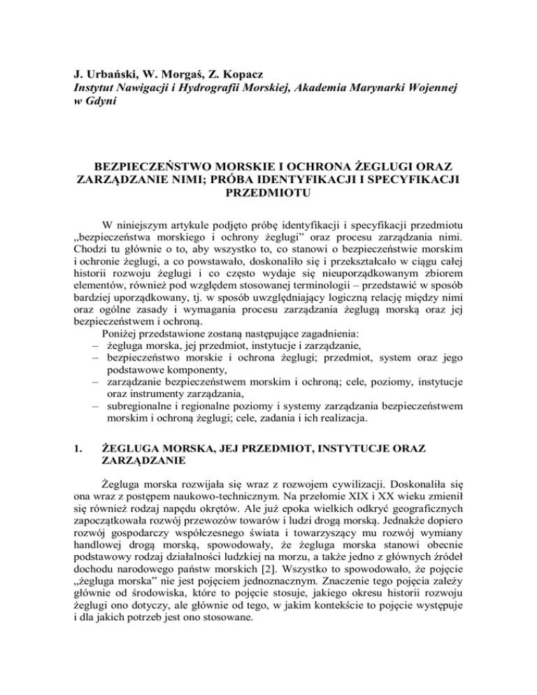 J. Urbański, W. Morgaś, Z. Kopacz Instytut Nawigacji i Hydrografii Morskiej, Akademia Marynarki Wojennej w Gdyni BEZPIECZEŃSTWO MORSKIE I OCHRONA ŻEGLUGI ORAZ ZARZĄDZANIE NIMI; PRÓBA IDENTYFIKACJI I SPECYFIKACJI PRZEDMIOTU W niniejszym artykule podjęto próbę identyfikacji i specyfikacji przedmiotu „bezpieczeństwa morskiego i ochrony żeglugi” oraz procesu zarządzania nimi. Chodzi tu głównie o to, aby wszystko to, co stanowi o bezpieczeństwie morskim i ochronie żeglugi, a co powstawało, doskonaliło się i przekształcało w ciągu całej historii rozwoju żeglugi i co często wydaje się nieuporządkowanym zbiorem elementów, również pod względem stosowanej terminologii – przedstawić w sposób bardziej uporządkowany, tj. w sposób uwzględniający logiczną relację między nimi oraz ogólne zasady i wymagania procesu zarządzania żeglugą morską oraz jej bezpieczeństwem i ochroną. Poniżej przedstawione zostaną następujące zagadnienia: – żegluga morska, jej przedmiot, instytucje i zarządzanie, – bezpieczeństwo morskie i ochrona żeglugi; przedmiot, system oraz jego podstawowe komponenty, – zarządzanie bezpieczeństwem morskim i ochroną; cele, poziomy, instytucje oraz instrumenty zarządzania, – subregionalne i regionalne poziomy i systemy zarządzania bezpieczeństwem morskim i ochroną żeglugi; cele, zadania i ich realizacja. 1. ŻEGLUGA MORSKA, JEJ PRZEDMIOT, INSTYTUCJE ORAZ ZARZĄDZANIE Żegluga morska rozwijała się wraz z rozwojem cywilizacji. Doskonaliła się ona wraz z postępem naukowo-technicznym. Na przełomie XIX i XX wieku zmienił się również rodzaj napędu okrętów. Ale już epoka wielkich odkryć geograficznych zapoczątkowała rozwój przewozów towarów i ludzi drogą morską. Jednakże dopiero rozwój gospodarczy współczesnego świata i towarzyszący mu rozwój wymiany handlowej drogą morską, spowodowały, że żegluga morska stanowi obecnie podstawowy rodzaj działalności ludzkiej na morzu, a także jedno z głównych źródeł dochodu narodowego państw morskich [2]. Wszystko to spowodowało, że pojęcie „żegluga morska” nie jest pojęciem jednoznacznym. Znaczenie tego pojęcia zależy głównie od środowiska, które to pojęcie stosuje, jakiego okresu historii rozwoju żeglugi ono dotyczy, ale głównie od tego, w jakim kontekście to pojęcie występuje i dla jakich potrzeb jest ono stosowane. W niniejszym artykule przyjęto, że pojęcie „żegluga morska” jest stosowane w takim znaczeniu, w jakim jest obecnie stosowane przez środowisko ludzi związanych bezpośrednio z żeglugą morską, tj. w znaczeniu, który odpowiada współczesnemu poziomowi rozwoju żeglugi i uwzględnia również stan współczesnych zagrożeń dla żeglugi, łącznie z zagrożeniem ze strony światowego terroryzmu. Tak, więc pod pojęciem „żegluga morska” rozumieć będziemy te rodzaje działalności, które stanowią przedmiot żeglugi morskiej. Zostały one przedstawione w tabeli 1. Tabela 1. Rodzaje działalności ludzkiej stanowiące przedmiot żeglugi morskiej. Lp. Rodzaj działalności 1 Przewóz towarów i ludzi drogą morską 2 Obsługa portowa przewozów morskich 3 Działalność zapewniająca bezpieczeństwo morskie i ochronę żeglugi Biorąc pod uwagę powyższe rodzaje działalności ludzkiej, można wnioskować, że podstawowe instytucje tworzące infrastrukturę żeglugi morskiej są to następujące instytucje (Tabela 2): Tabela 2. Podstawowe rodzaje instytucji żeglugi morskiej. Lp. Rodzaje instytucji 1 Przedsiębiorstwa przewozu towarów i ludzi, łącznie z przedsiębiorstwami turystyki morskiej 2 Porty i przystanie morskie 3 Instytucje służb morskich państwa Wymienione w tabeli 2 instytucje służb morskich państwa, to instytucje zapewniające bezpieczeństwo i ochronę żeglugi. Są to zarówno specjalne morskie służby państwowe, jak służba poszukiwania i ratownictwa SAR, służba hydrograficzna, itp., ale też upoważnione i zobowiązane przez państwo do świadczenia określonych rodzajów usług, przedsiębiorstwa będące spółkami w znaczeniu Kodeksu spółek handlowych, jak PRS, PRO, itp. Biorąc powyższe pod uwagę, w tabeli 3 zostały przedstawione instytucje służb morskich bezpieczeństwa i ochrony żeglugi, które nazywać będziemy „służbami morskimi” lub „operacyjnymi służbami morskimi”. Tabela 3. Podstawowe służby morskie bezpieczeństwa i ochrony żeglugi. Lp. Rodzaj służby morskiej 1 Administracja morska (kontrola państwa portu, państwa bandery, certyfikacja, kwalifikacje załóg, itp.) 2 Służba infrastruktury nawigacyjnej 3 Służba hydrograficzna 4 Służby informacji bezpieczeństwa morskiego i alarmowania na morzu 5 Służba ratownictwa morskiego SAR 6 Służby zwalczania zanieczyszczeń środowiska morskiego 7 Służby (Systemy) Zarządzania Ruchem Statków (VTMS) 8 Służby (System) Monitoringu Ruchu Statków i Informacji (VTMIS) 9 Służby technicznego nadzoru i inspekcji statków (PRS) 10 Służby ratownictwa okrętowego (PRO) i inne „Zarządzanie” to działanie polegające na powodowaniu funkcjonowania rzeczy, osób, organizacji systemów, rodzajów działalności, itp., podległych zarządzającemu zgodnie z wytyczonym przez niego celem [9]. Istotą funkcji zarządzania jest: – formułowanie celu działań, – planowanie niezbędnych działań, – pozyskiwanie i rozmieszczanie niezbędnych zasobów, – kontrolowanie realizacji. Powyższe etapy procesu zarządzania, są również definiowane następująco: – planowanie, – organizowanie, – kierowanie, – koordynowanie, – kontrolowanie. Biorąc pod uwagę rodzaje instytucji przedstawionych w tabeli 2 oraz w tabeli 3, można wnioskować, że rządzenie żeglugą morską obejmuje trzy rodzaje zarządzania, a mianowicie: – zarządzanie instytucjami gospodarczymi, tj. zarządzanie przedsiębiorstwami, – zarządzanie służbami państwowymi, – zarządzanie zbiorem instyt