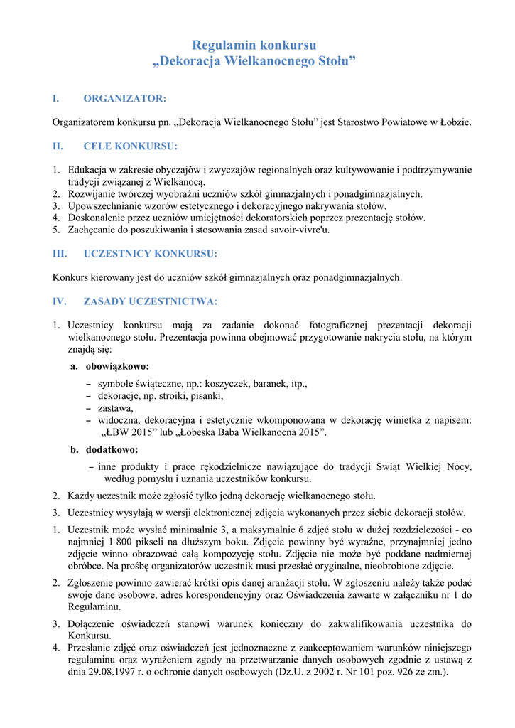 Regulamin konkursu „Dekoracja Wielkanocnego Stołu” I. ORGANIZATOR: Organizatorem konkursu pn. „Dekoracja Wielkanocnego Stołu” jest Starostwo Powiatowe w Łobzie. II. CELE KONKURSU: 1. Edukacja w zakresie obyczajów i zwyczajów regionalnych oraz kultywowanie i podtrzymywanie tradycji związanej z Wielkanocą. 2. Rozwijanie twórczej wyobraźni uczniów szkół gimnazjalnych i ponadgimnazjalnych. 3. Upowszechnianie wzorów estetycznego i dekoracyjnego nakrywania stołów. 4. Doskonalenie przez uczniów umiejętności dekoratorskich poprzez prezentację stołów. 5. Zachęcanie do poszukiwania i stosowania zasad savoir-vivre'u. III. UCZESTNICY KONKURSU: Konkurs kierowany jest do uczniów szkół gimnazjalnych oraz ponadgimnazjalnych. IV. ZASADY UCZESTNICTWA: 1. Uczestnicy konkursu mają za zadanie dokonać fotograficznej prezentacji dekoracji wielkanocnego stołu. Prezentacja powinna obejmować przygotowanie nakrycia stołu, na którym znajdą się: a. obowiązkowo: – – – – symbole świąteczne, np.: koszyczek, baranek, itp., dekoracje, np. stroiki, pisanki, zastawa, widoczna, dekoracyjna i estetycznie wkomponowana w dekorację winietka z napisem: „ŁBW 2015” lub „Łobeska Baba Wielkanocna 2015”. b. dodatkowo: – inne produkty i prace rękodzielnicze nawiązujące do tradycji Świąt Wielkiej Nocy, według pomysłu i uznania uczestników konkursu. 2. Każdy uczestnik może zgłosić tylko jedną dekorację wielkanocnego stołu. 3. Uczestnicy wysyłają w wersji elektronicznej zdjęcia wykonanych przez siebie dekoracji stołów. 1. Uczestnik może wysłać minimalnie 3, a maksymalnie 6 zdjęć stołu w dużej rozdzielczości - co najmniej 1 800 pikseli na dłuższym boku. Zdjęcia powinny być wyraźne, przynajmniej jedno zdjęcie winno obrazować całą kompozycję stołu. Zdjęcie nie może być poddane nadmiernej obróbce. Na prośbę organizatorów uczestnik musi przesłać oryginalne, nieobrobione zdjęcie. 2. Zgłoszenie powinno zawierać krótki opis danej aranżacji stołu. W zgłoszeniu należy także podać swoje dane osobowe, adres korespondencyjny oraz Oświadczenia zawarte w załączniku nr 1 do Regulaminu. 3. Dołączenie oświadczeń stanowi warunek konieczny do zakwalifikowania uczestnika do Konkursu. 4. Przesłanie zdjęć oraz oświadczeń jest jednoznaczne z zaakceptowaniem warunków niniejszego regulaminu oraz wyrażeniem zgody na przetwarzanie danych osobowych zgodnie z ustawą z dnia 29.08.1997 r. o ochronie danych osobowych (Dz.U. z 2002 r. Nr 101 poz. 926 ze zm.). V. CZAS TRWANIA KONKURSU 1. Konkurs zostaje ogłoszony w dniu marca 5 marca 2015 r. 2. Zgłoszenia należy przesyłać 20 marca 2015 roku na adres: [email protected], z dopiskiem: Konkurs „Dekoracja Wielkanocnego Stołu”. 3. Prace konkursowe niespełniające wymagań, o których mowa w Regulaminie konkursu lub nadesłane po upływie terminu, nie będą podlegały ocenie jury. 4. Rozstrzygnięcie konkursu i wręczenie nagród nastąpi w czasie XI jarmarku „Łobeska Baba Wielkanocna” w Łobzie – 29 marca 2015 r. VI. OCENA ORAZ NAGRODY 1. Najlepsze zdjęcia przedstawiające dekorację stołu wielkanocnego zostaną wybrane i ocenione przez Komisję Konkursową powołaną przez Starostę Łobeskiego: Oceniane będą następujące elementy: prawidłowy dobór zastawy stołowej, ułożenie zastawy zgodnie z przyjętymi zasadami, zgodność z tematyką i wytycznymi konkursu, wykorzystanie symboli świątecznych, pomysłowość i oryginalność przy zastosowaniu elementów dekoracyjnych na stole, elegancja i estetyka stołu. 2. Komisja Konkursowa przyzna nagrody trzem autorom najlepszych „Dekoracji Wielkanocnego Stołu”. 3. Autorzy prac nagrodzonych zostaną powiadomieni telefonicznie lub pocztą elektroniczną o godzinie i miejscu podsumowania konkursu. VII. DODATKOWE INFORMACJE 1. Informacji na temat konkursu udzielają pracownicy Wydziału Oświaty i Promocji Starostwa Powiatowego w Łobzie; tel. 91 397 60 97; e-mail: [email protected] 2. Regulamin konkursu oraz jego wyniki zostaną podane do publicznej wiadomości na stronie internetowej Starostwa Powiatowego w Łobzie oraz na Facebooku – Profilu Łobeskiej Baby Wielkanocnej.